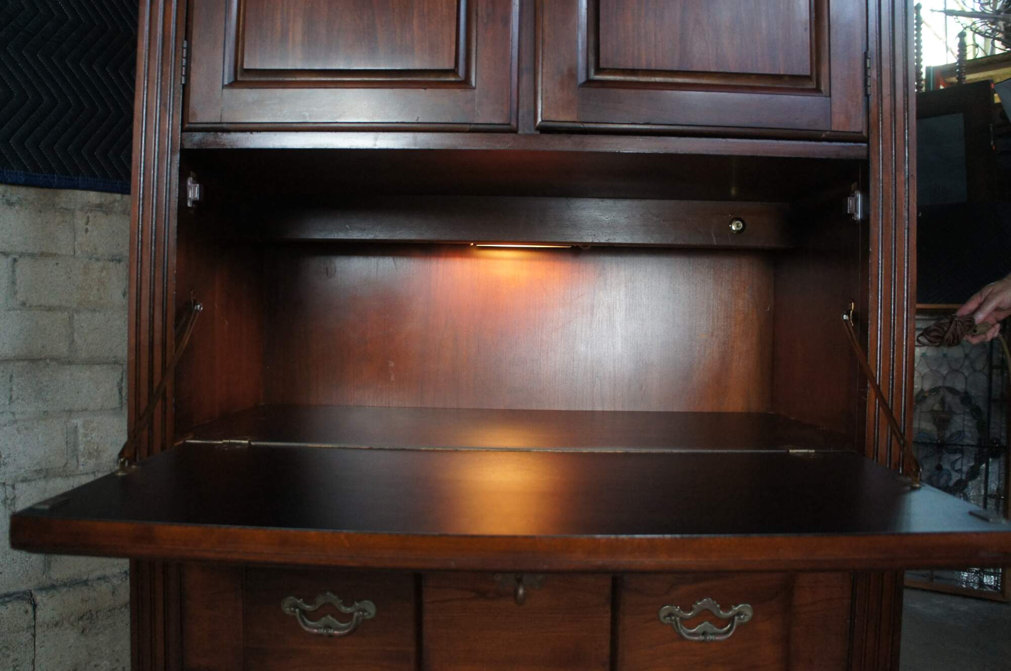 Traditional Thomasville blockfront secretary bookcase or dry bar, circa last quarter 20th century. Made from cherry with an illuminated laminate drop front work surface over three lower dovetailed drawers with brass hardware. Upper bookcase opens to two interior shelves. Features fluted stiles and an open pediment crown with dentil molding. Marked along backside 10131-825 01 27