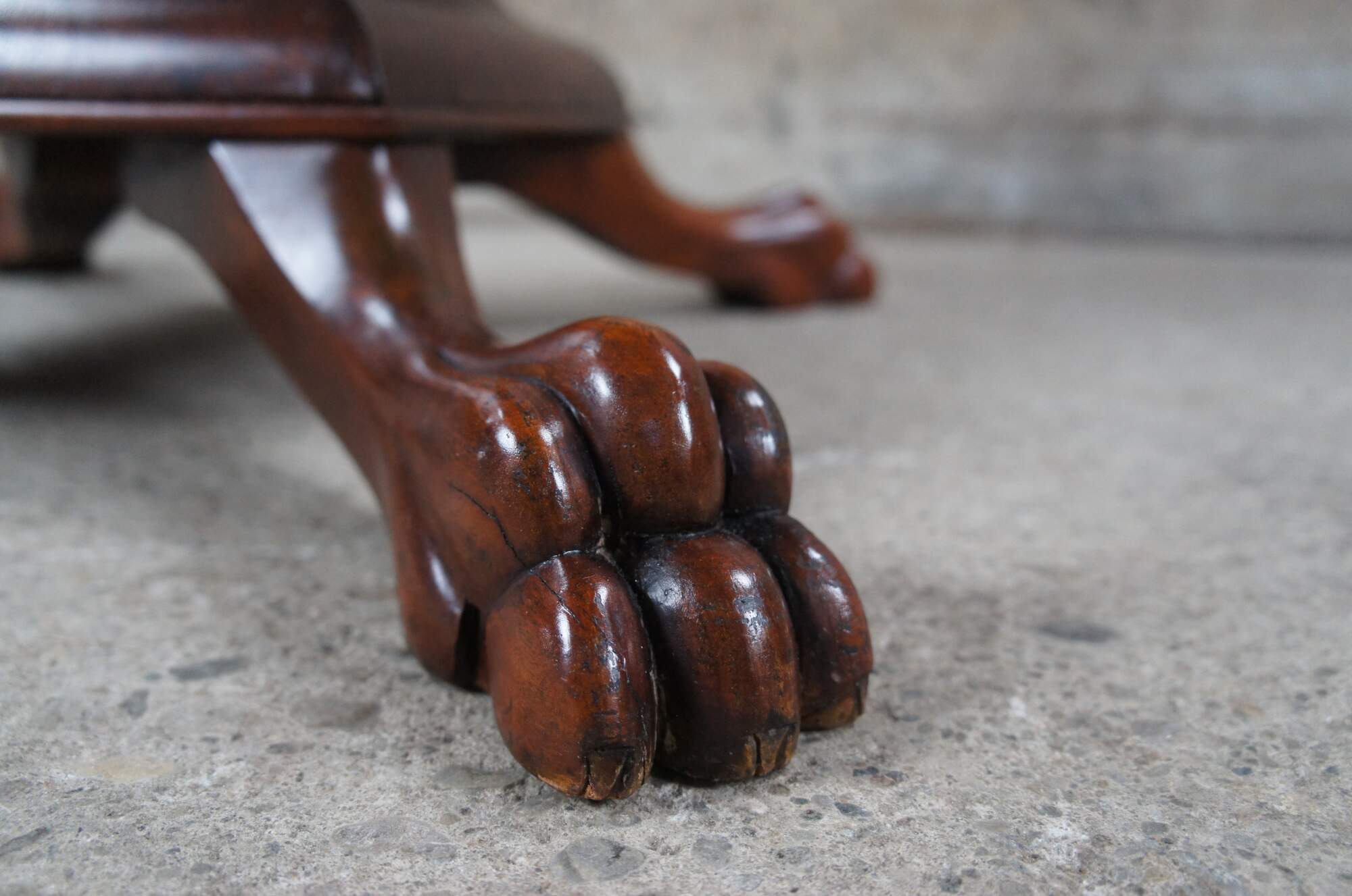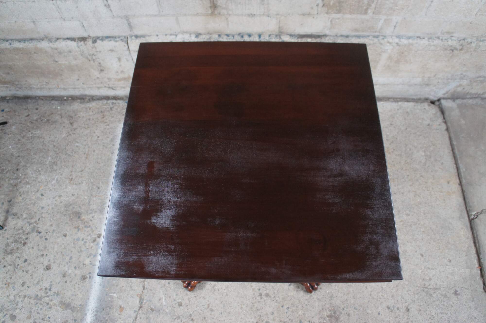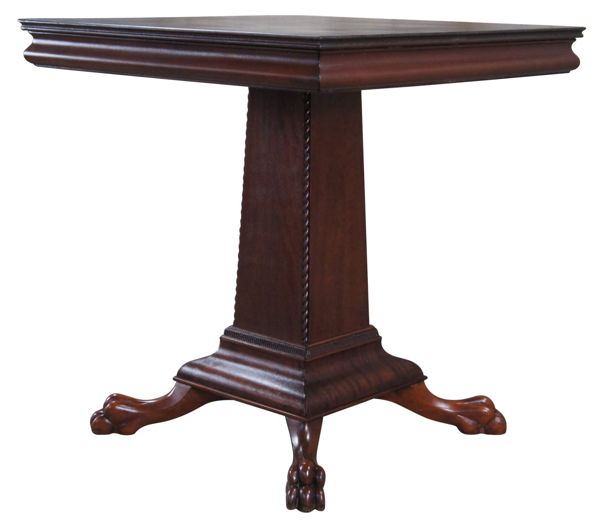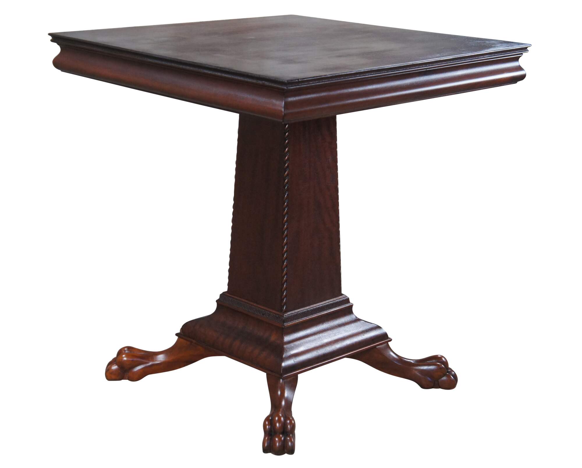 Antique American Empire mahogany game table featuring square form with a tapered pedestal, large carved claw feet, serpentine edge and twisted / fluted accents.