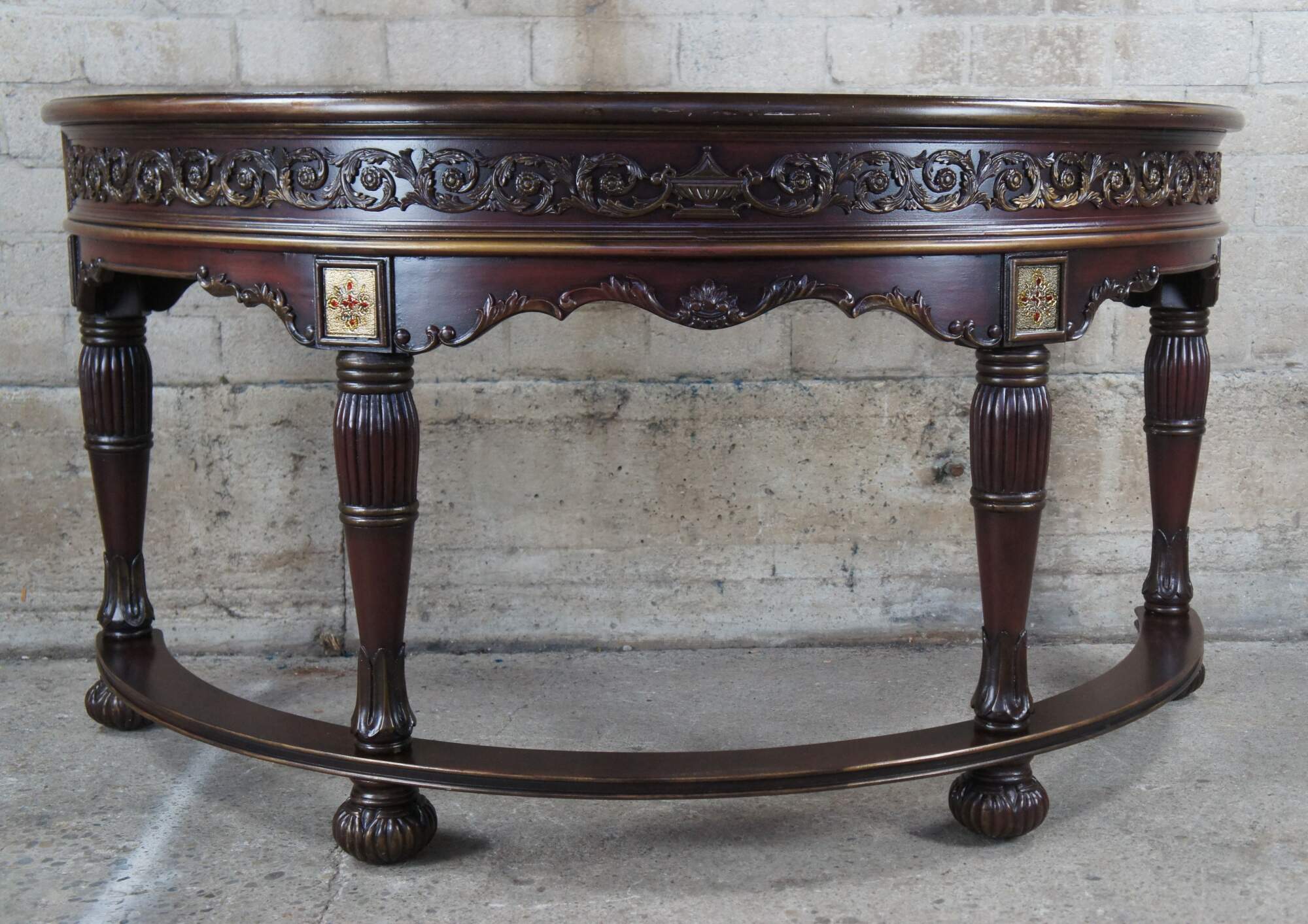 Vintage demilune writing or library desk featuring half round form with scrolled acanthus accents, three inset bevelled glass panels and three drawers.