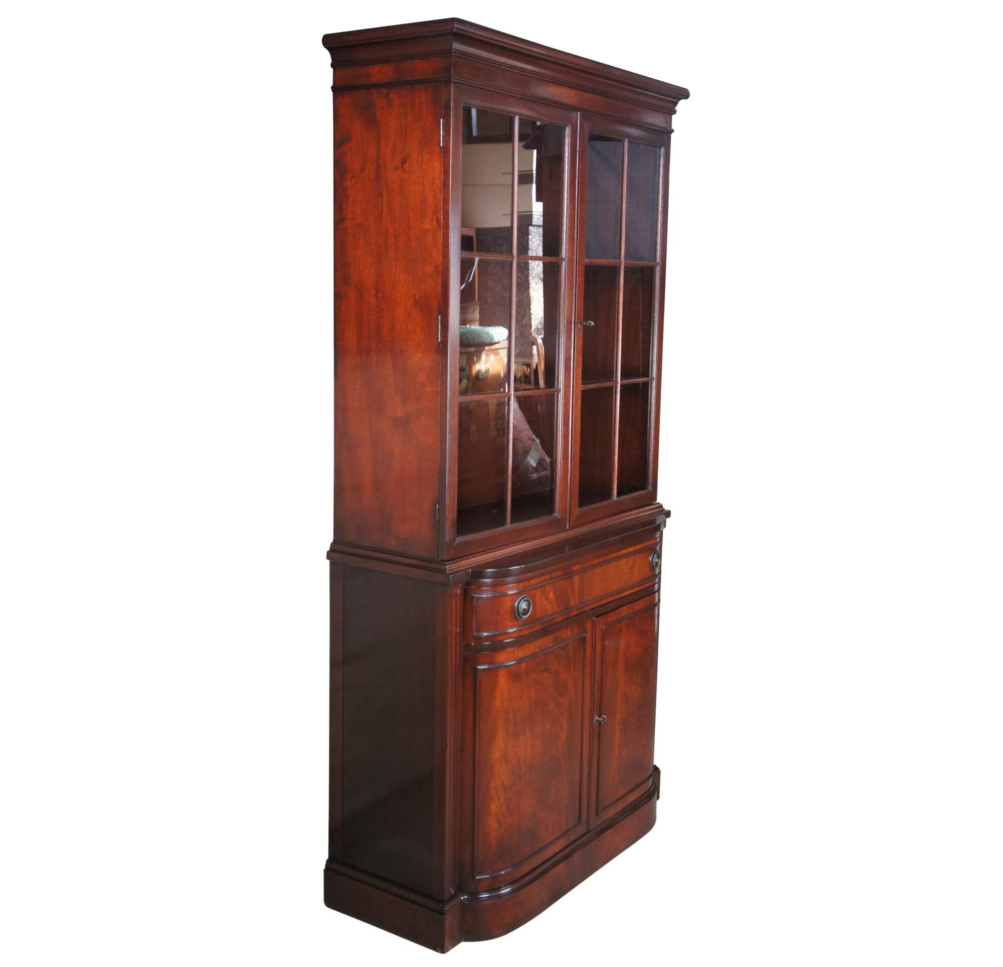 Vintage Drexel Georgian Style Bowfront china cabinet or cupboard, circa 1940s. Made of genuine mahogany featuring three upper shelves with plate grooves, over one drawer, and a lower cabinet. Lower cabinet and drawer fronts have a rich crotch / flame mahogany. No 4081.