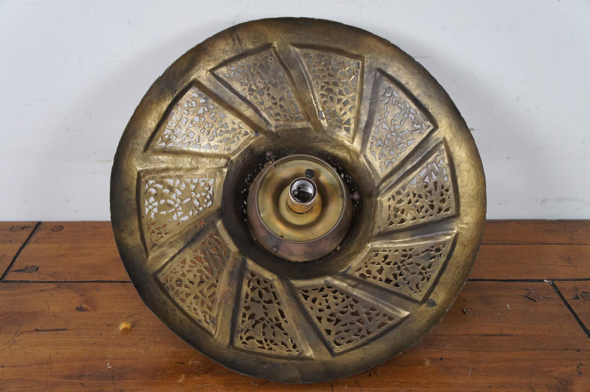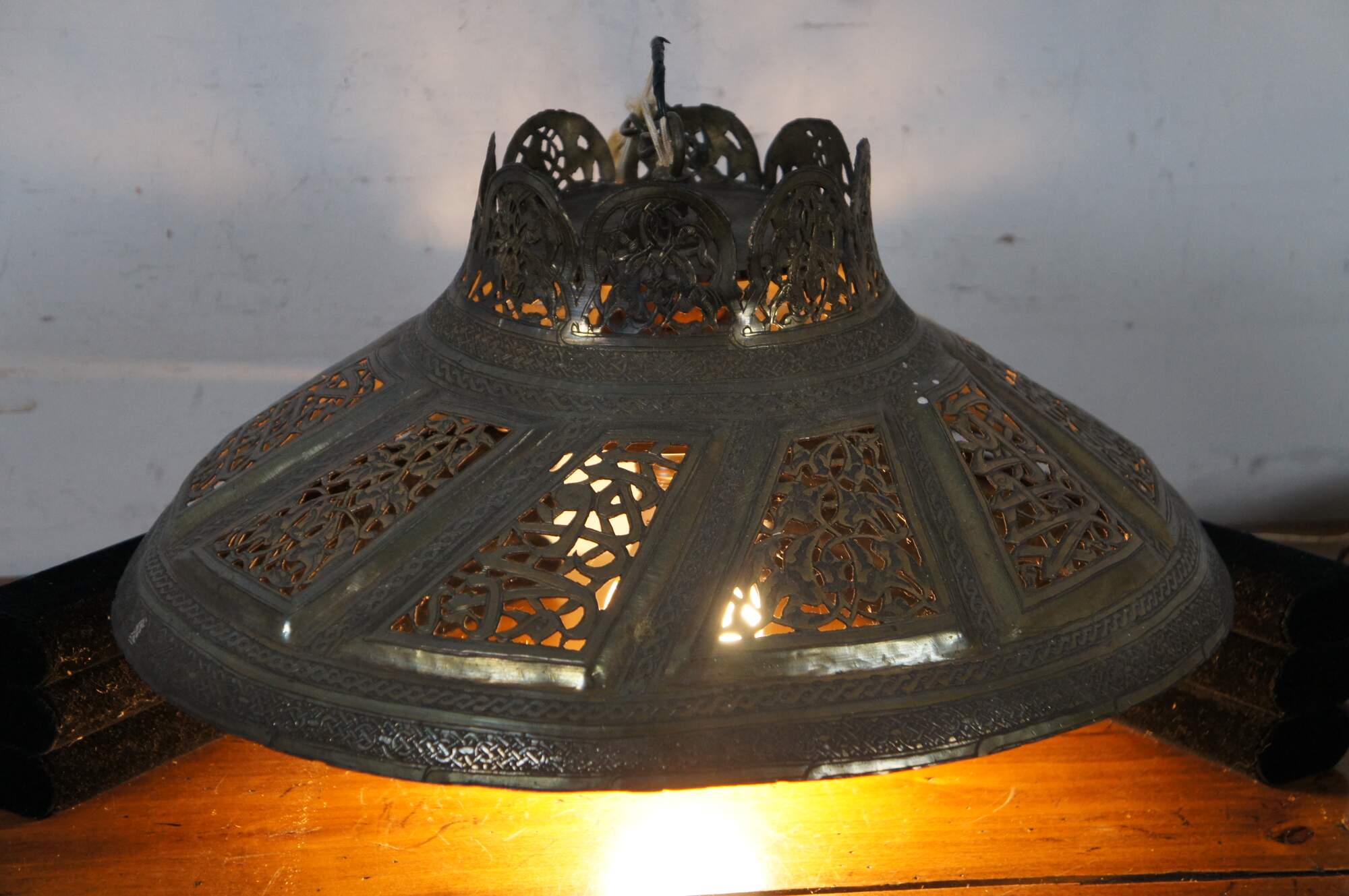 Vintage pierced brass chandelier / pendant / ceiling / swag light or shade, featuring Turkish or Moroccan styling with pierced panels and scalloped top with a floral / foliate design, edged in Celtic style knot work.
