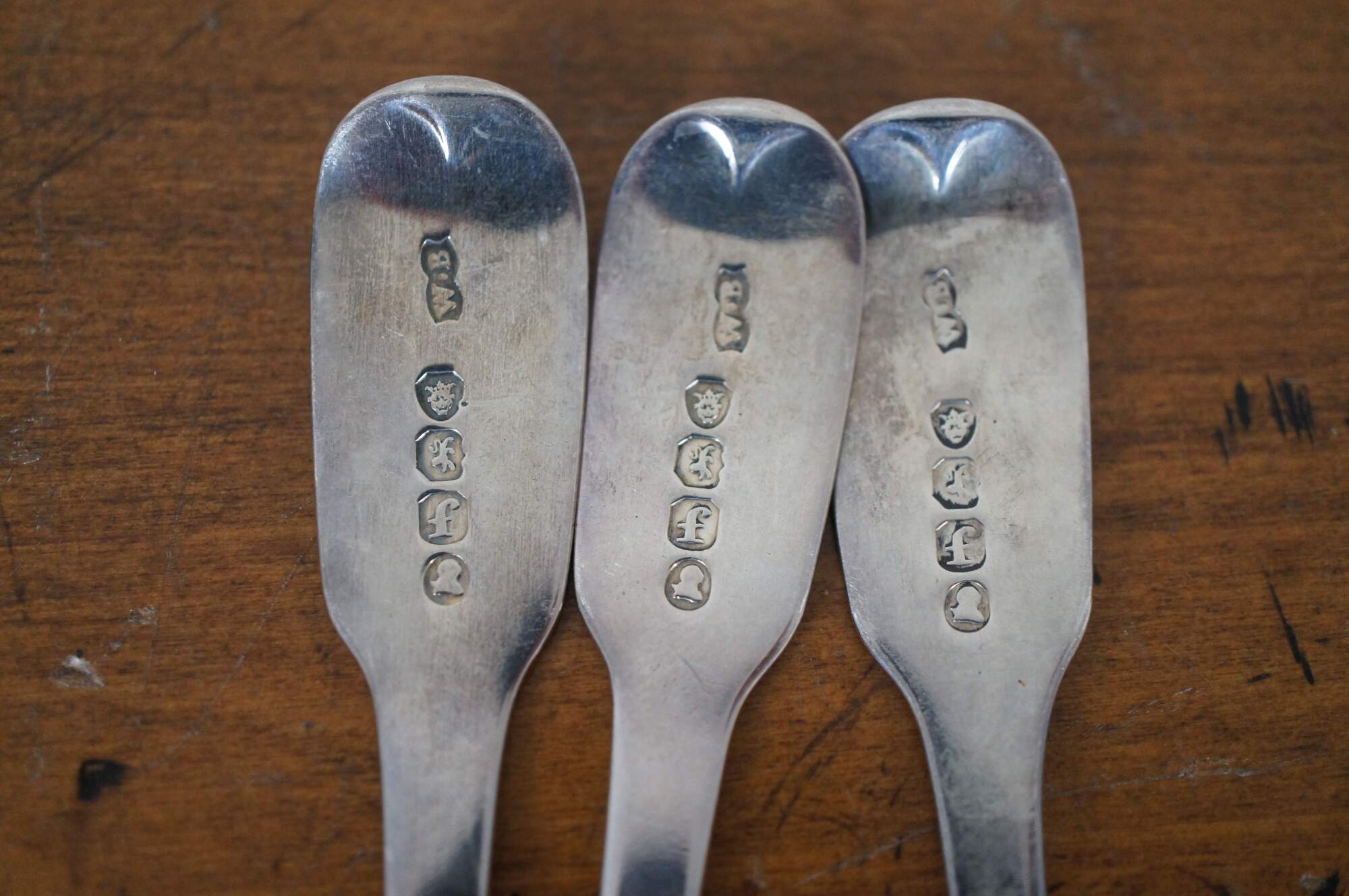 Set of three antique early 19th century sterling silver teaspoons with tipped fiddle shaped handles, engraved with the head of a sea serpent or dragon; made in 1821 by William Bateman I of London.