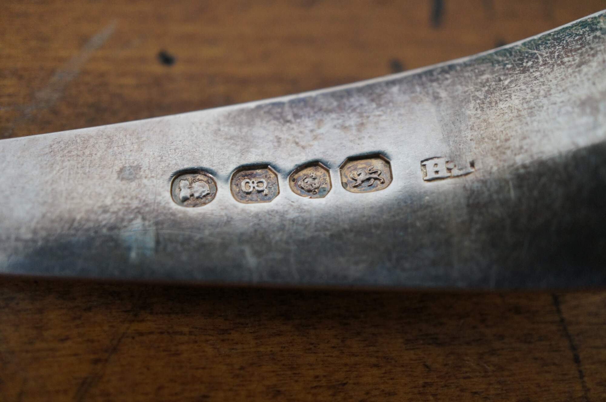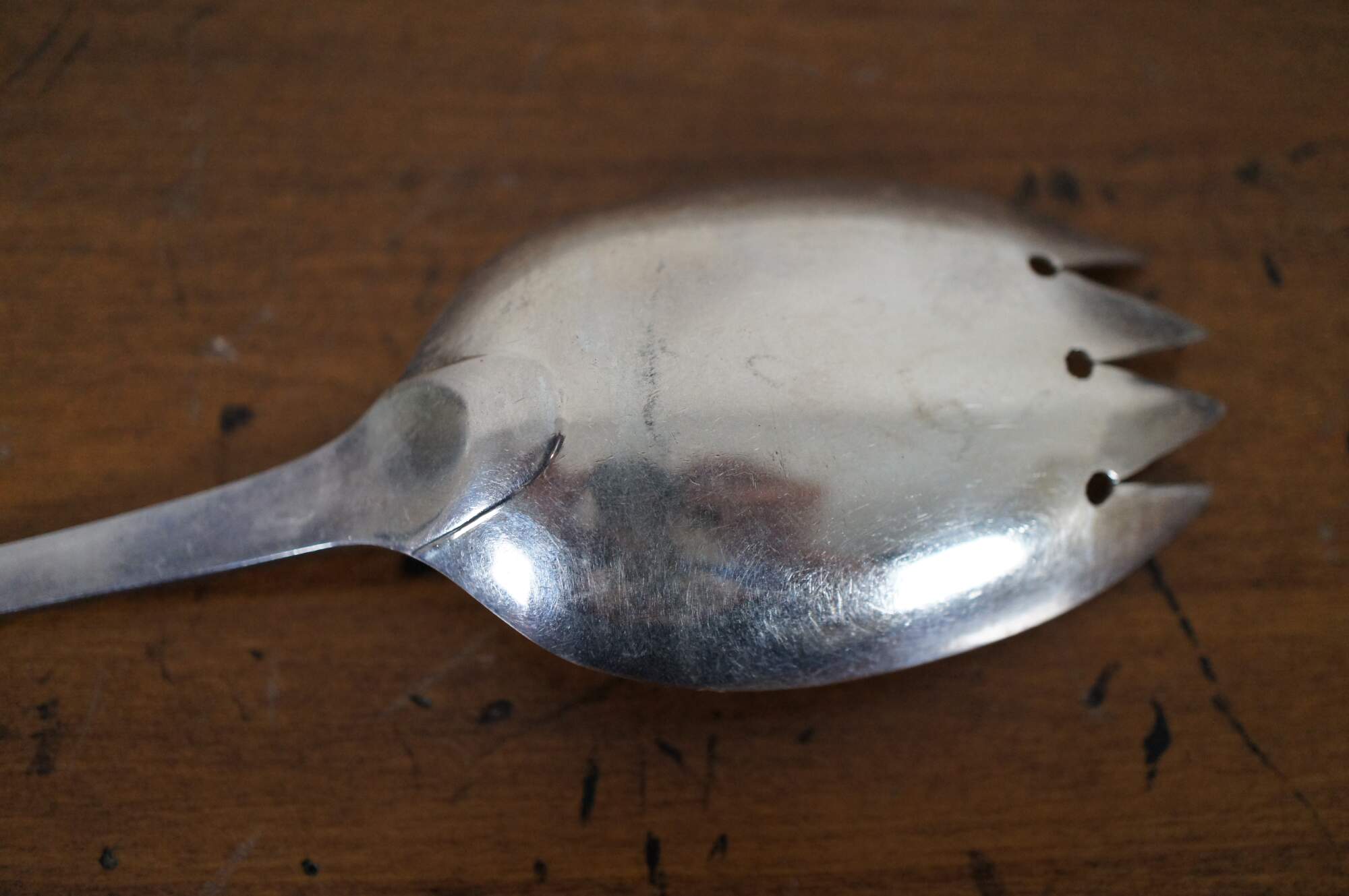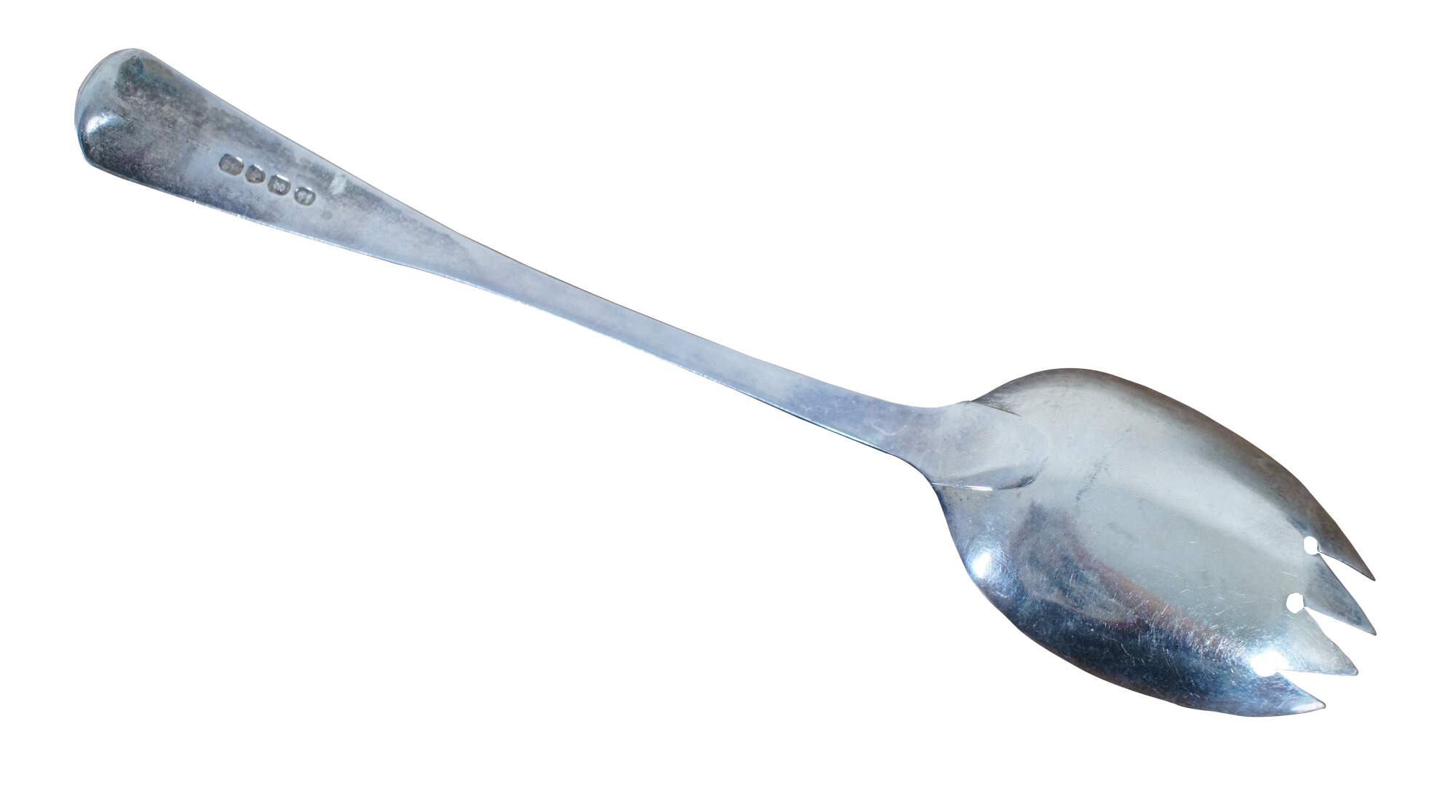 Antique English Georgian sterling silver “spork” shaped serving spoon or salad tosser tong. Attributed to H-H (Henry Holland) or H-J Henry Jeffreys, circa 1780s - 1830s, London England silversmiths.