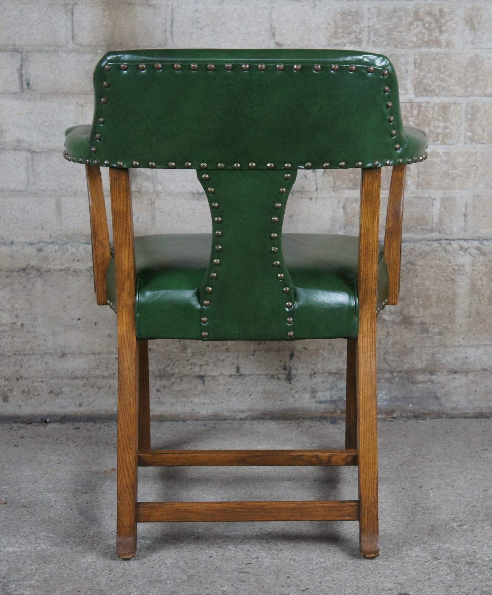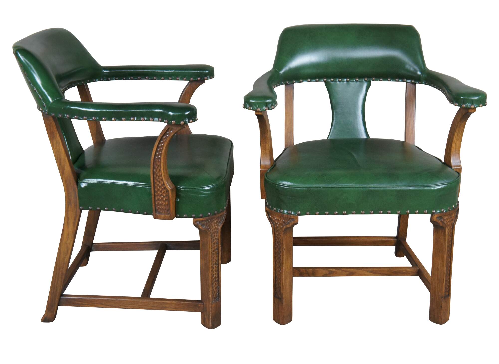 4 Romweber (R-14332) Viking Oak Bank Chairs in Nordic Finish, circa 1974. Features a carved oak frame upholstered in green leather with a barrel back and padded arms with nail head trim. An iconic set from the mid century era.