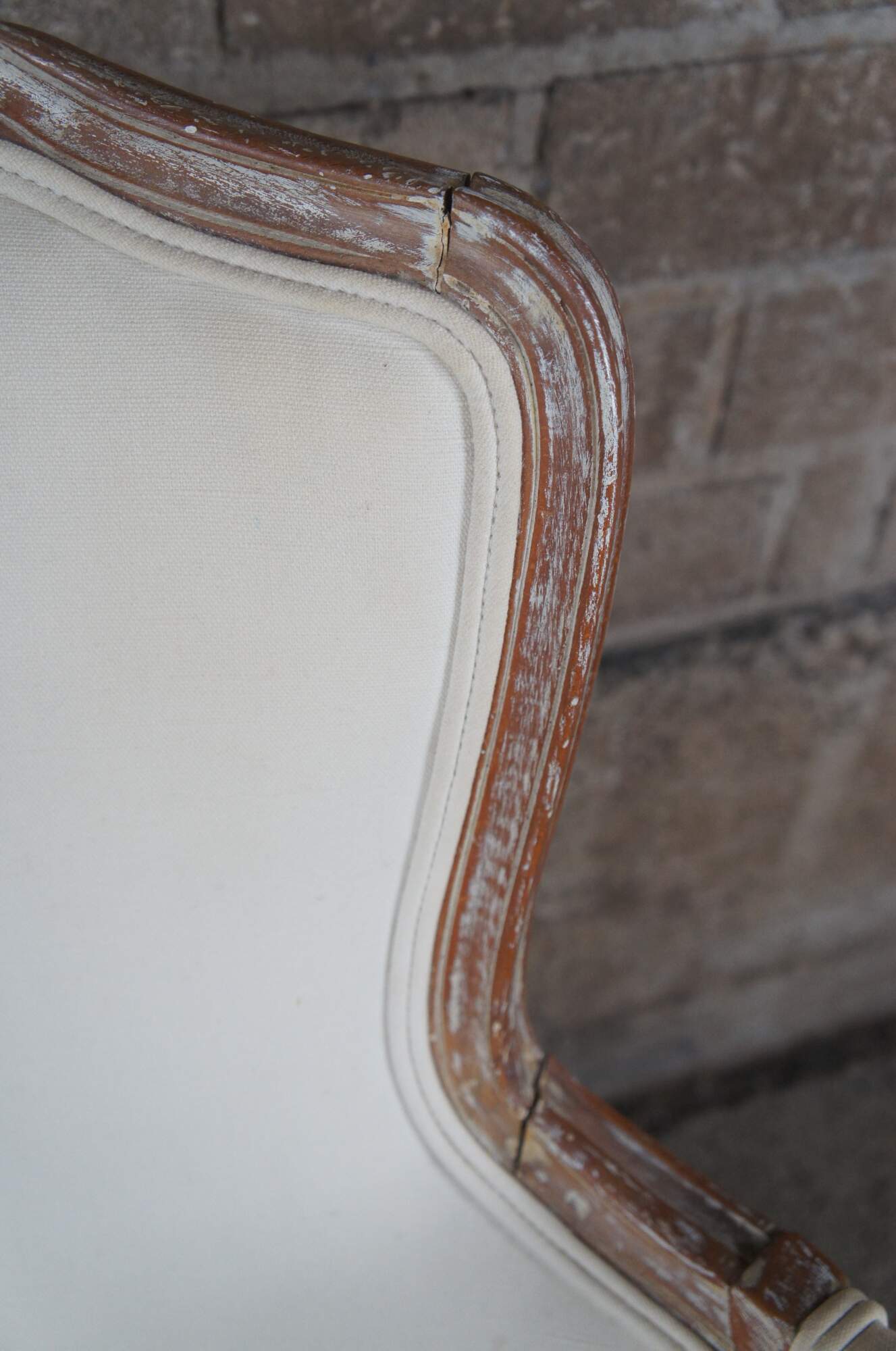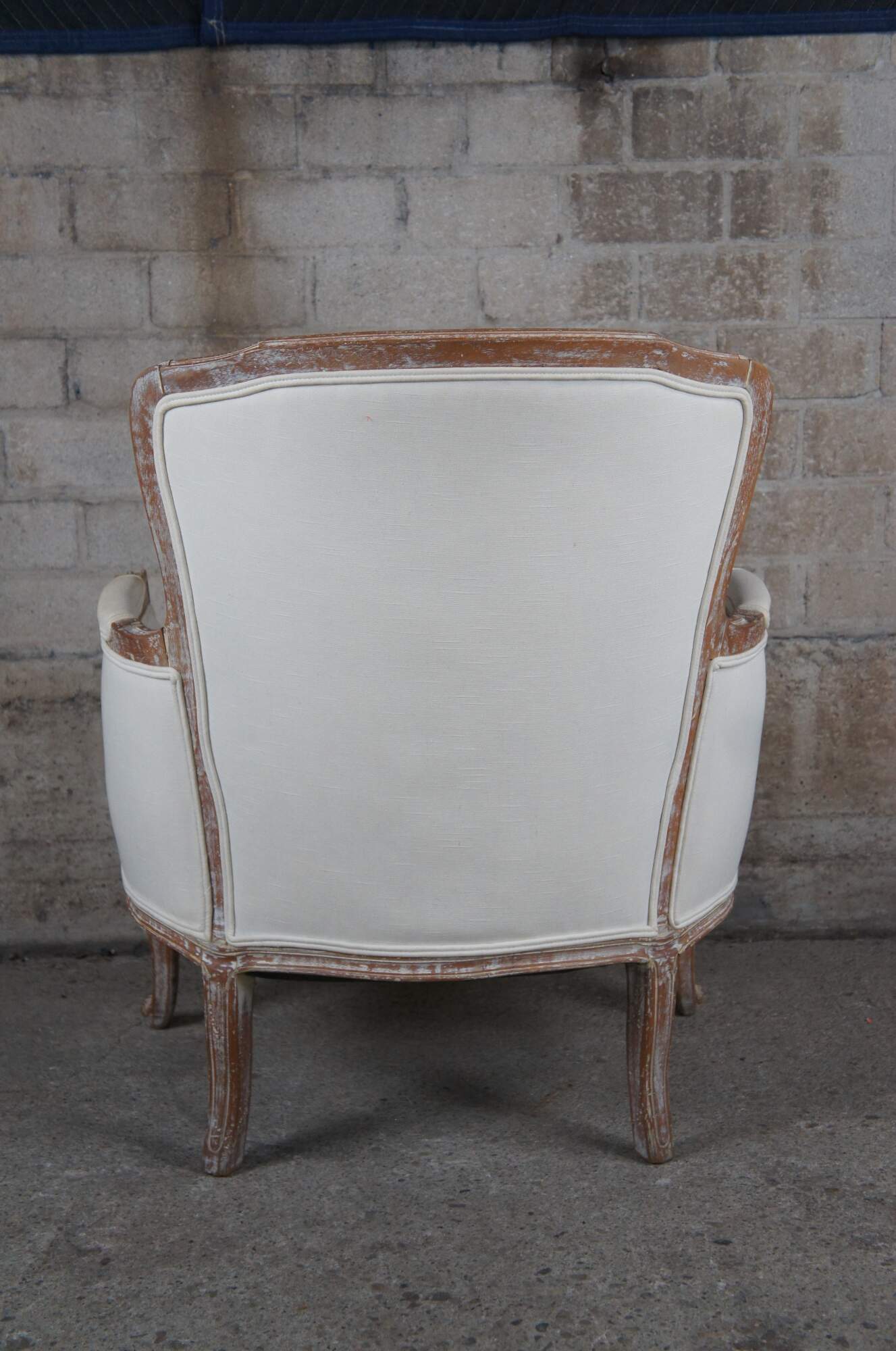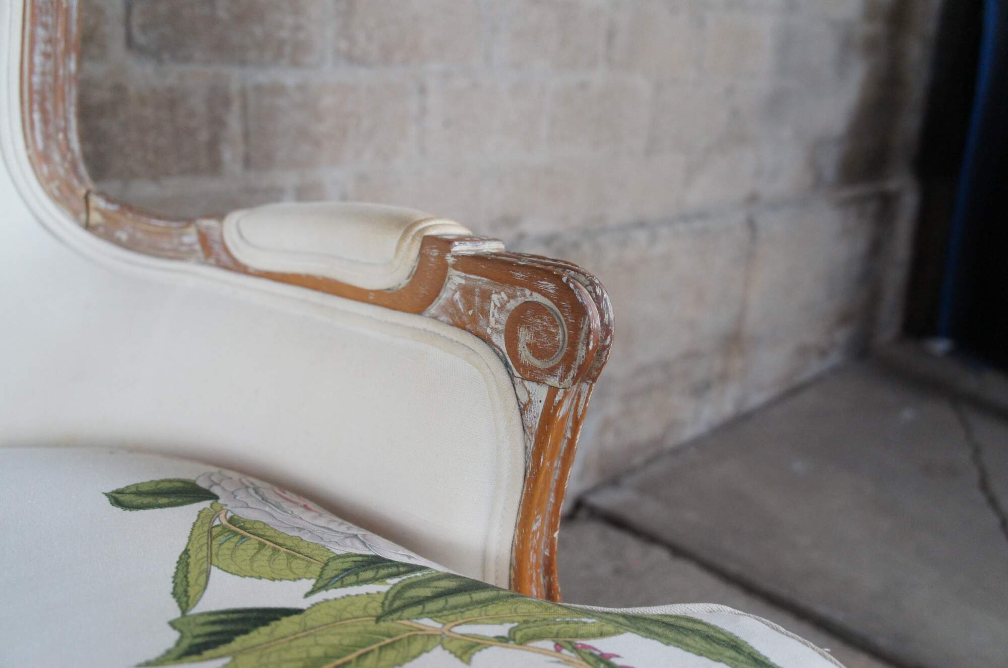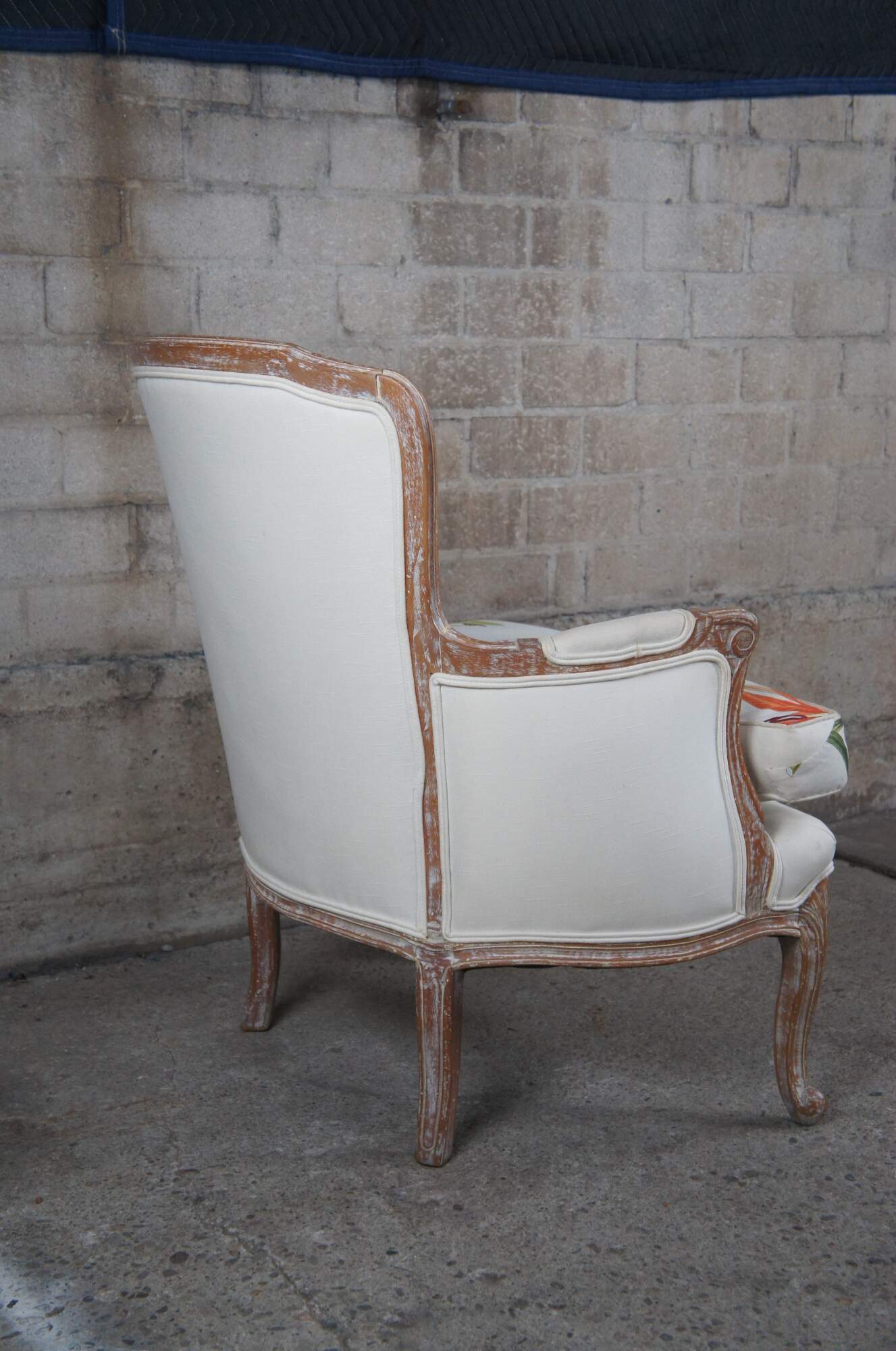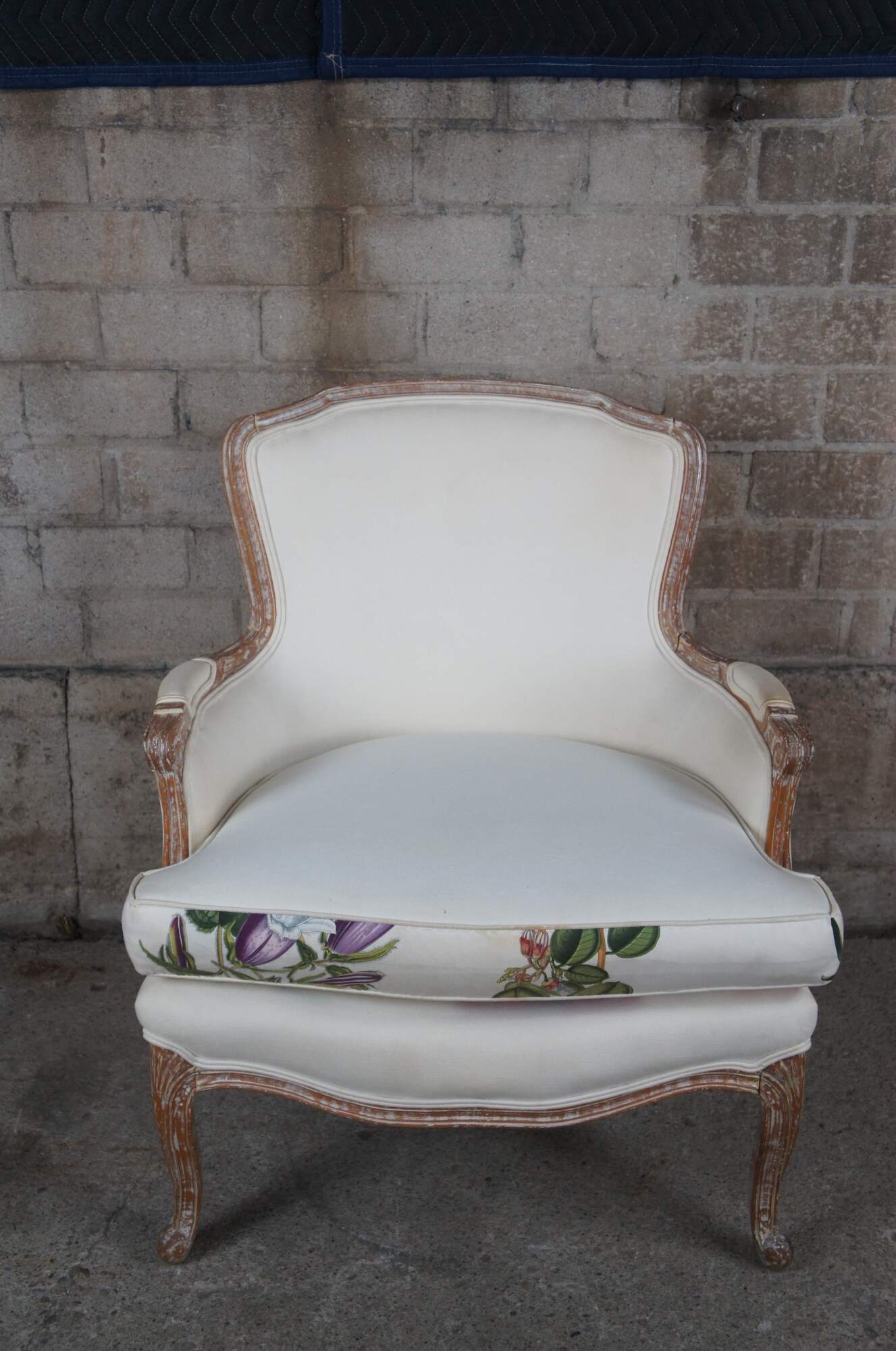 White washed oak bergere chair. Features a natural frame with scrolled and padded arms, botanical upholstered cushion and cabriole legs scalloped at the knees.