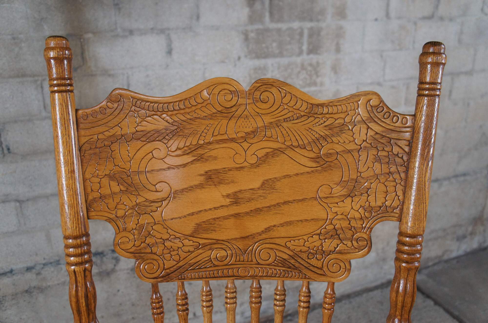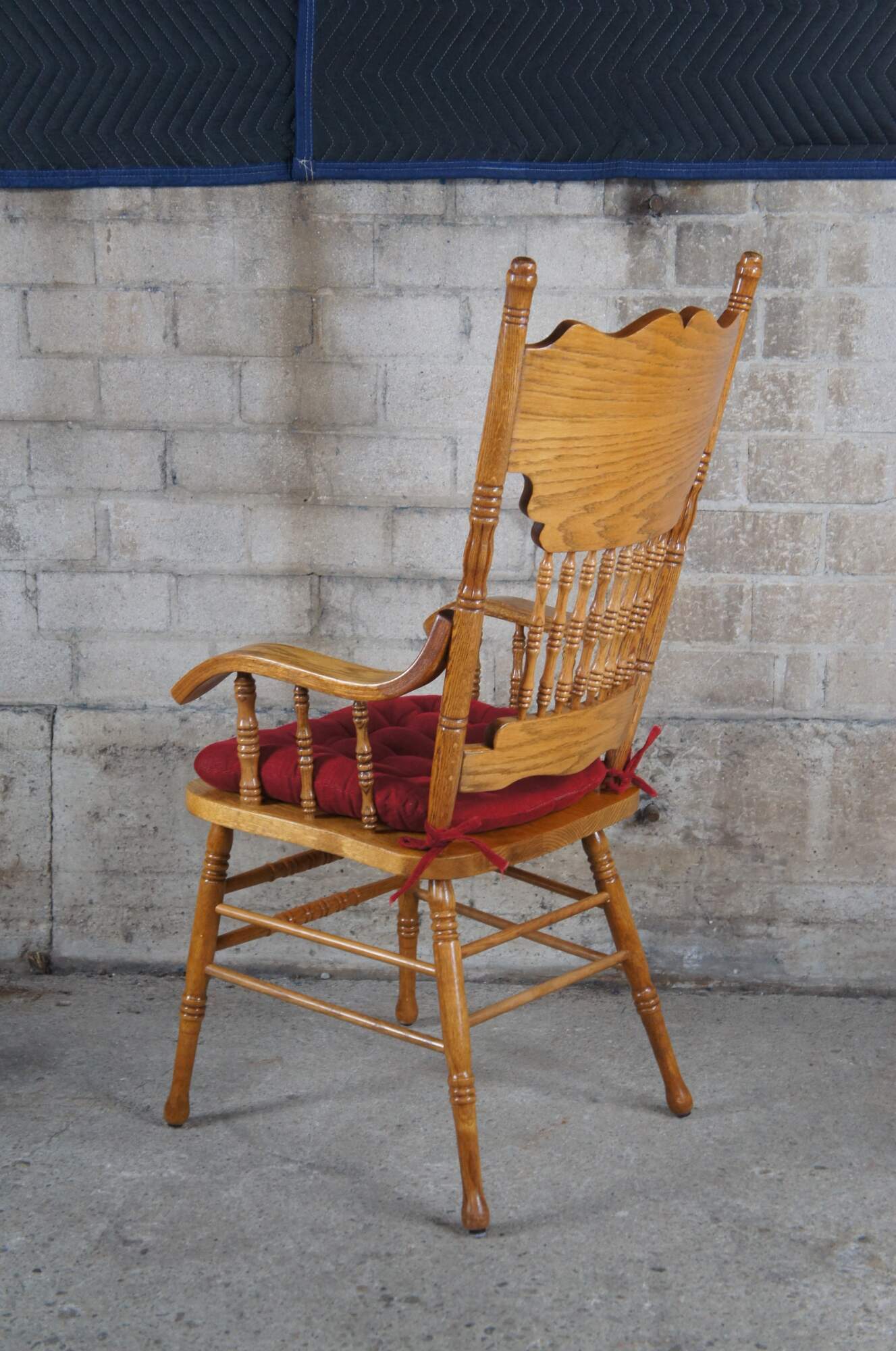 Late 20th century Victorian Revival arm chairs. Features a double pressback with spindled accents, sloped arms and a removable red upholstered seat.