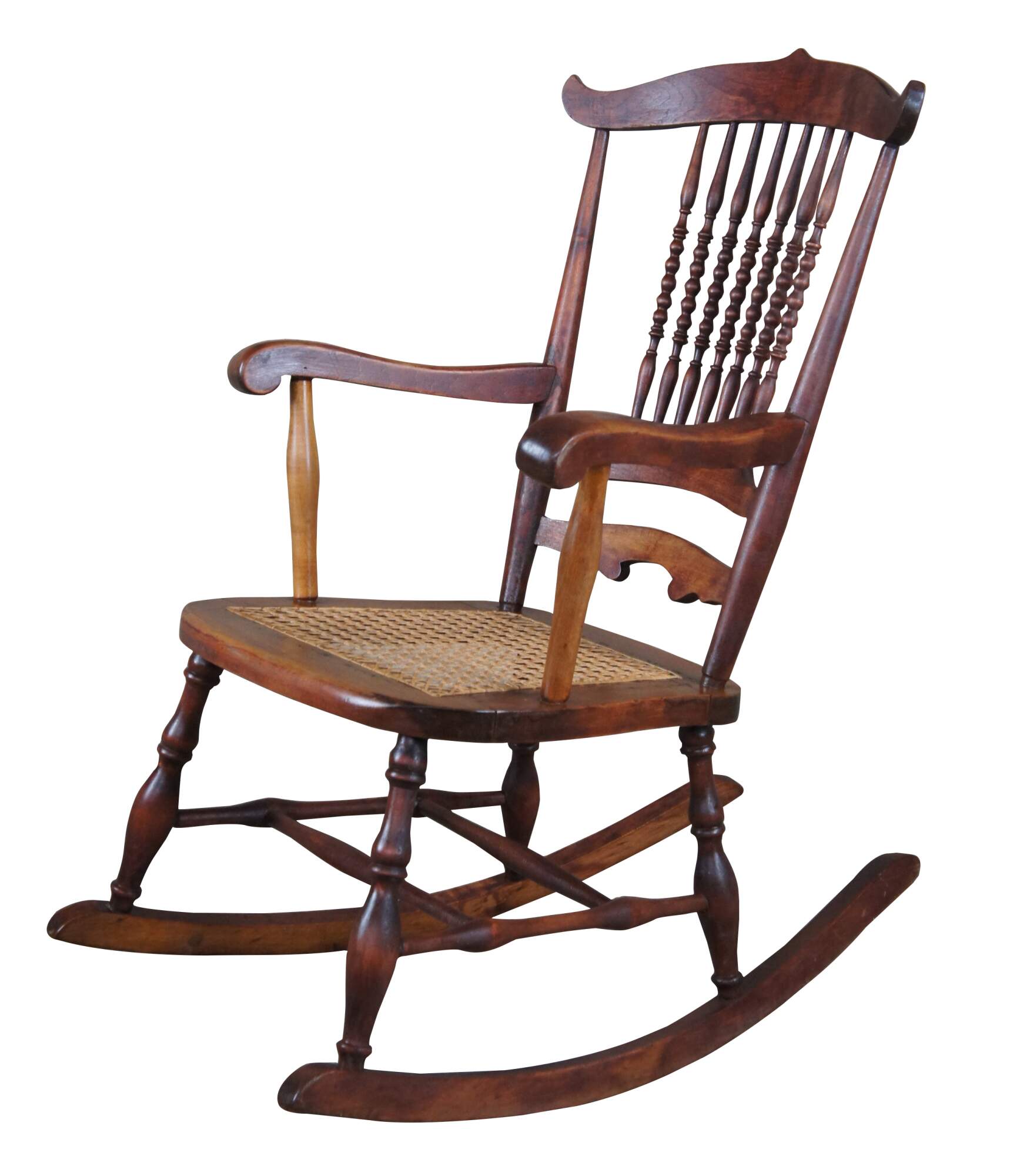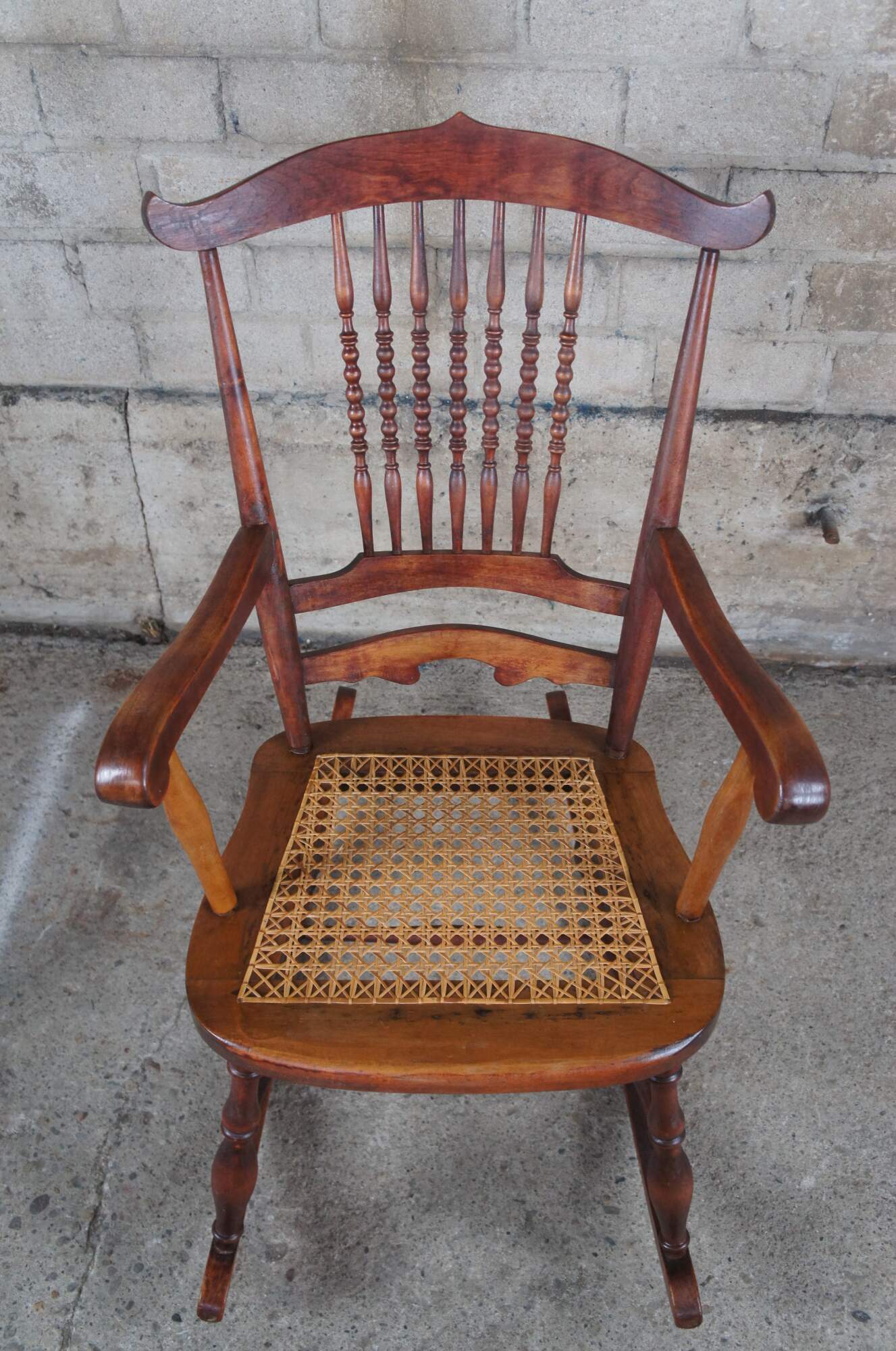 Early 20th century spindle back rocking chair. Made from maple with a shaped crest rail, sausage turned spindles and caned seat. Lower legs are turned and connected by an H stretcher