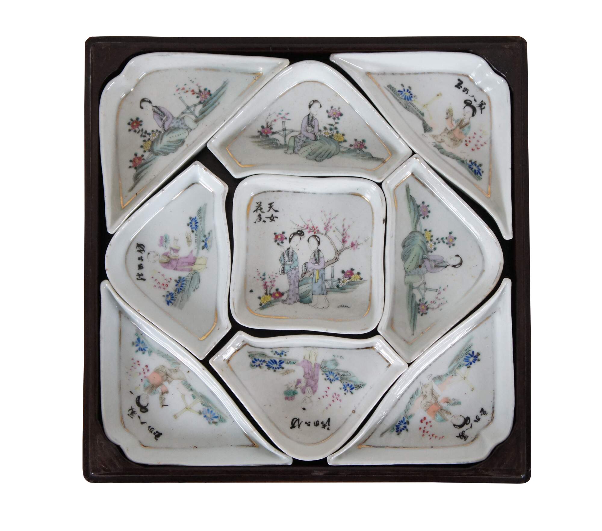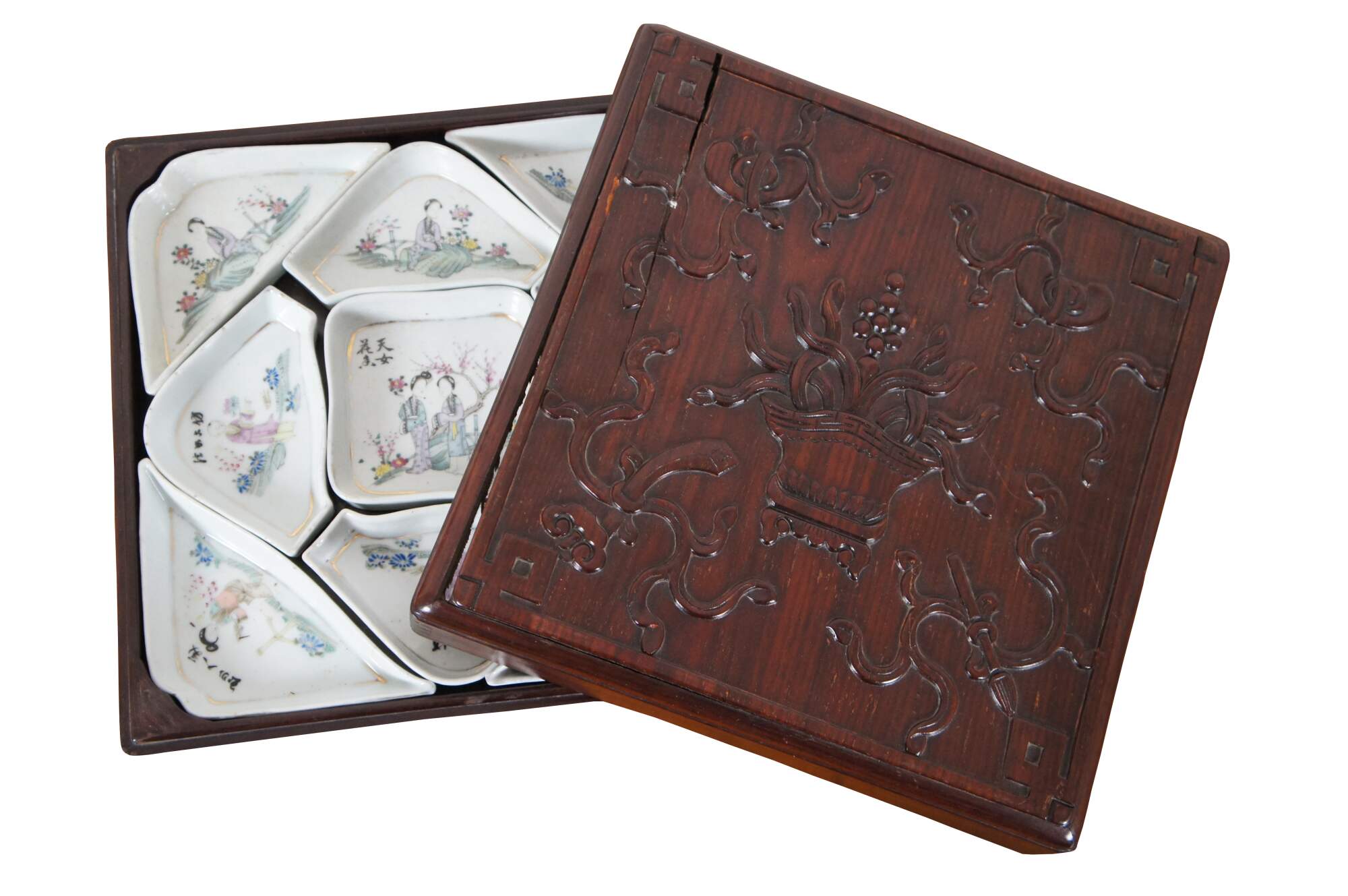 Antique 19th century Chinese Export, famille rose porcelain sweet meat / hors d’oeuvre dishes in a Rosewood box elegantly carved with ribbons and a basket of flowers. Features 9 dishes arranged geometrically with scenes of Geishas and Scholars.