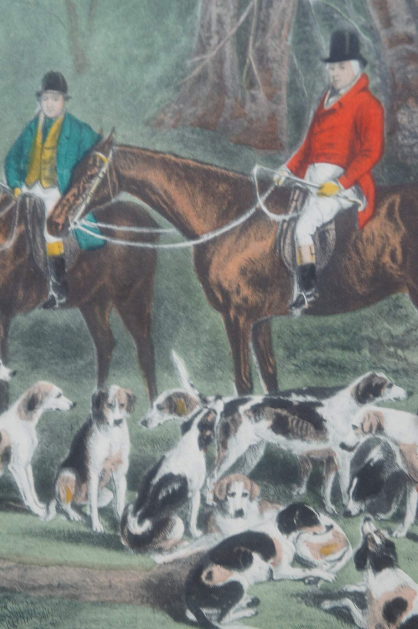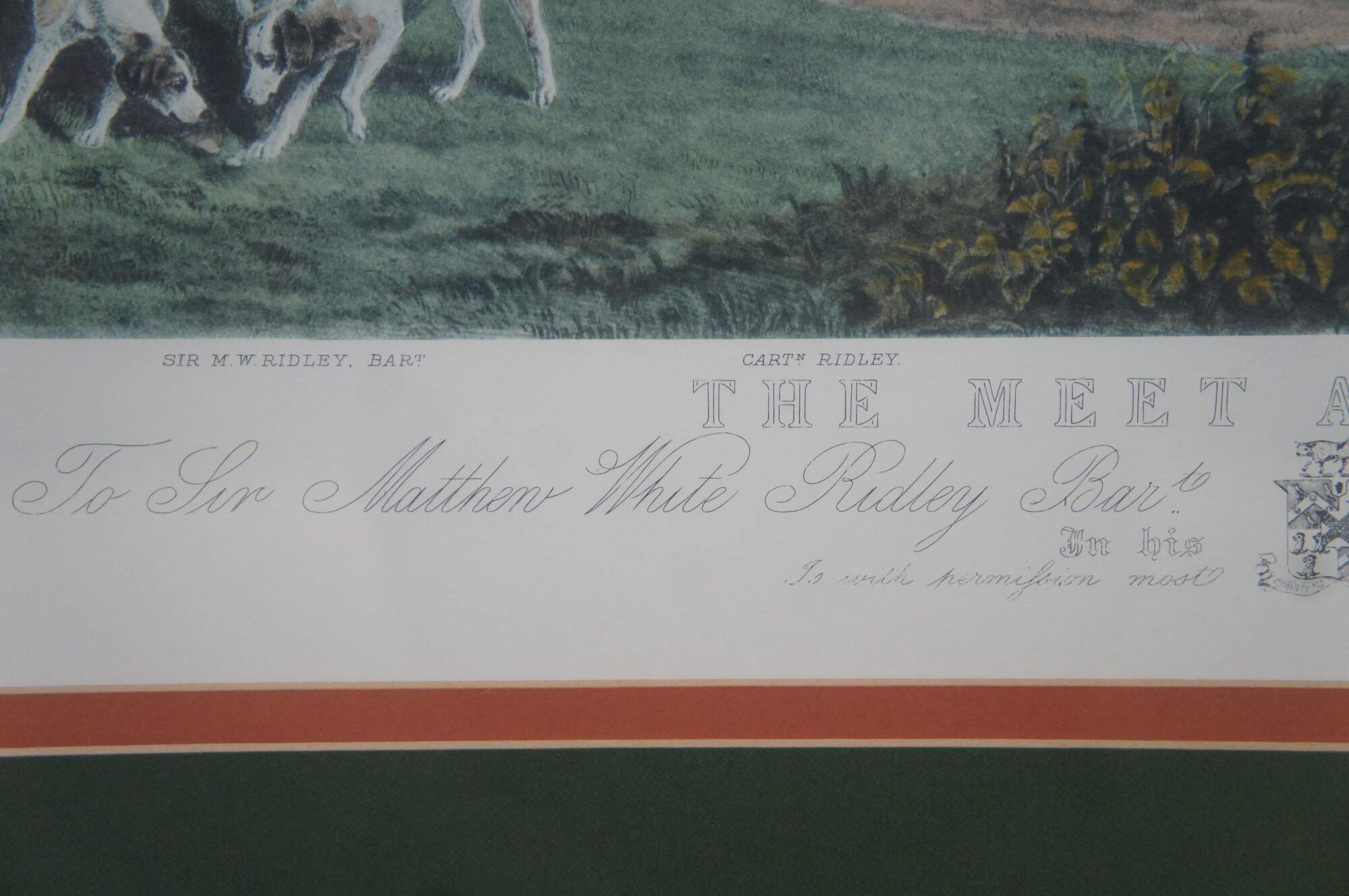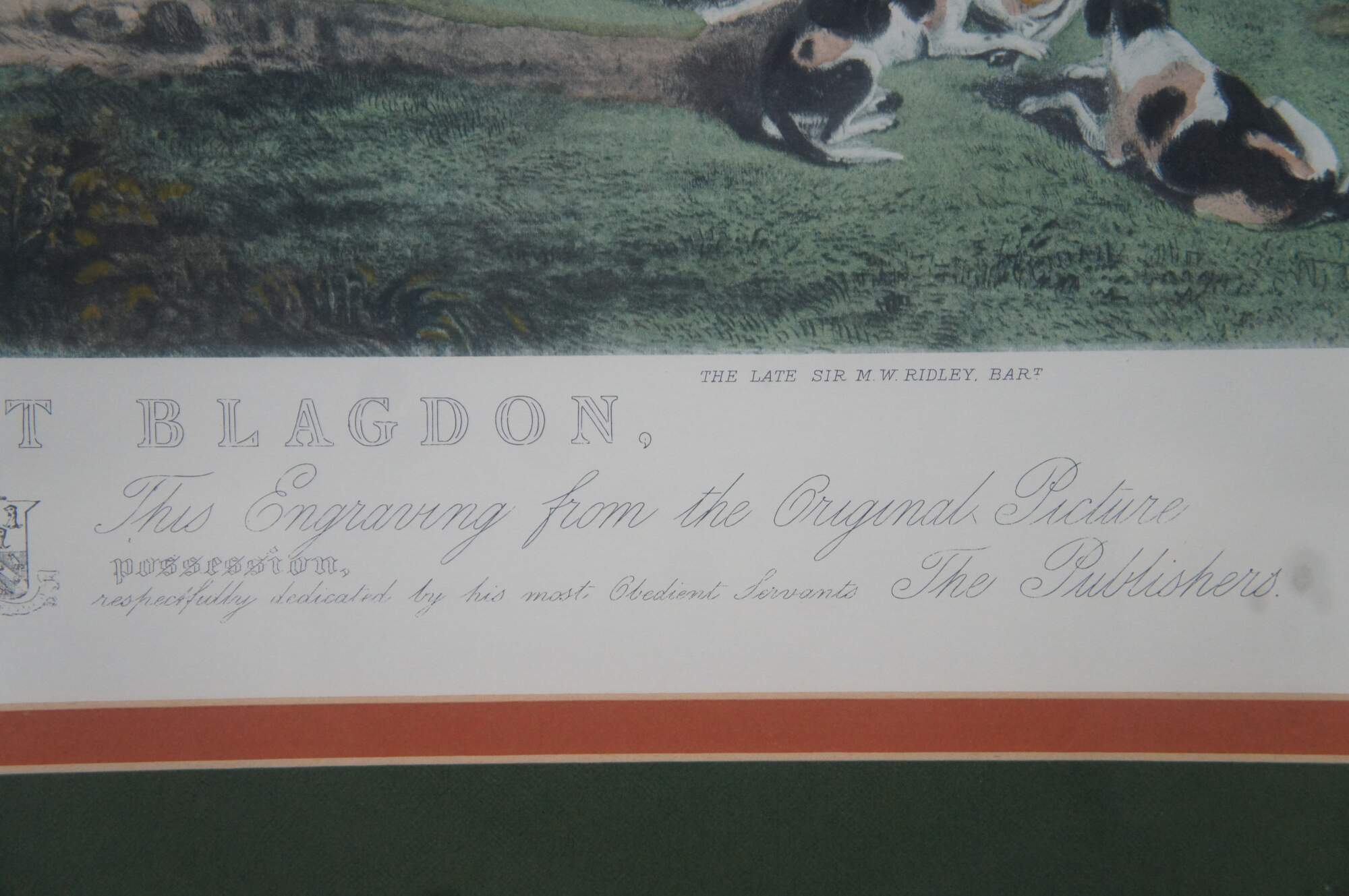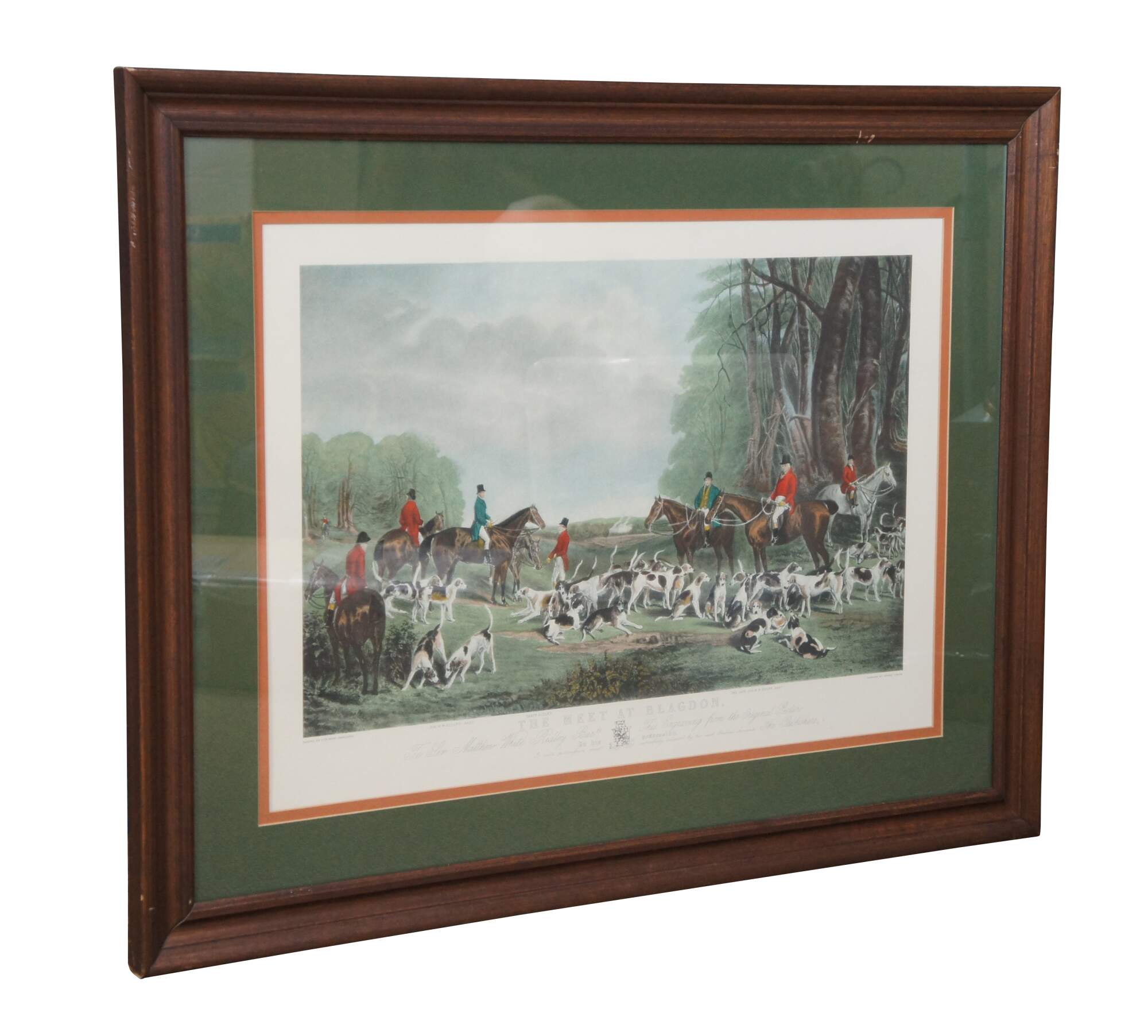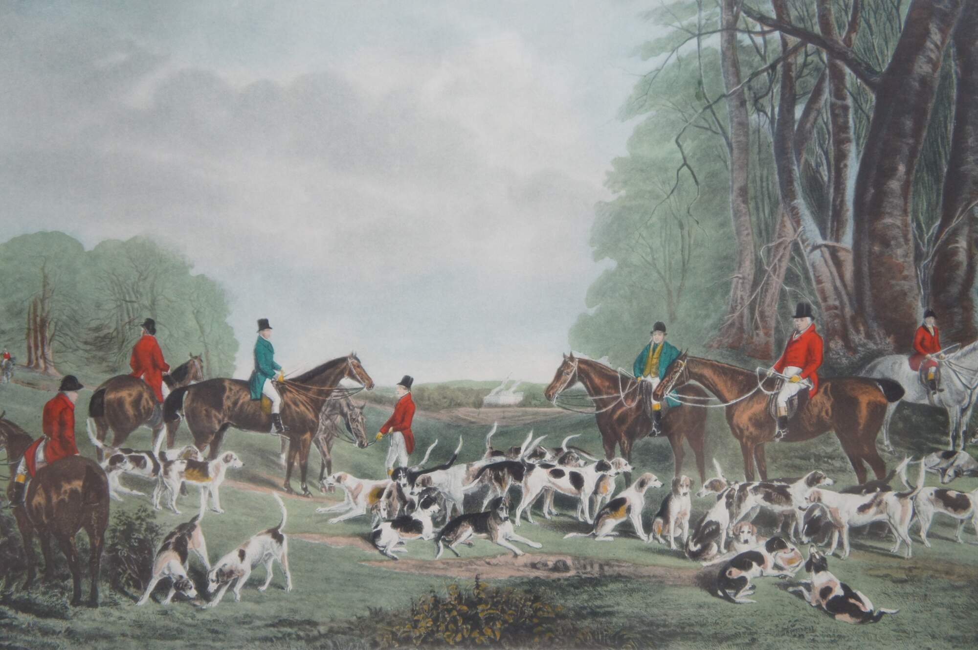 Antique 19th century hand colored engraving titled The Meet at Blagdon, original painted by J.W. Snow, engraved by Thomas Lurton. Features an English equestrian landscape fox hunt scene with horses, hounds and hunters.