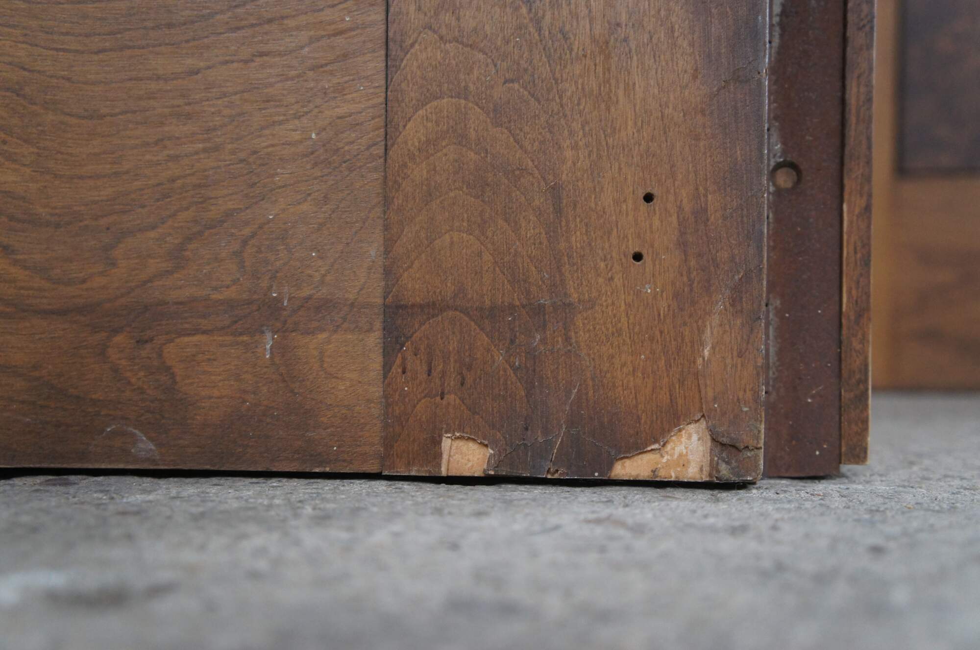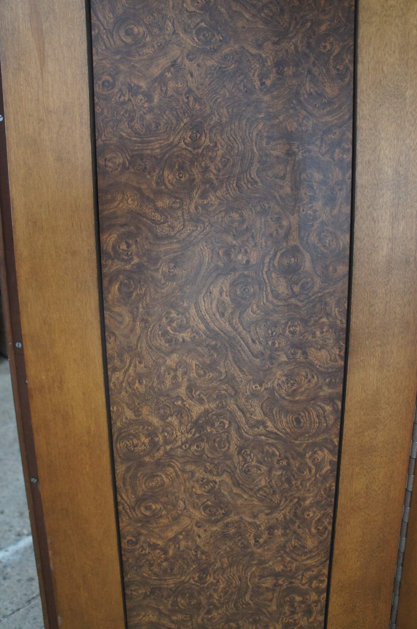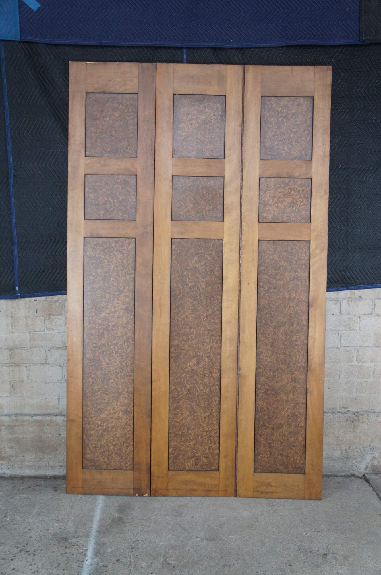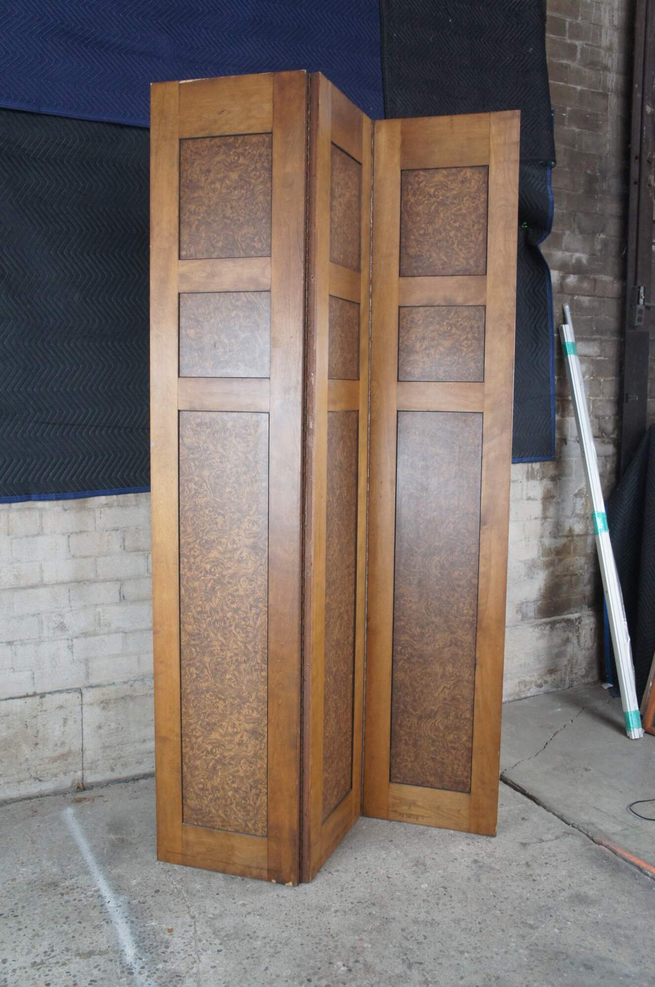 Monumental vintage 3 panel folding screen. Made from mahogany with inset mahogany burl panels. Connect by large iron hinges. A stout piece made to stand the test of time.