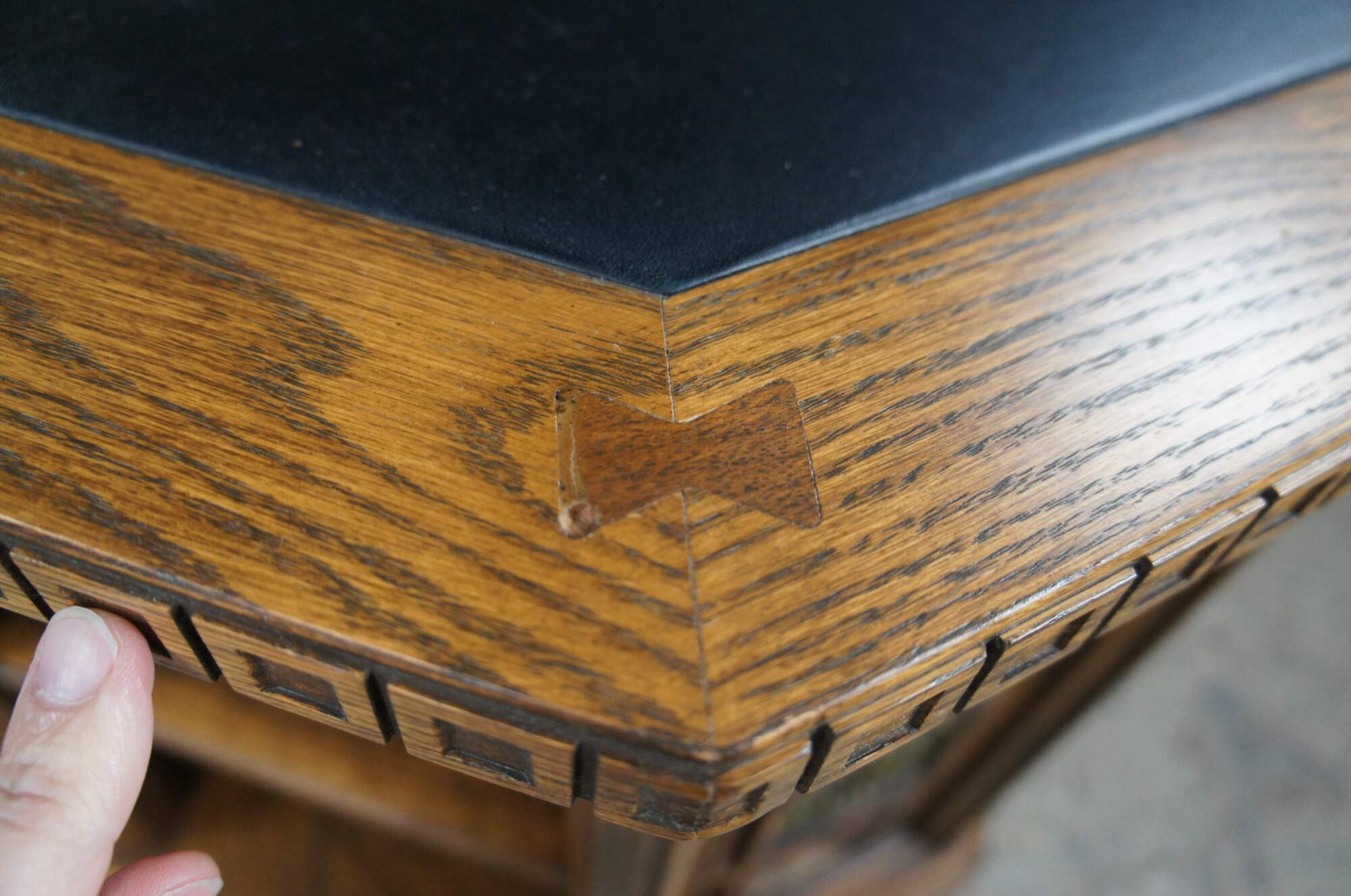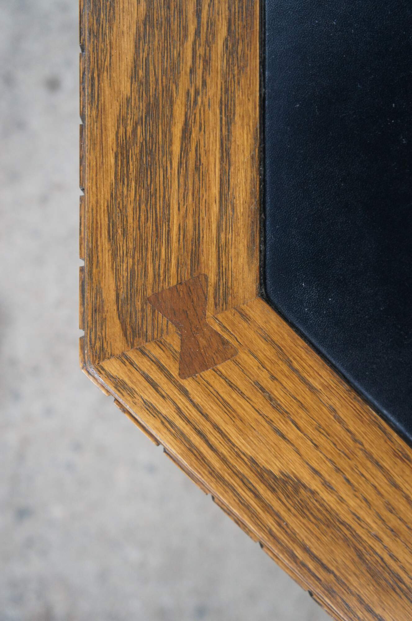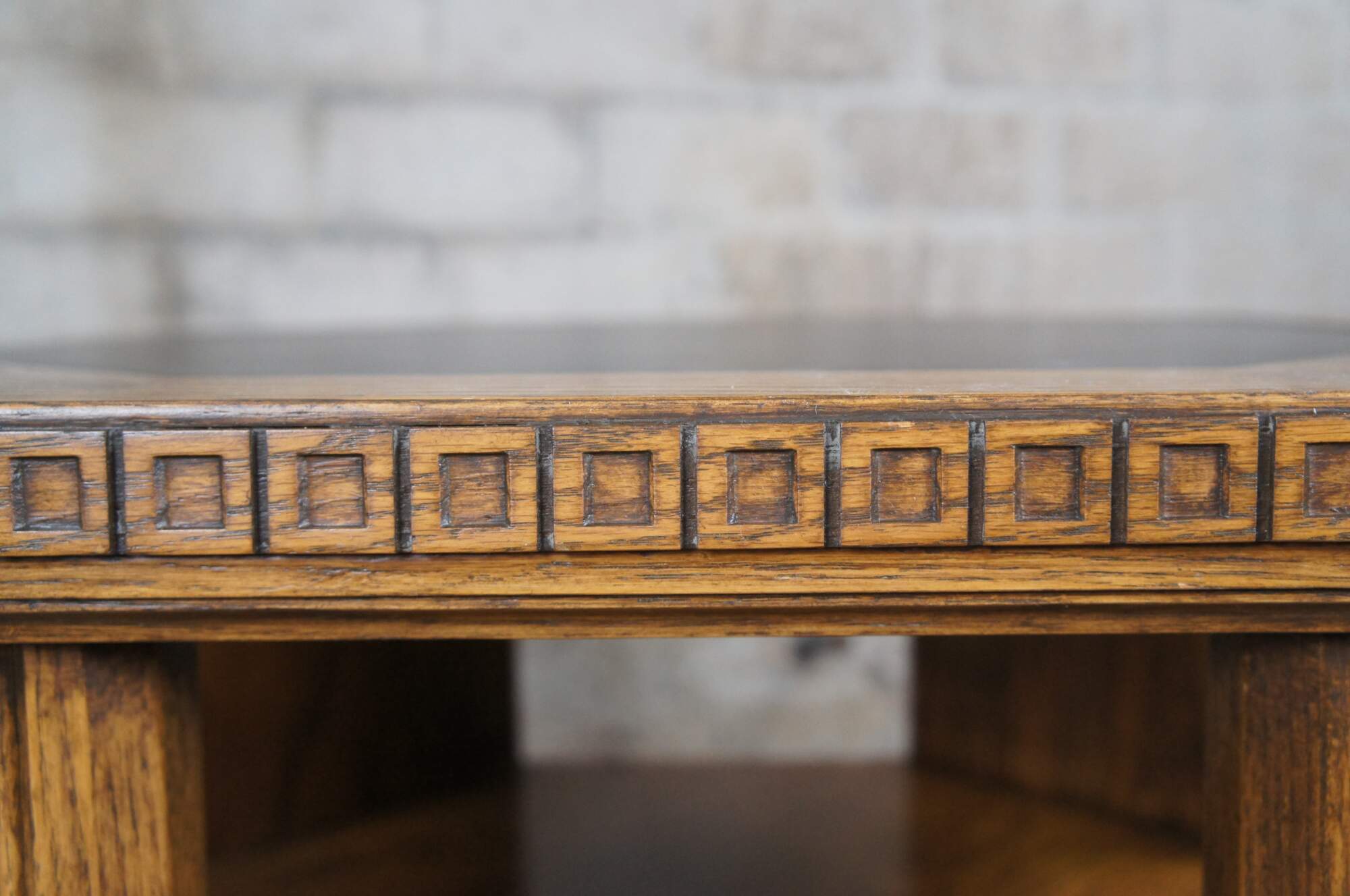 Romweber (R-14592) Viking Oak Zodiac End Table, circa 1974. Features an octagonal carved oak tiered frame with black leather inset top and bowtie (butterfly joint) dovetailing. Frieze shows a striking square notched apron over carved pillars with each of 12 Zodiac symbols. An iconic piece from the mid century era.