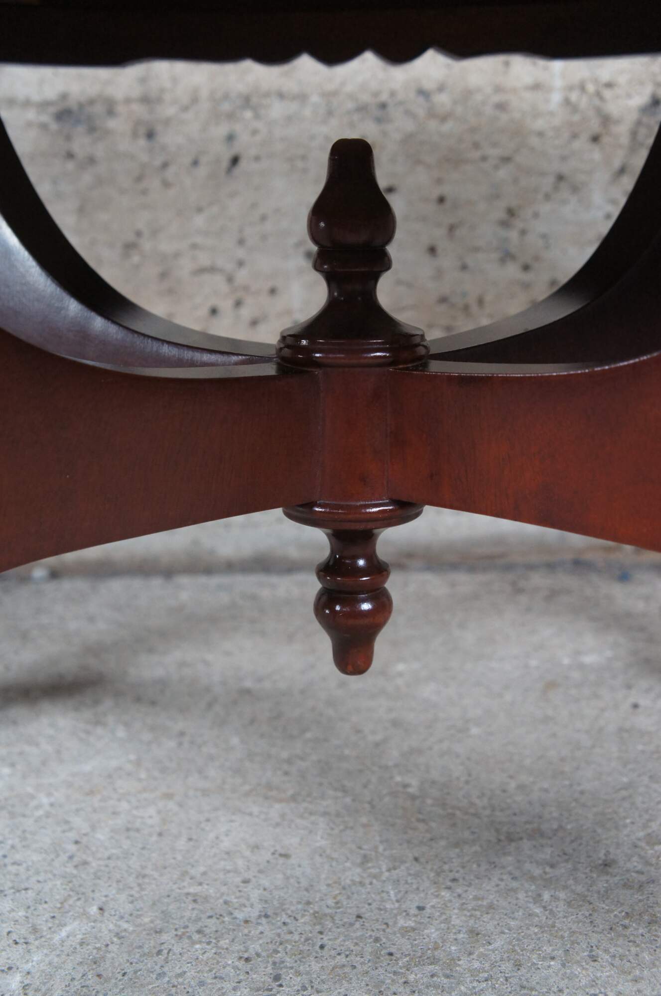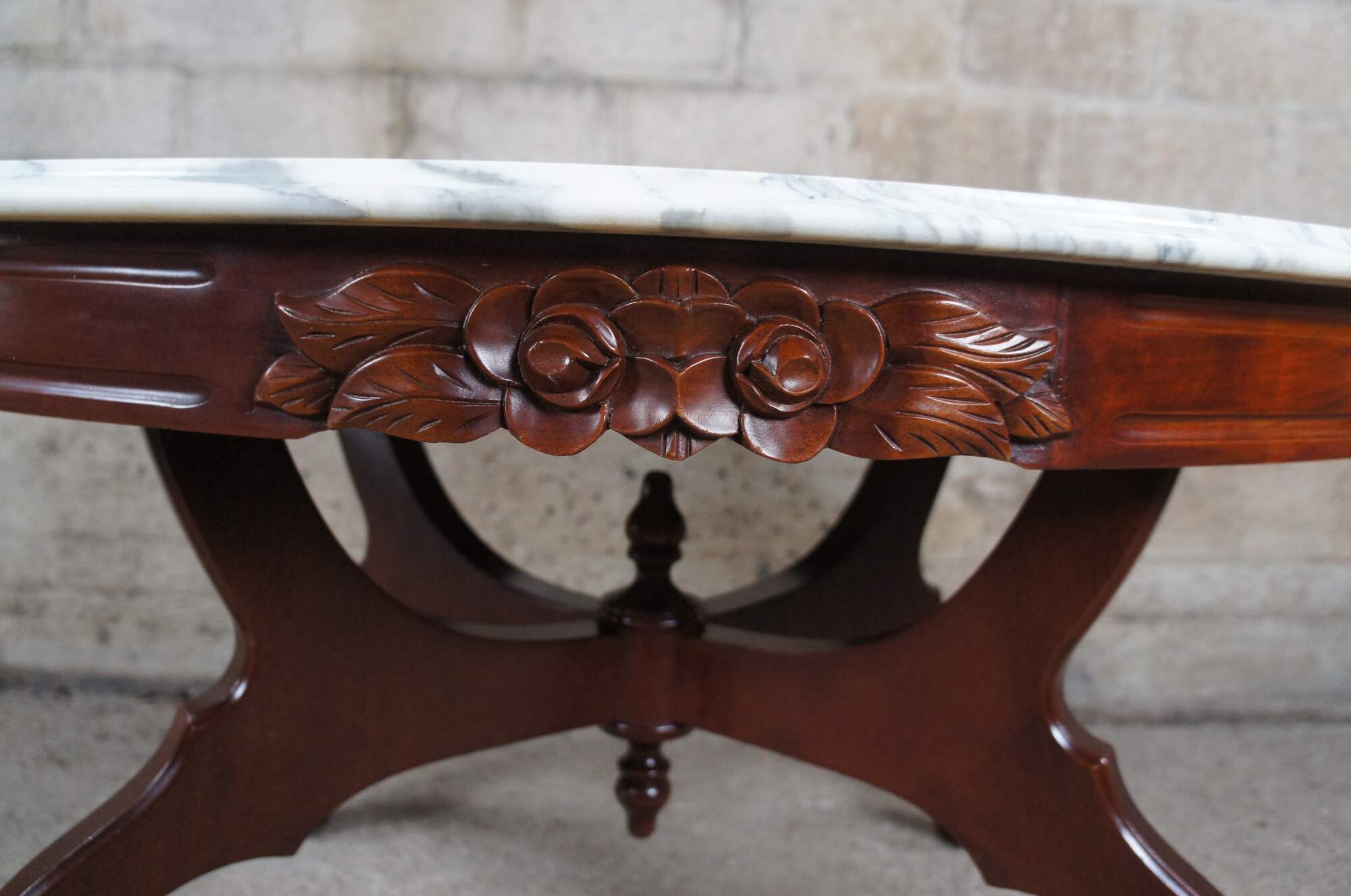 Vintage Victorian reproduction parlor table by Kimball Furniture. Made from mahogany with an oval white Italian marble top. Features a rose carved apron over a four legged base centered by finials.