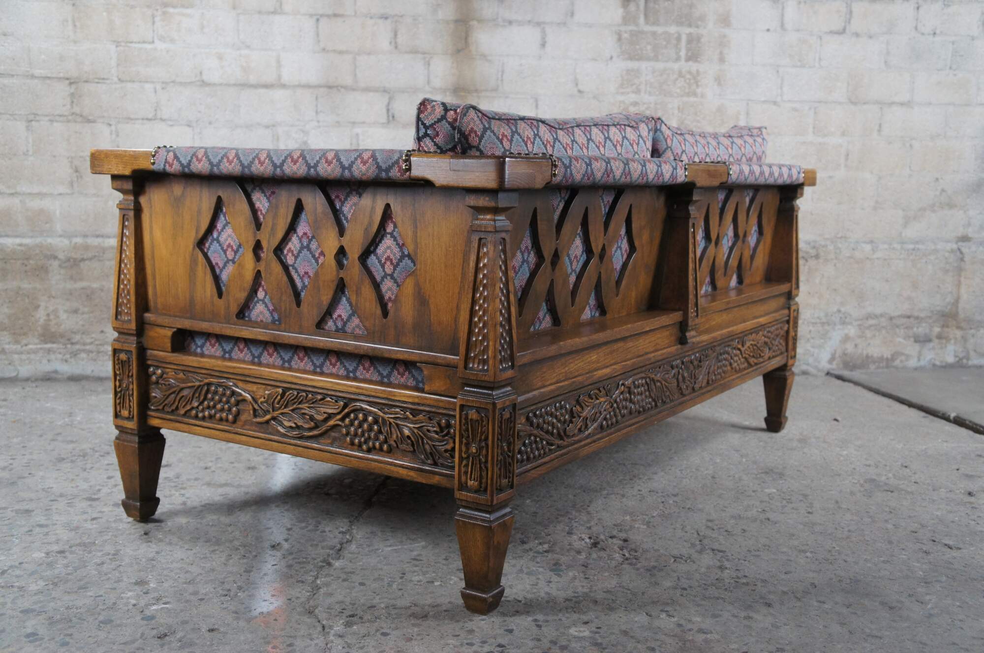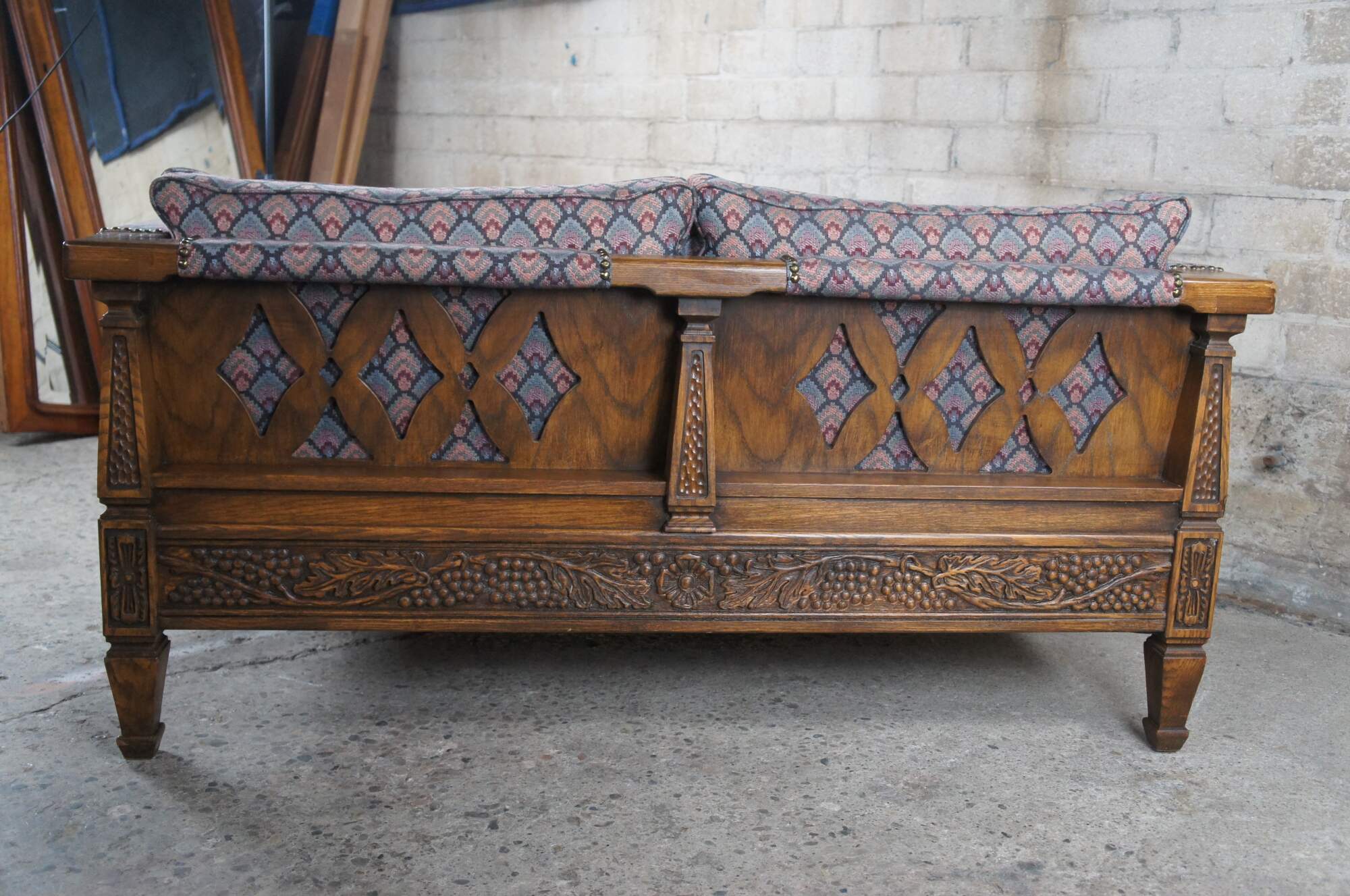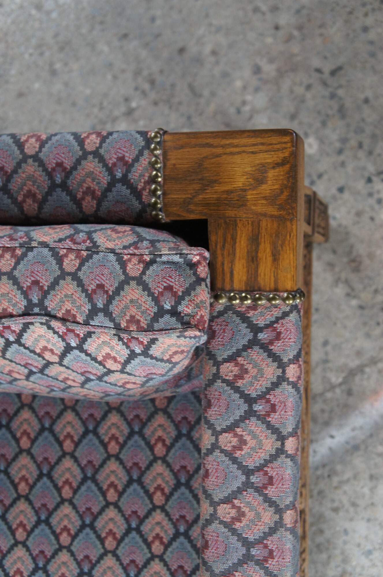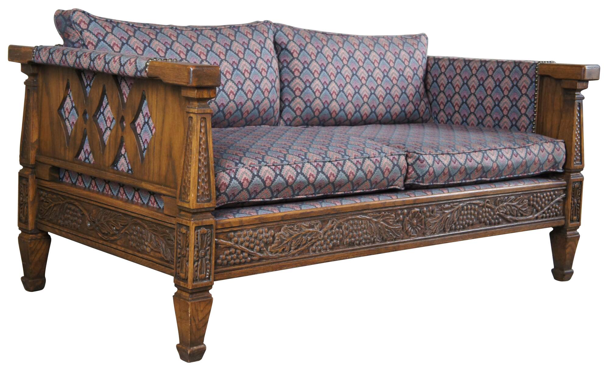 Romweber (R-13850) Viking Oak love Seat, circa 1974. Features a short rectangular carved oak frame with grapevine motif, tooled pillars and floral embellishments. Upholstered in a retro fan pattern with nail head trim along the arms. Outer sides and back have a diamond pattern cutout. The frame is raised over square tapered legs. An iconic piece from the mid century era that is great for office, home or library use.