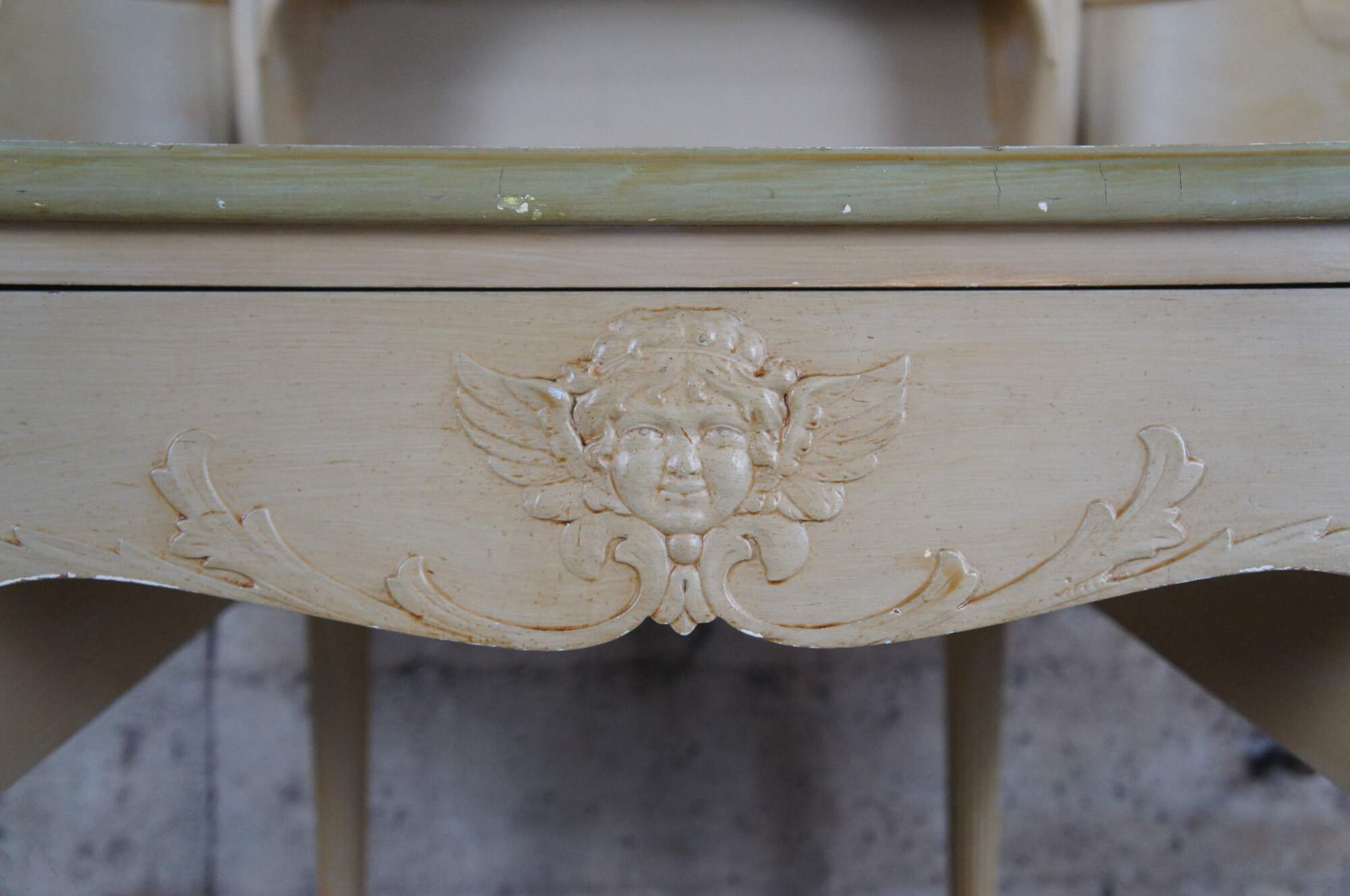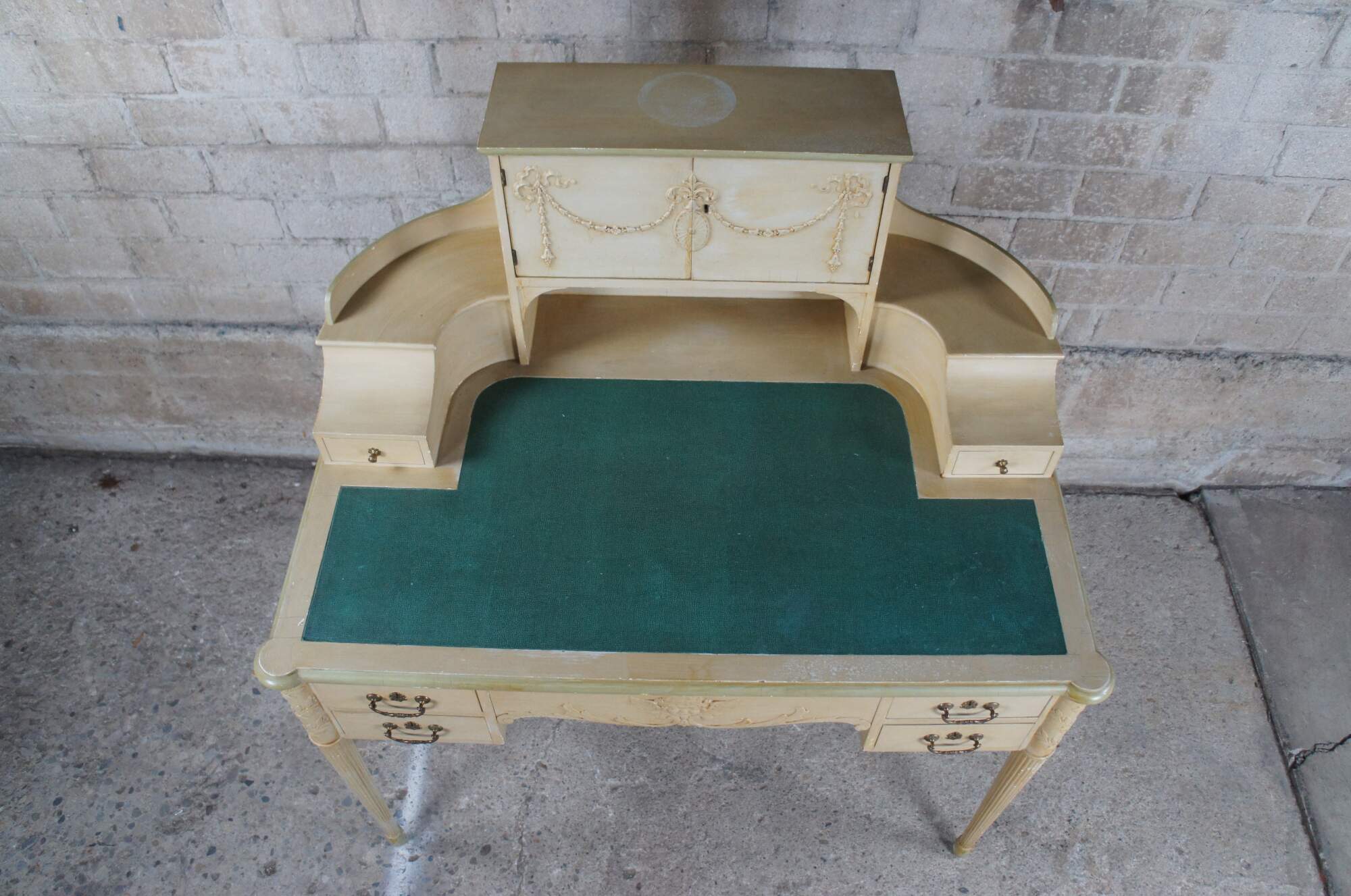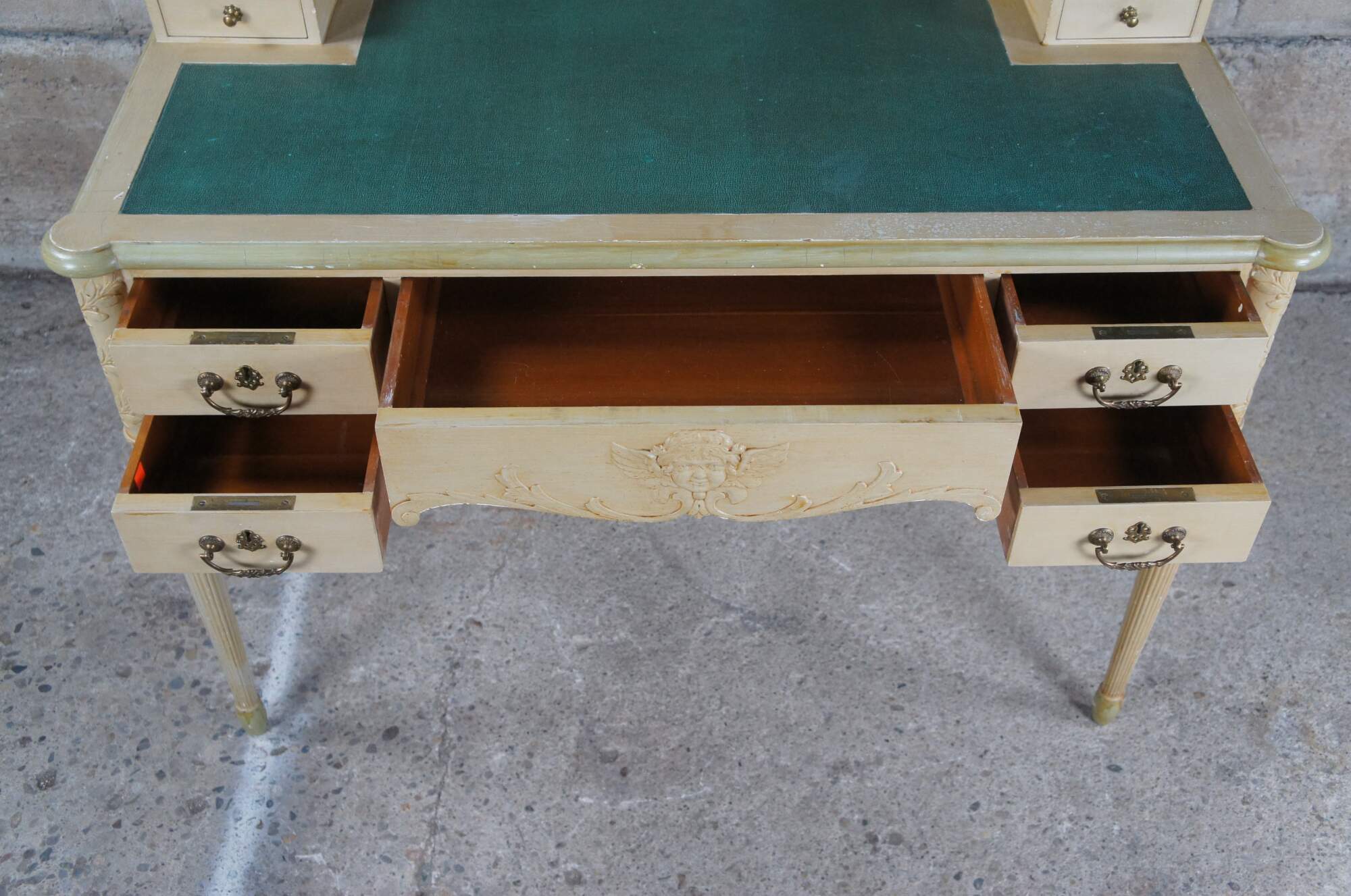 A lovely antique late Victorian Carlton House writing desk or library table. Features a ""D"" form with seven drawers, lockable hutch compartment and green vinyl work surface. Ornately designed with a putti or cherub carving a long the knee-hole and tassel / ribboned medallion backing. The desk is supported by four reeded and tapered legs leading to peg feet. Front corners have a neat wrap around leaf motif. Finished in an Antique White that was painted in the 1940s. Hardware is brass.