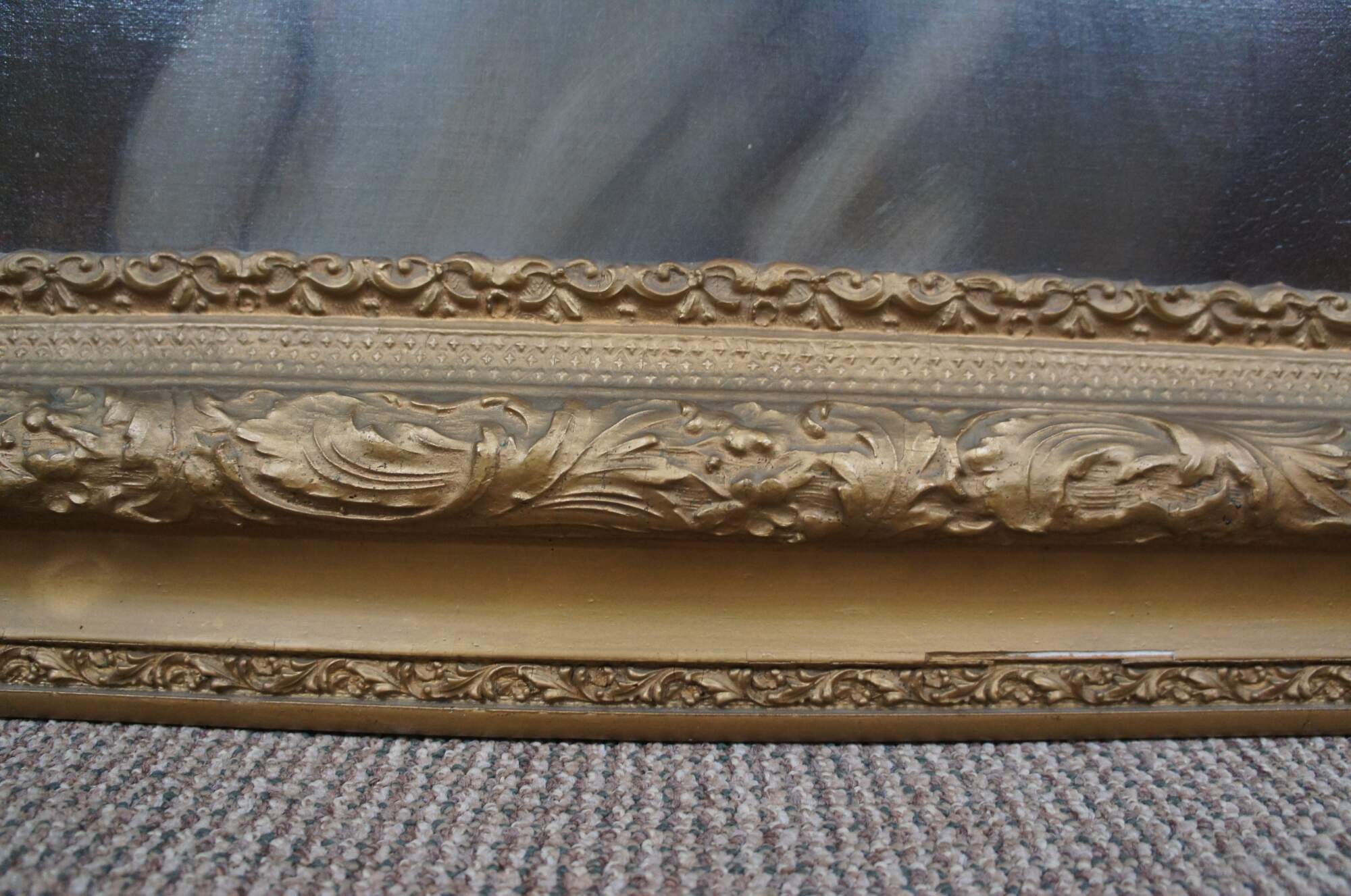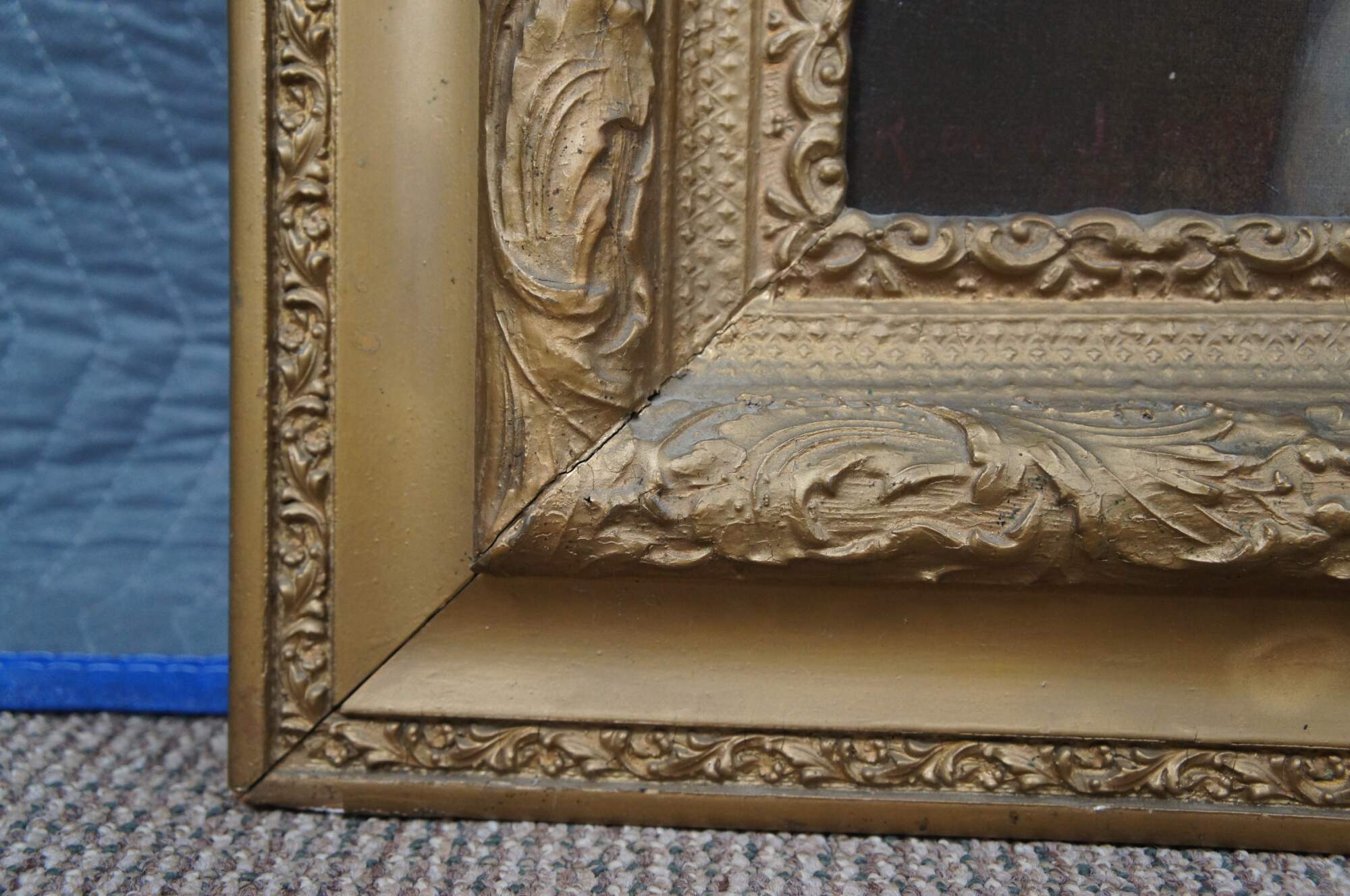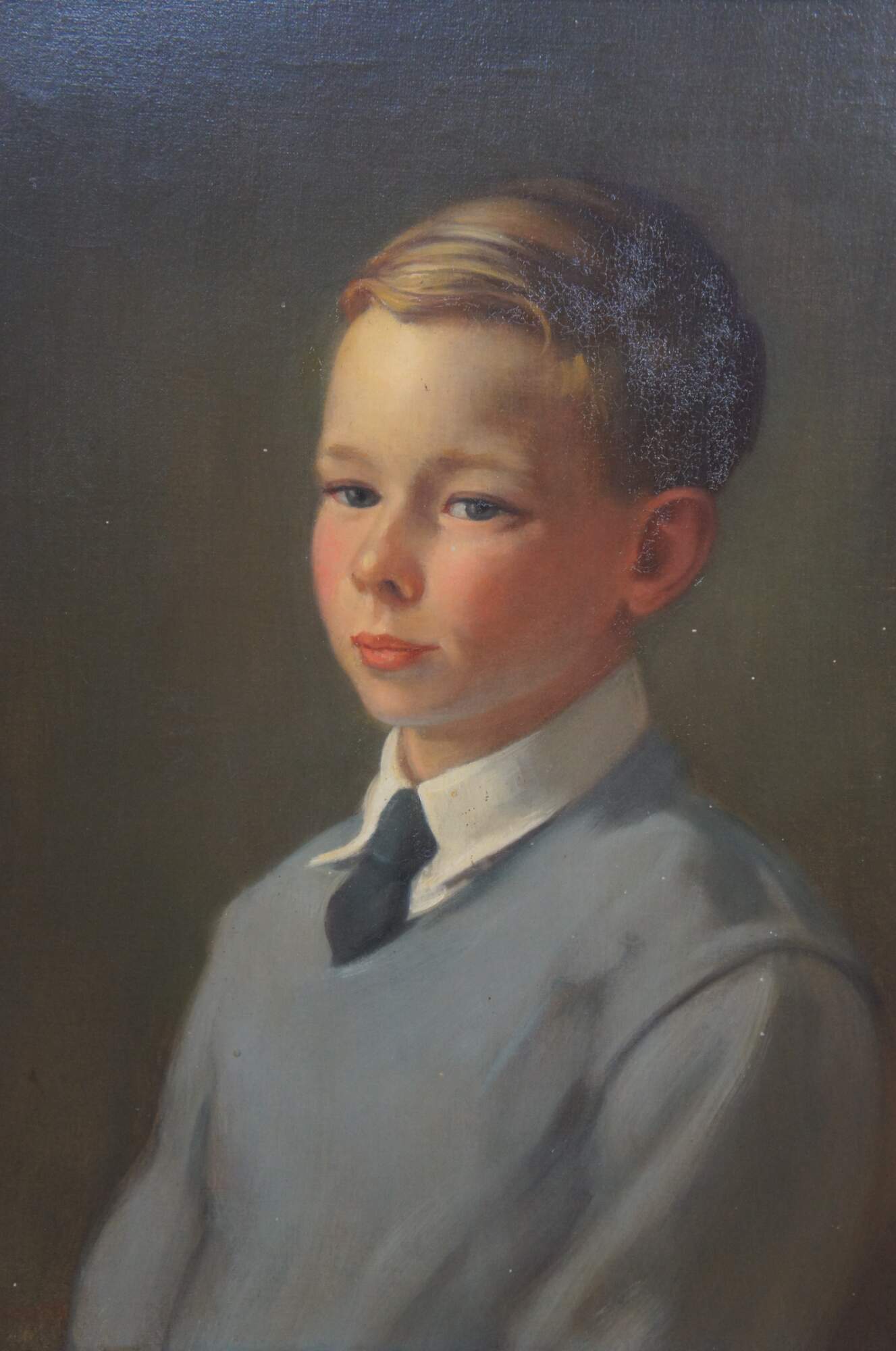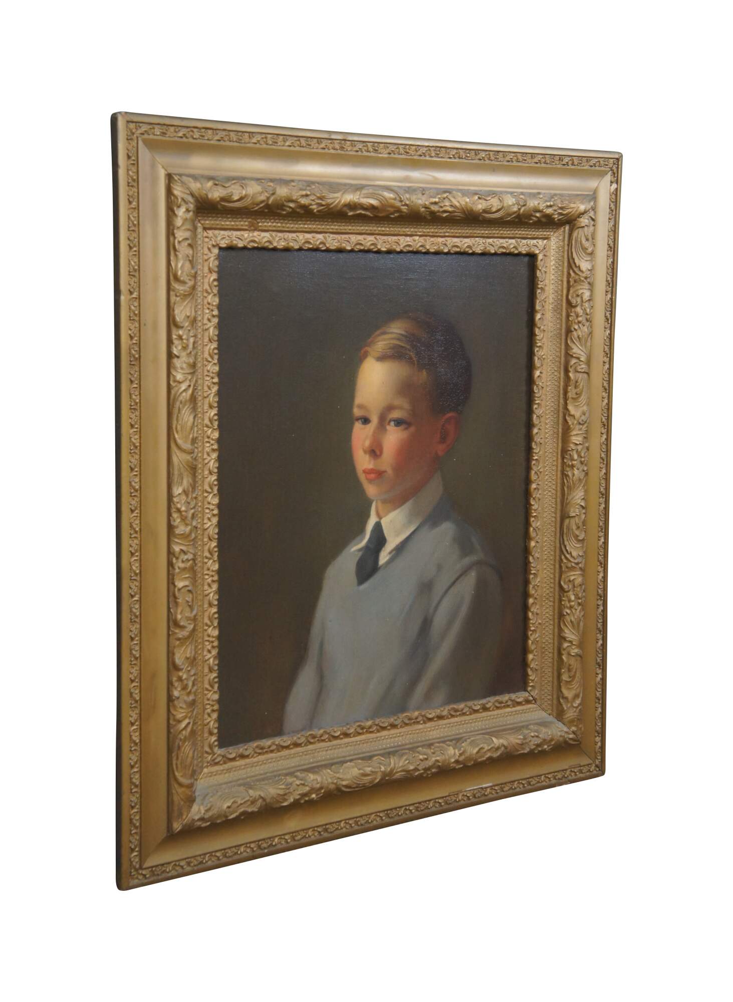 20th century oil painting on canvas. The portait is of a young boy from the belly up. The boy is painted in a gray sweater with white collar shirt and blue tie. He has short dirty blonde hair with a comb over. Framed in a gold painted Victorian frame. The canvas is unsigned. Marked Stanley Kulfan along the backside.
