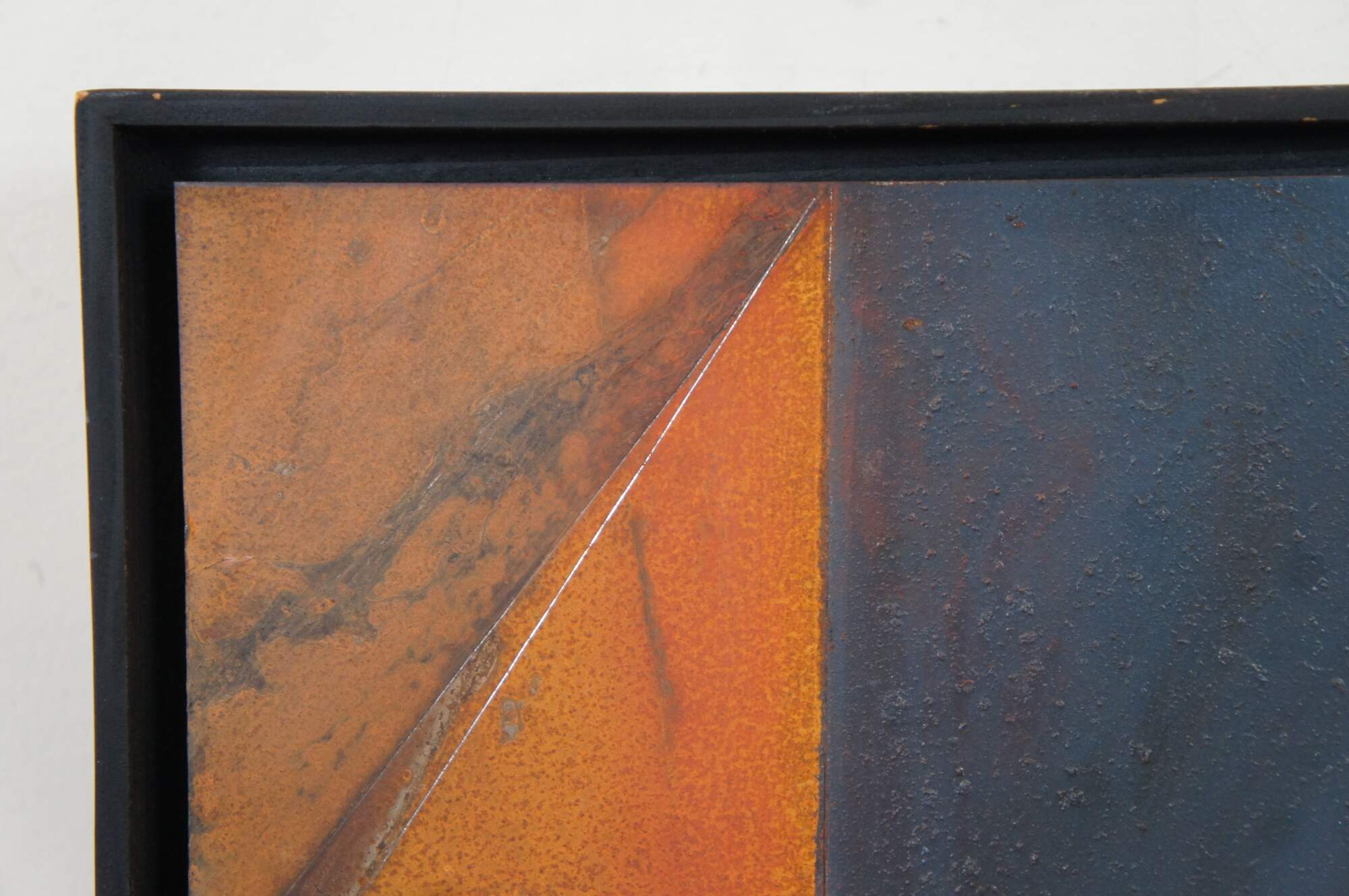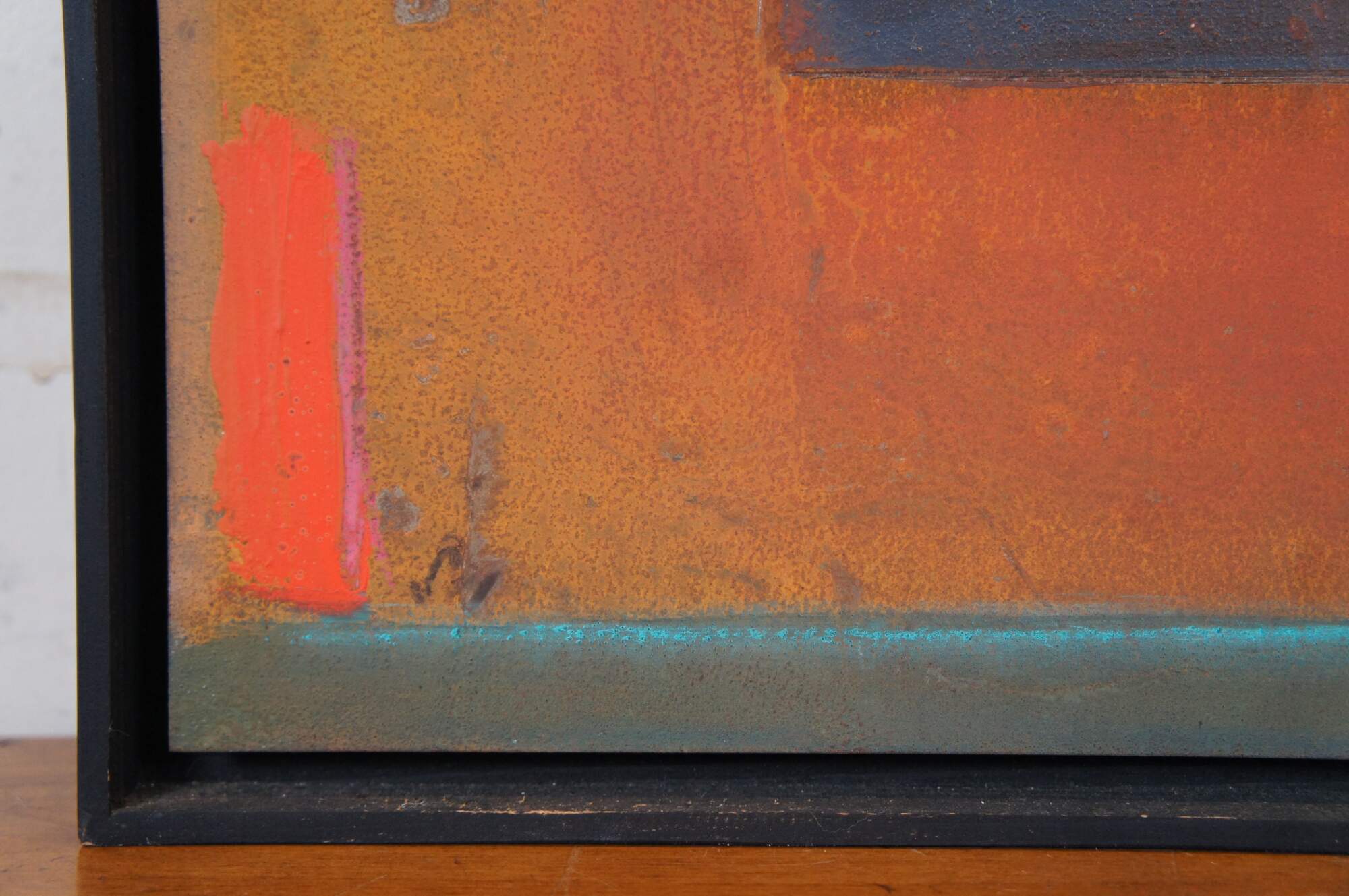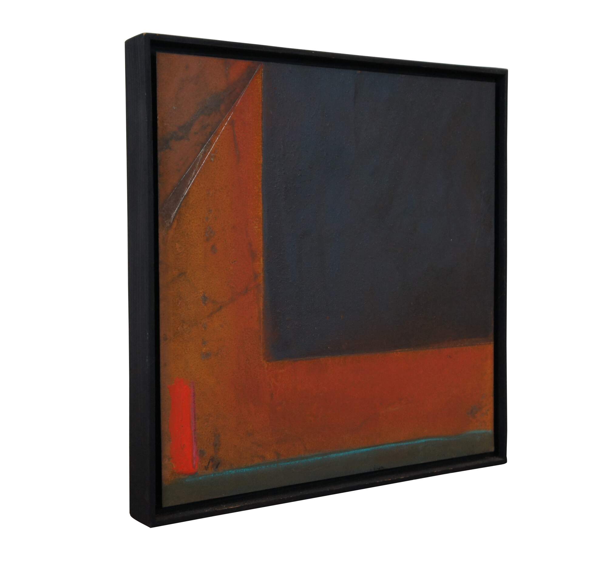 Modern abstract expressionist / cubist painting on metal featuring geometric blocks of orange and blue, set in a black shadowbox frame.