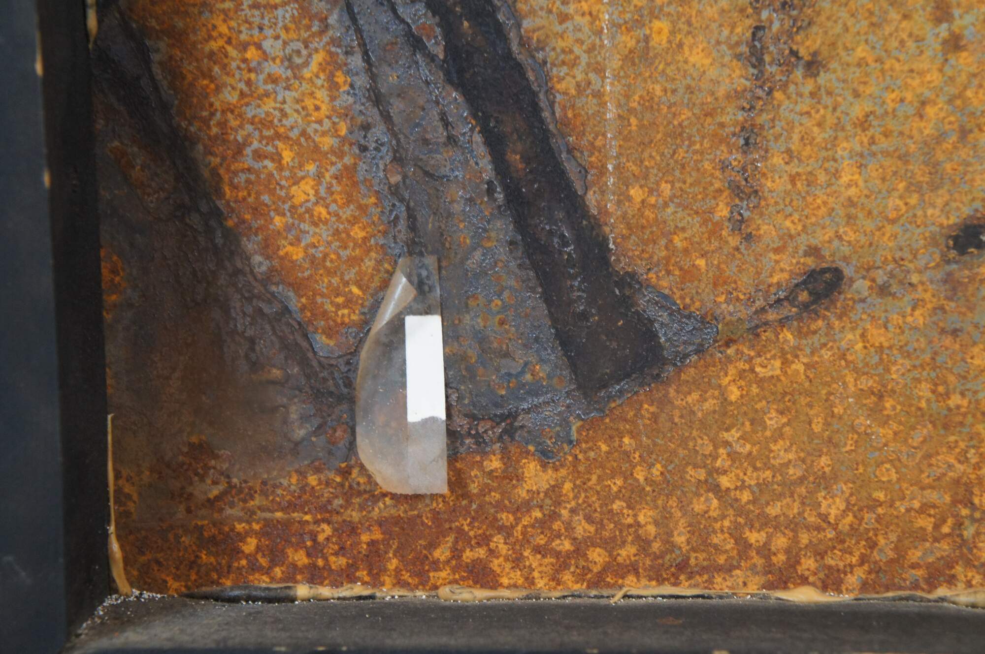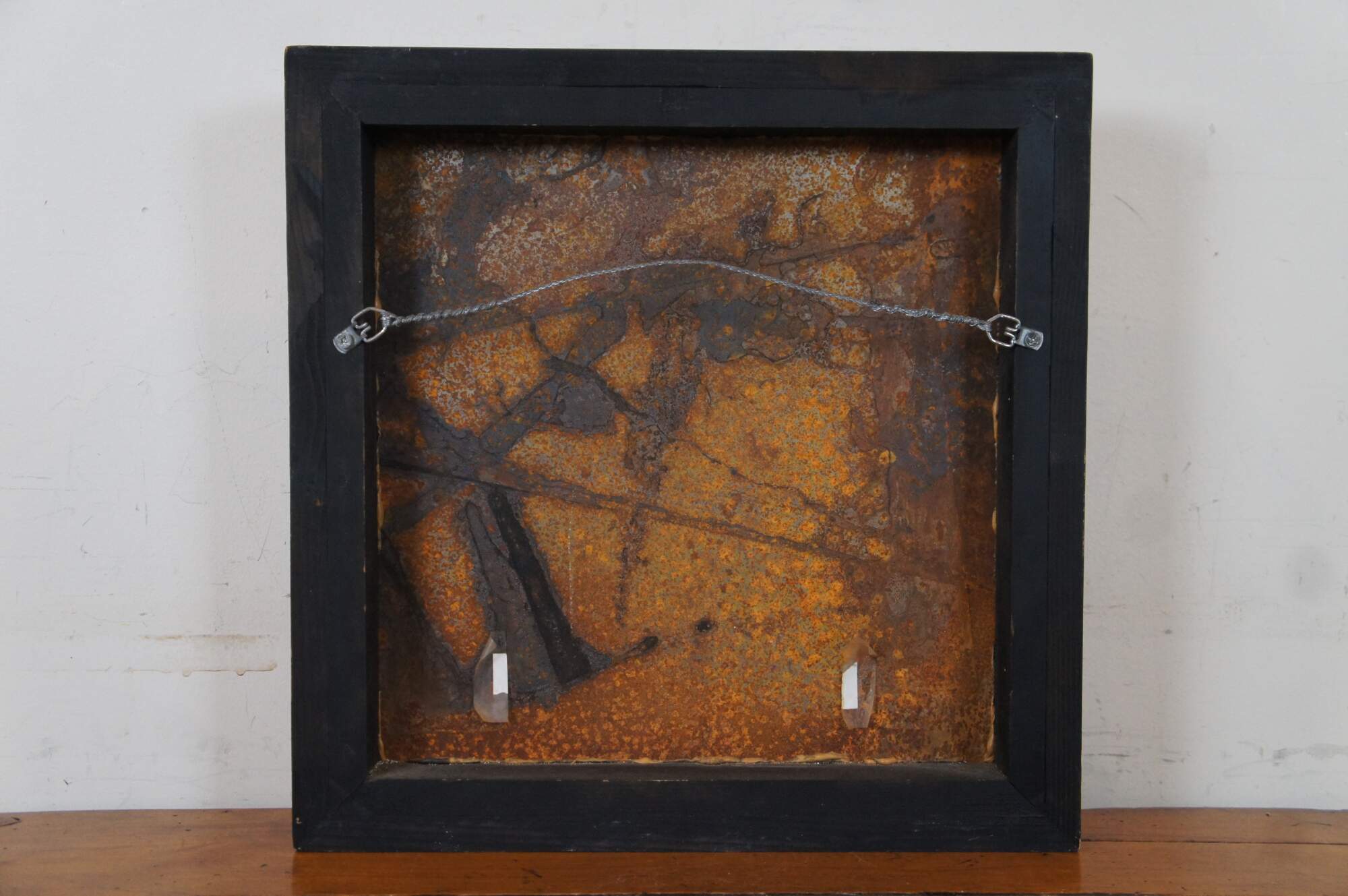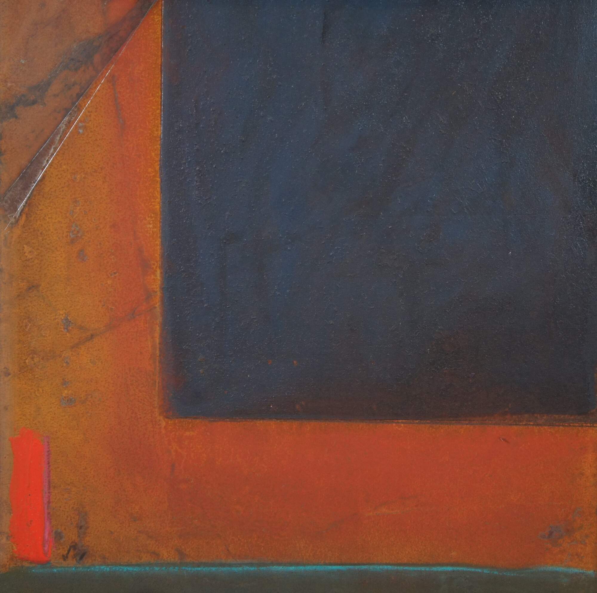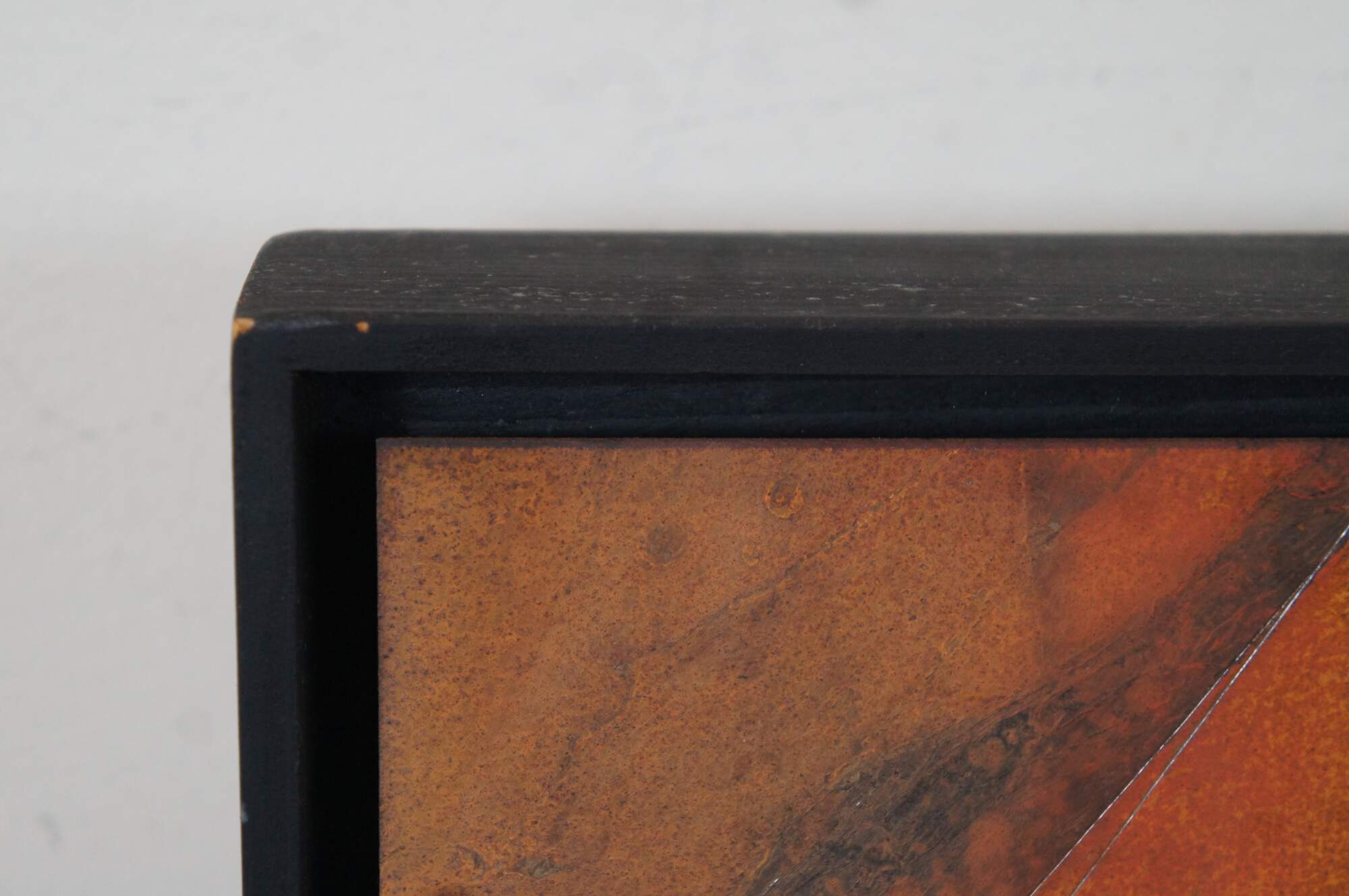 Modern abstract expressionist / cubist painting on metal featuring geometric blocks of orange and blue, set in a black shadowbox frame.