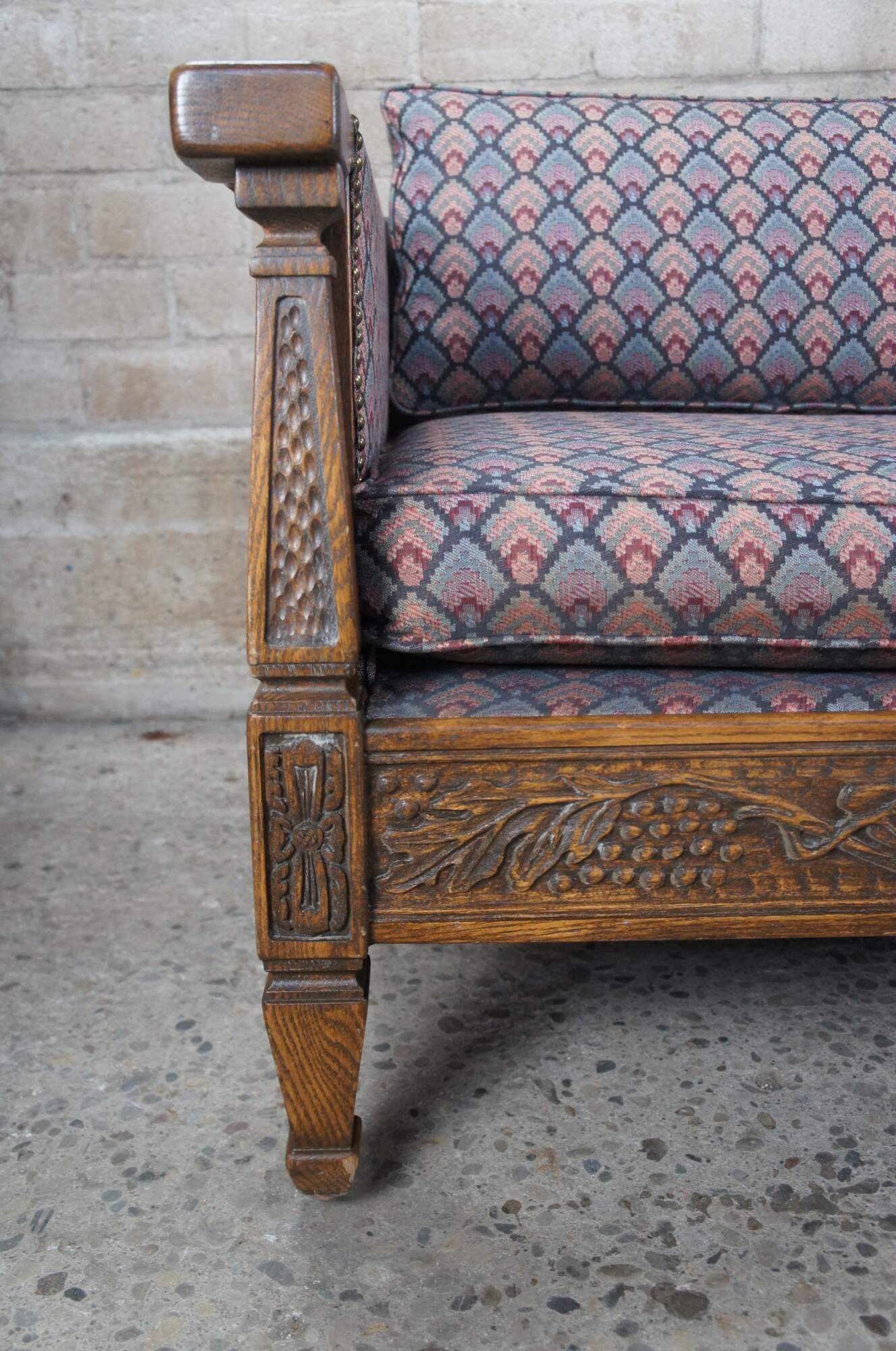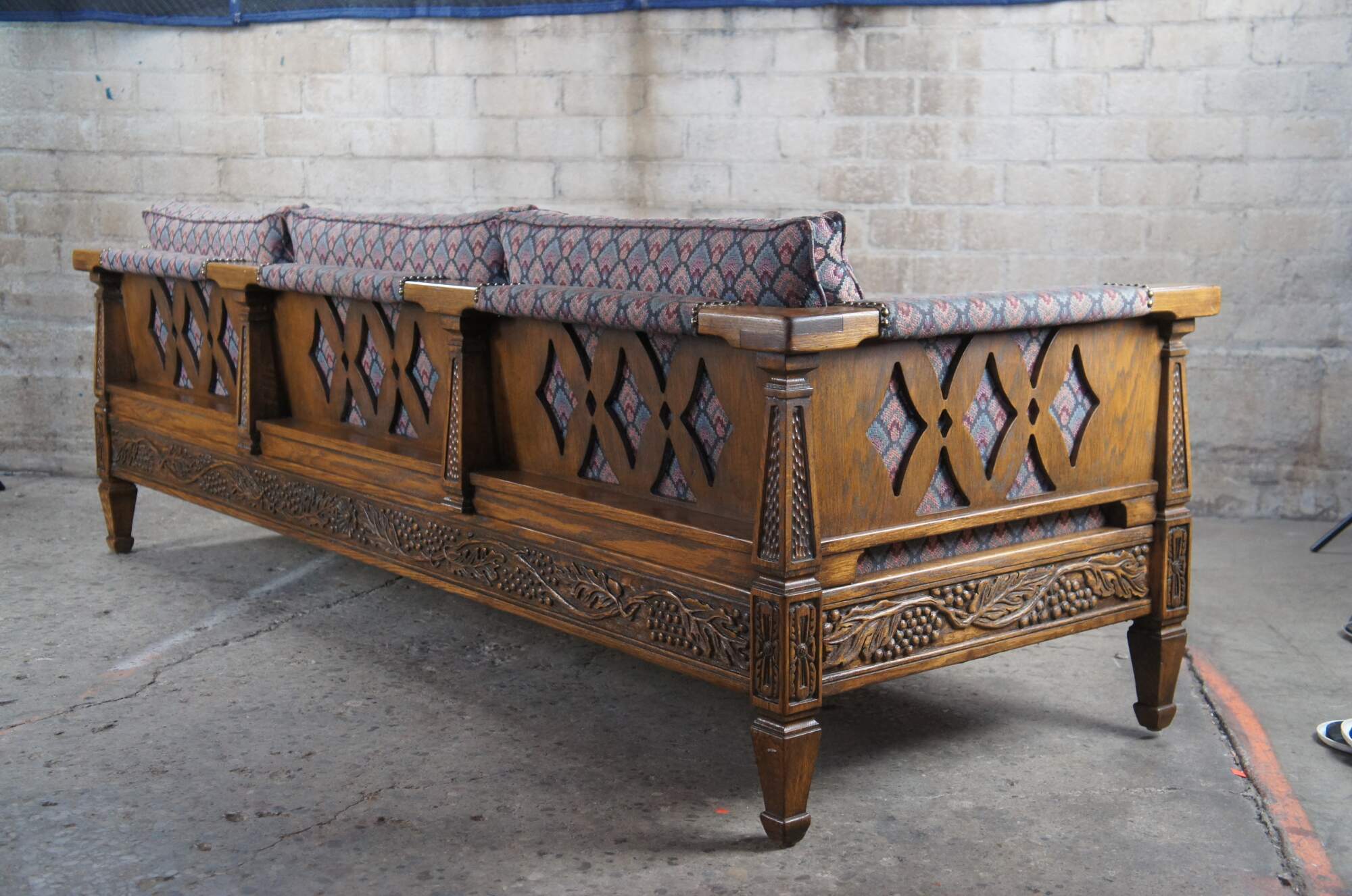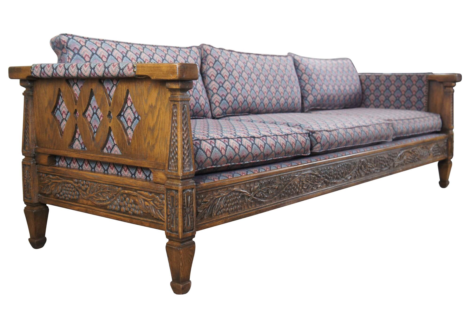 Romweber (R-13490) Viking Oak three seat sofa / couch, circa 1984. Features rectangular carved oak frame with grapevine motif, tooled pillars and floral embellishments. Upholstered in a retro fan pattern with nail head trim along the arms. Outer sides and back have a diamond pattern cutout. The frame is raised over square tapered legs. An iconic piece from the mid century era that is great for office, home or library use.