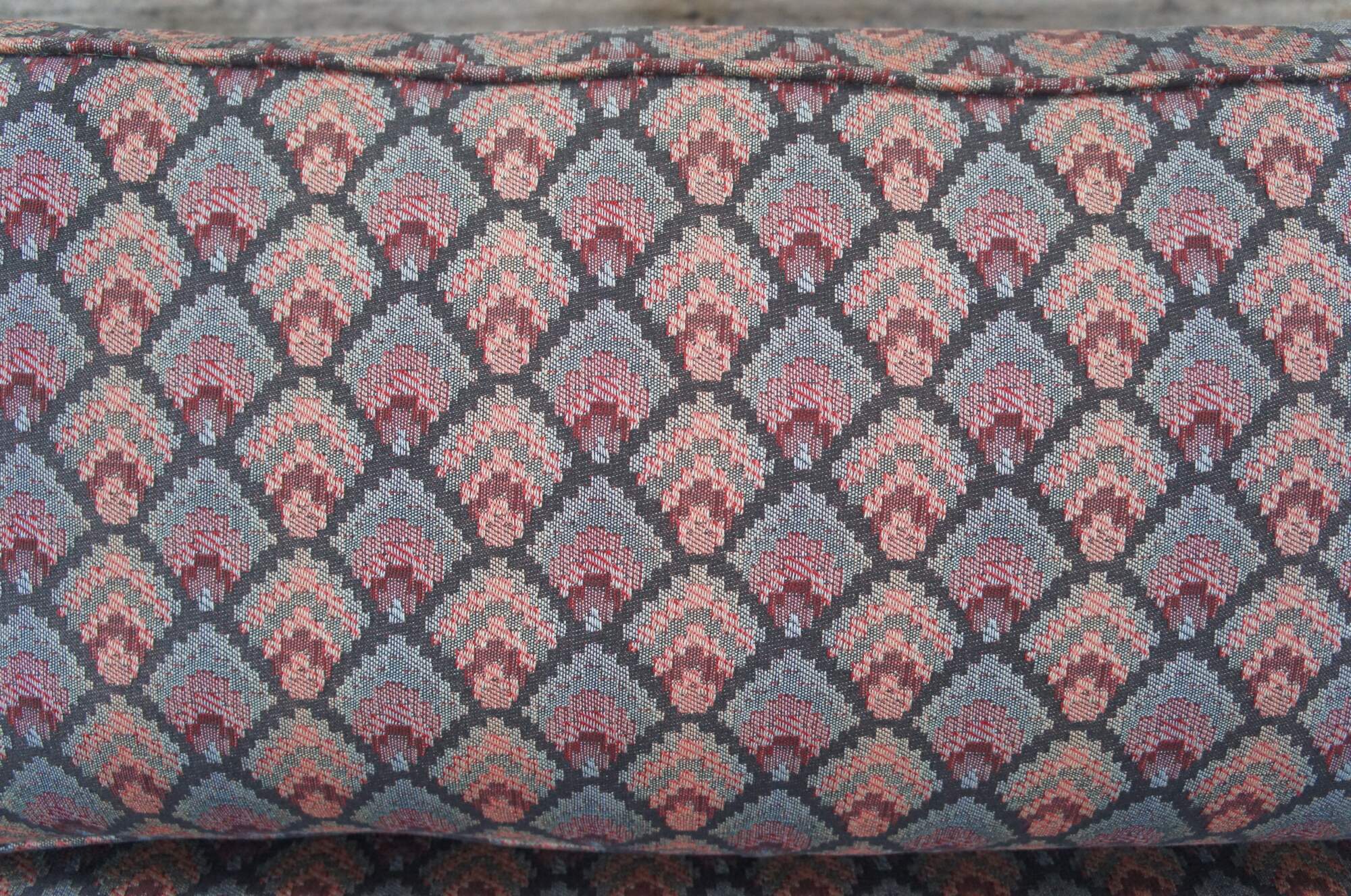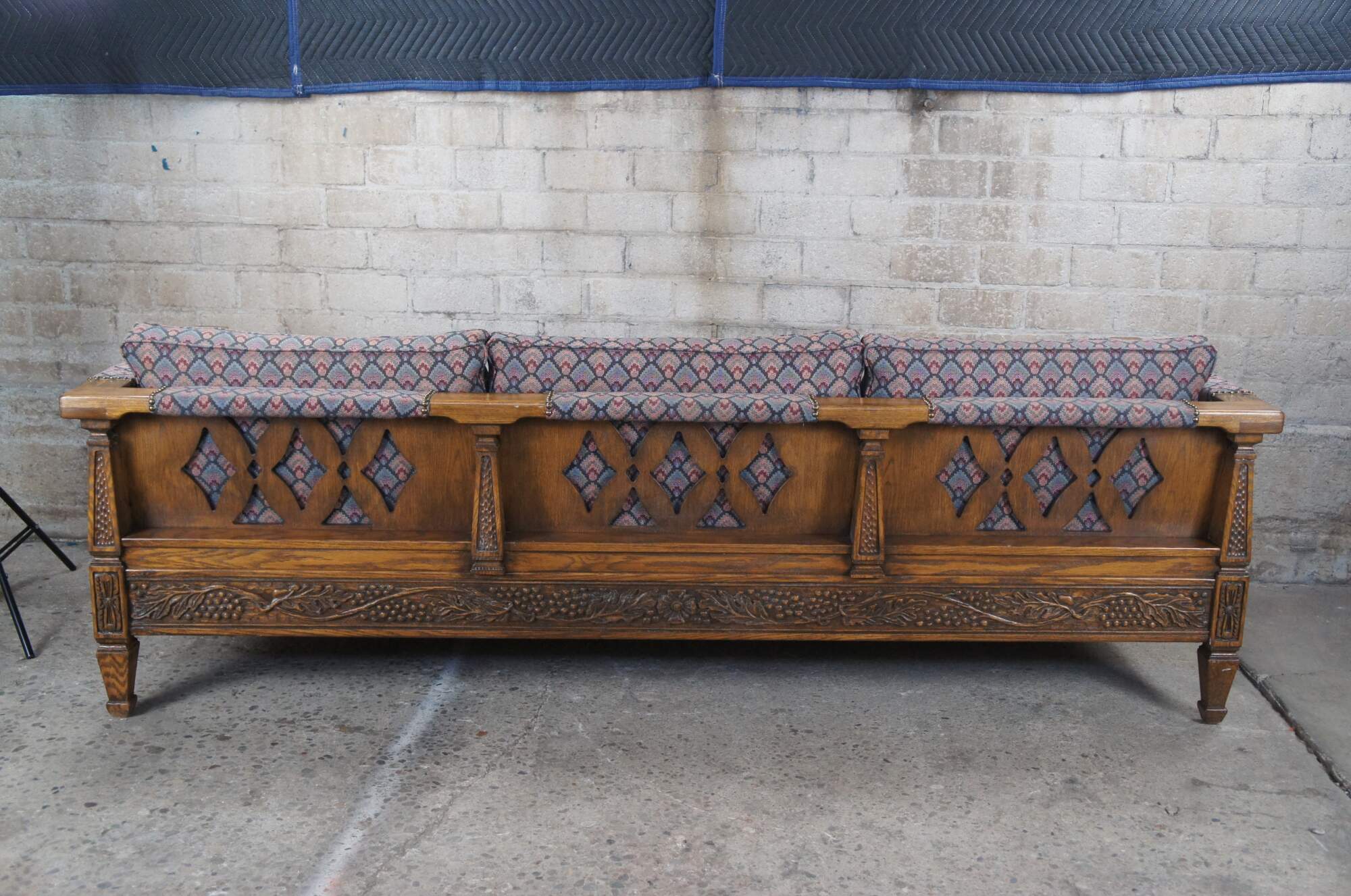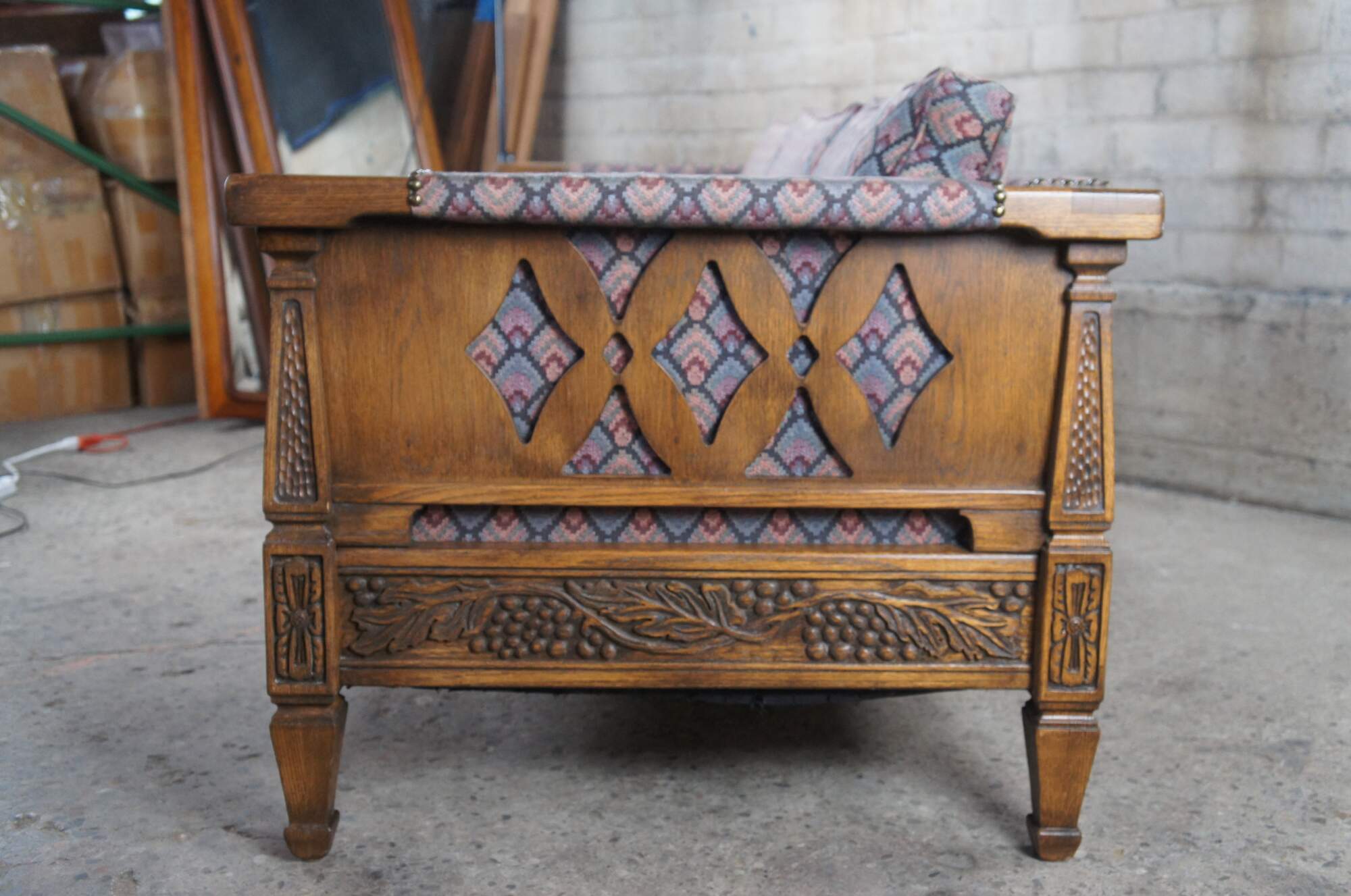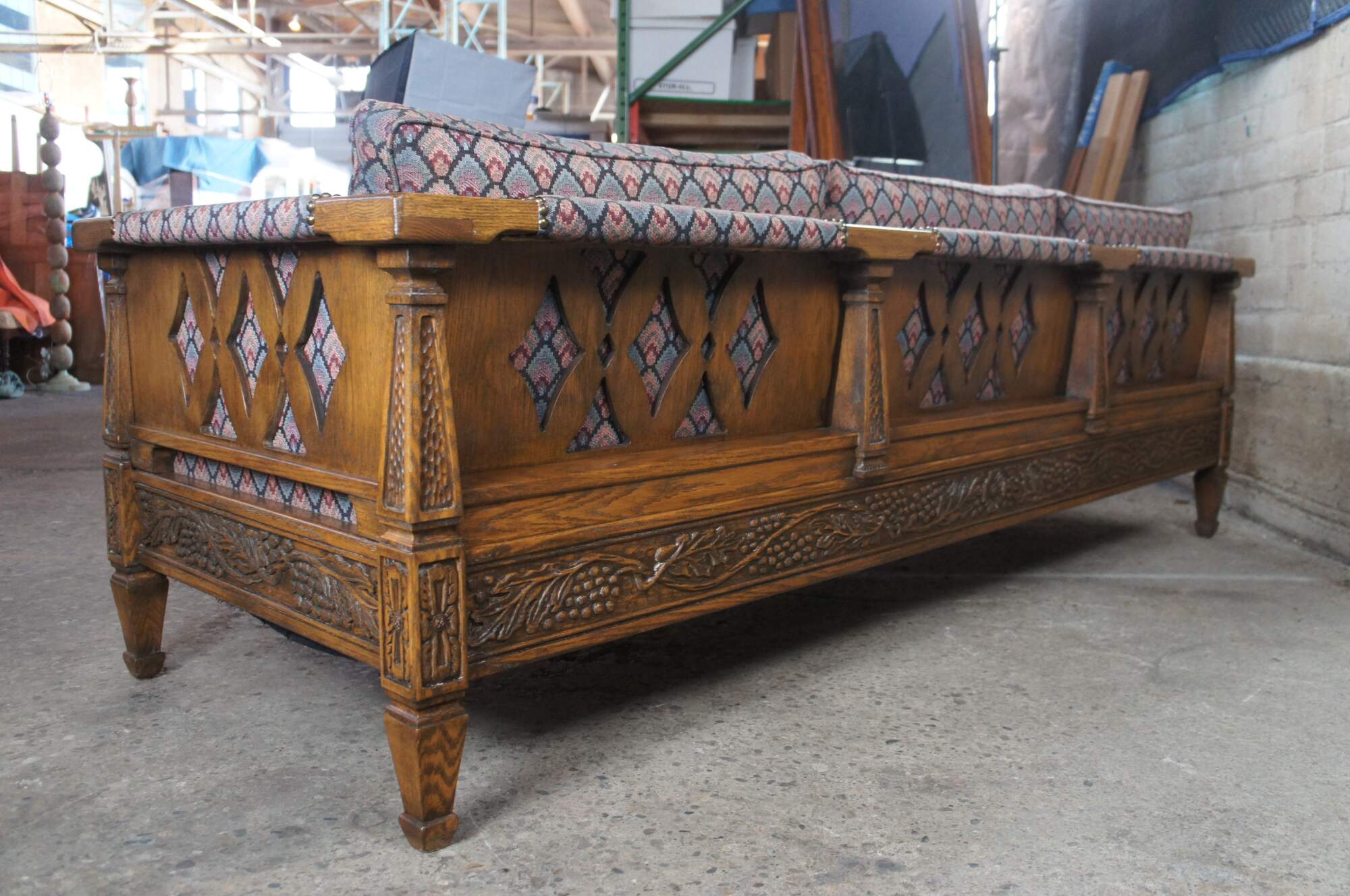 Romweber (R-13490) Viking Oak three seat sofa / couch, circa 1984. Features rectangular carved oak frame with grapevine motif, tooled pillars and floral embellishments. Upholstered in a retro fan pattern with nail head trim along the arms. Outer sides and back have a diamond pattern cutout. The frame is raised over square tapered legs. An iconic piece from the mid century era that is great for office, home or library use.