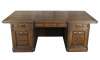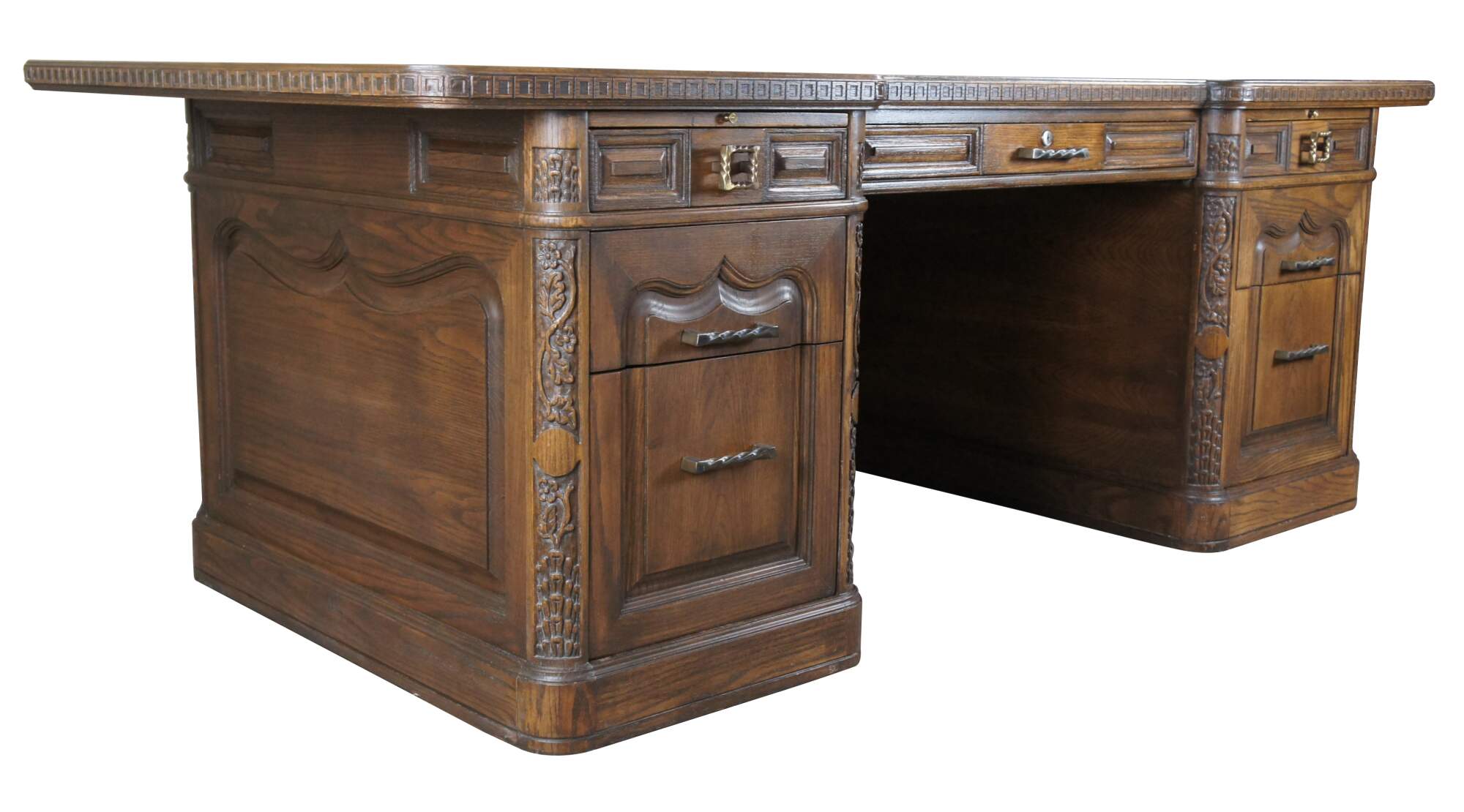 Romweber (R-10975) Viking Oak Executive Desk circa 1980s. Features a large oak top with bowtie (butterfly joint) dovetailing and square carved edge. The top overhangs along the sides and front. The base of the desk has shapely Nordic inspired moldings and foliate carved details. There are seven dovetailed drawers, two of which are for file storage and pull out work surfaces. The central drawer includes a pencil or pen tray. Drawers open via twisted brass hardware