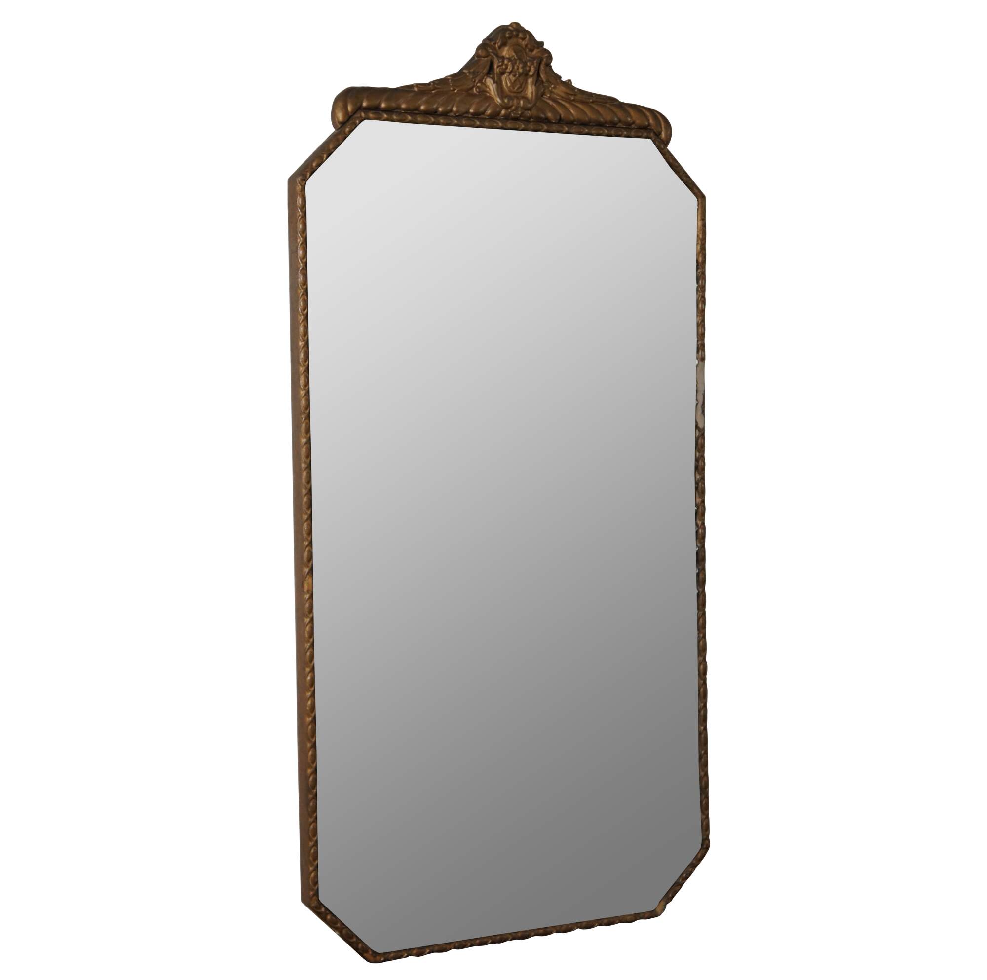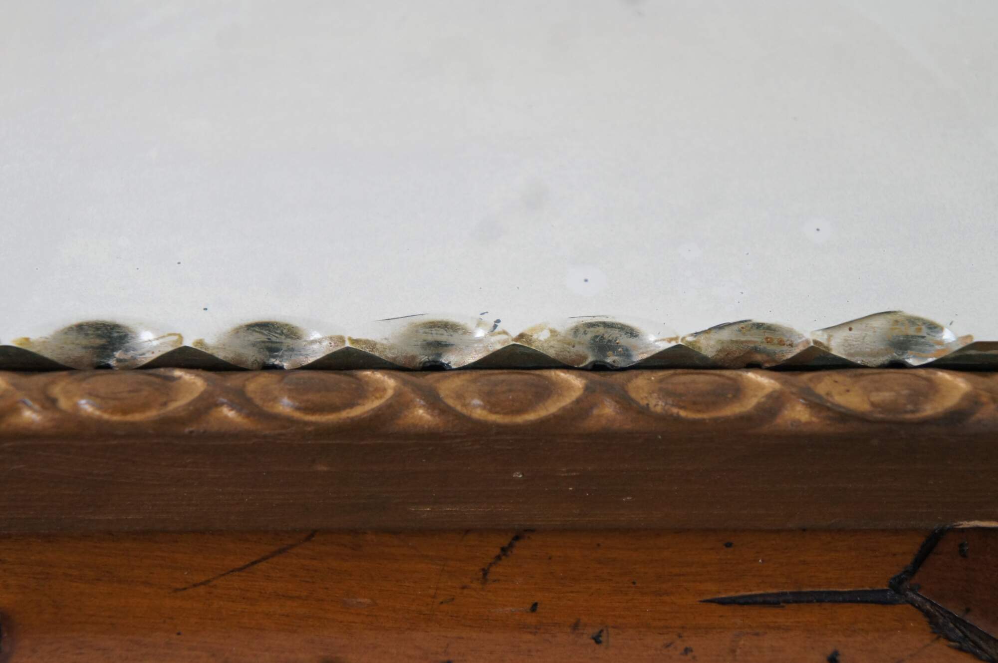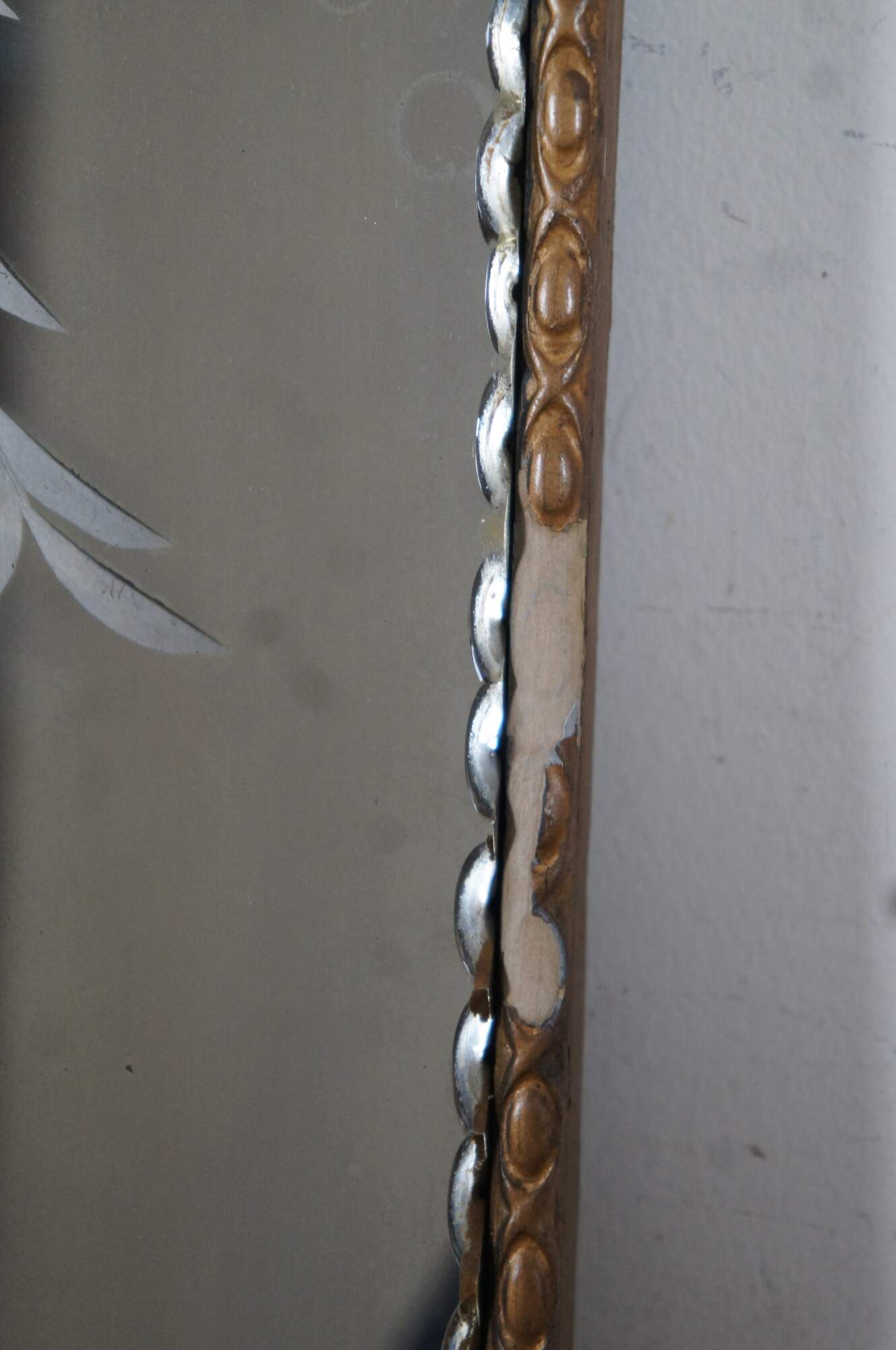 Antique early 20th century art deco wall mirror by the H. Neuer Glass Company of Cincinnati, Ohio – features a rectangular form with octagonal cut corners and a scalloped pattern along the edge of the glass, etched with a cascading leafing vine, framed in carved giltwood.
