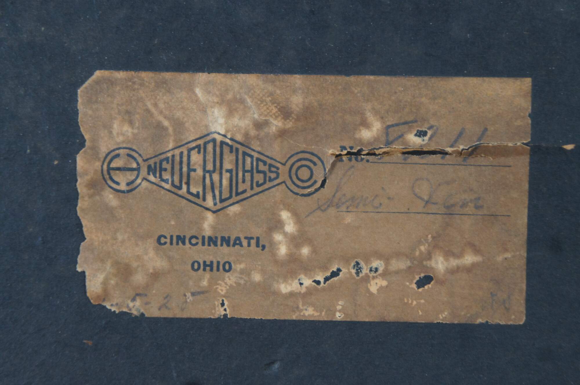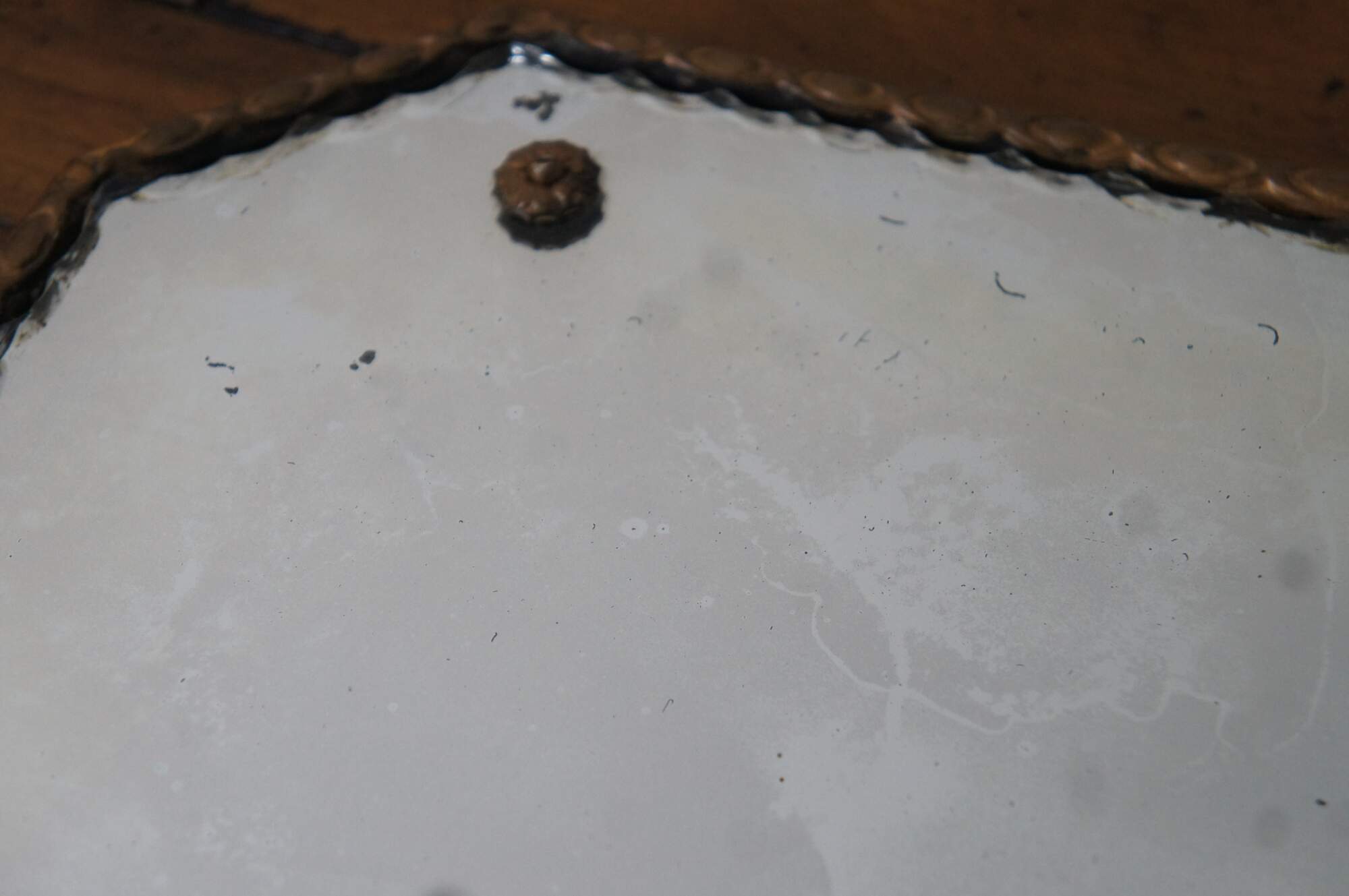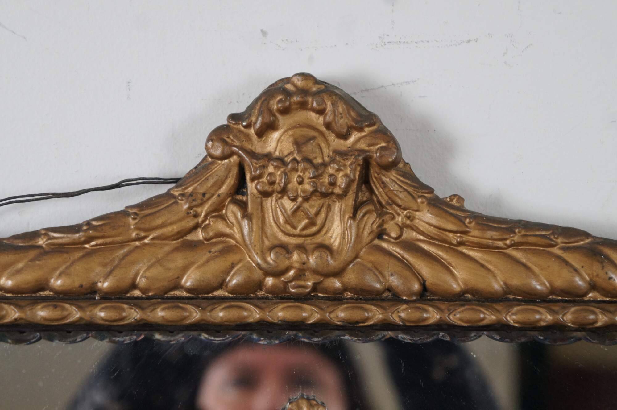 Antique early 20th century art deco wall mirror by the H. Neuer Glass Company of Cincinnati, Ohio – features a rectangular form with octagonal cut corners and a scalloped pattern along the edge of the glass, etched with a cascading leafing vine, framed in carved giltwood.