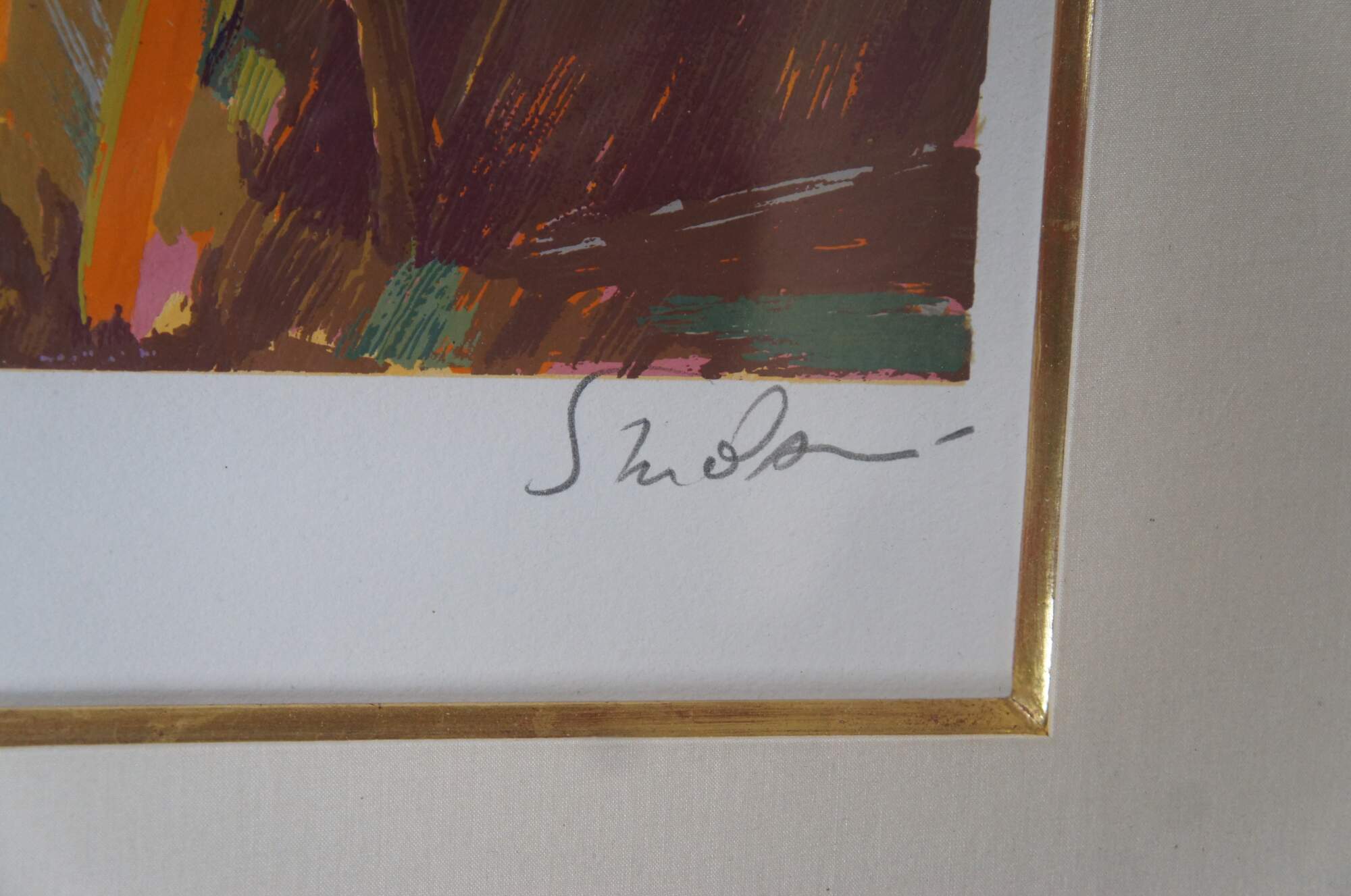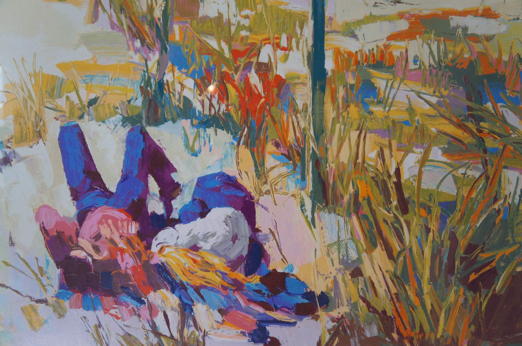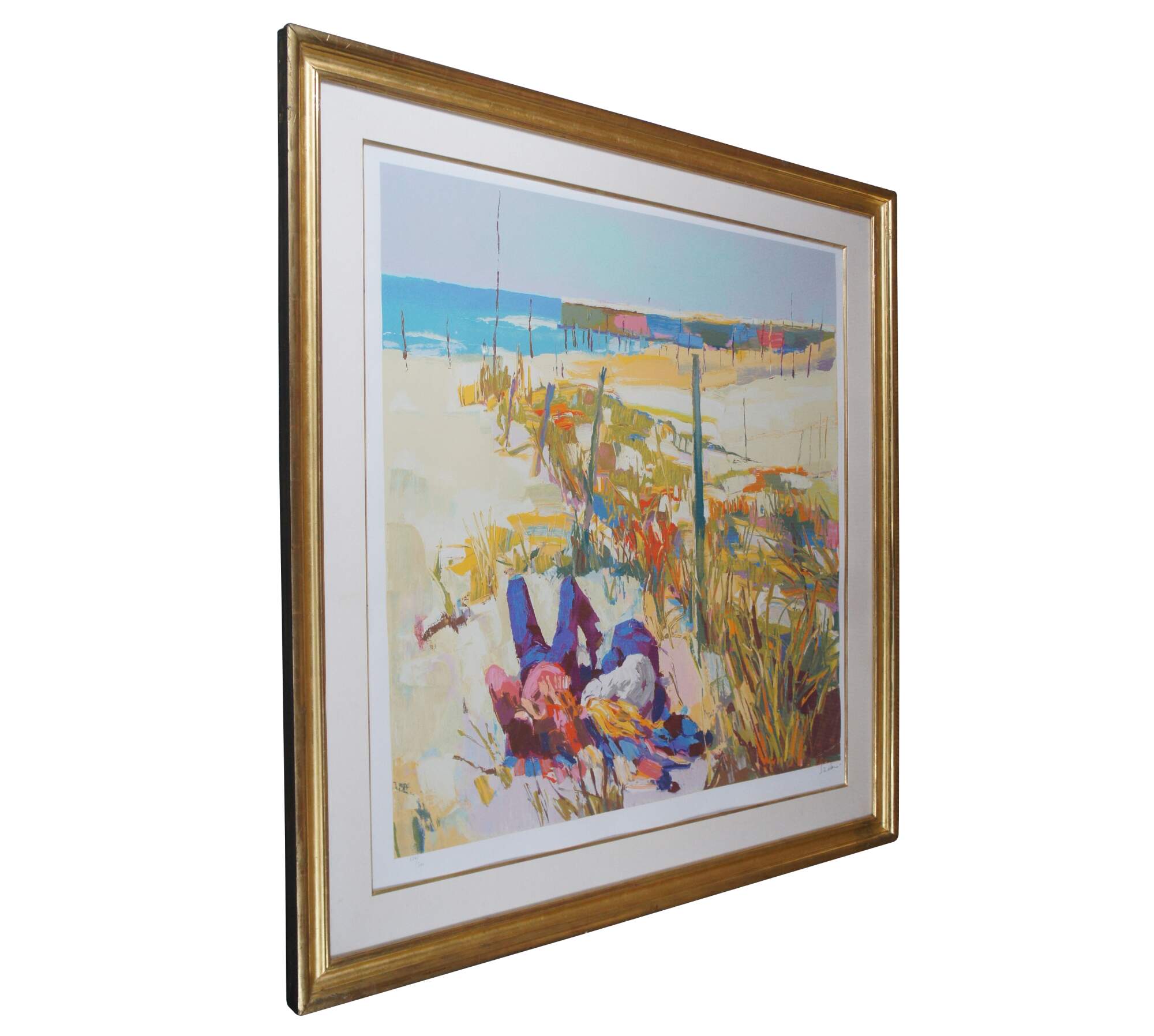 Vintage 1970s limited edition serigraph print by Nicola Simbari, showing a figure of a couple laying at the beach with boats and water in the background; pencil signed and numbered 126/300. “Nicola Simbari is a painter of semi-abstract impressionist works. He is a colorist who favors brilliant tones, richly layered with a palette knife. Simbari paints to convey light and energy and provide new definition through intensity of vision and technique.