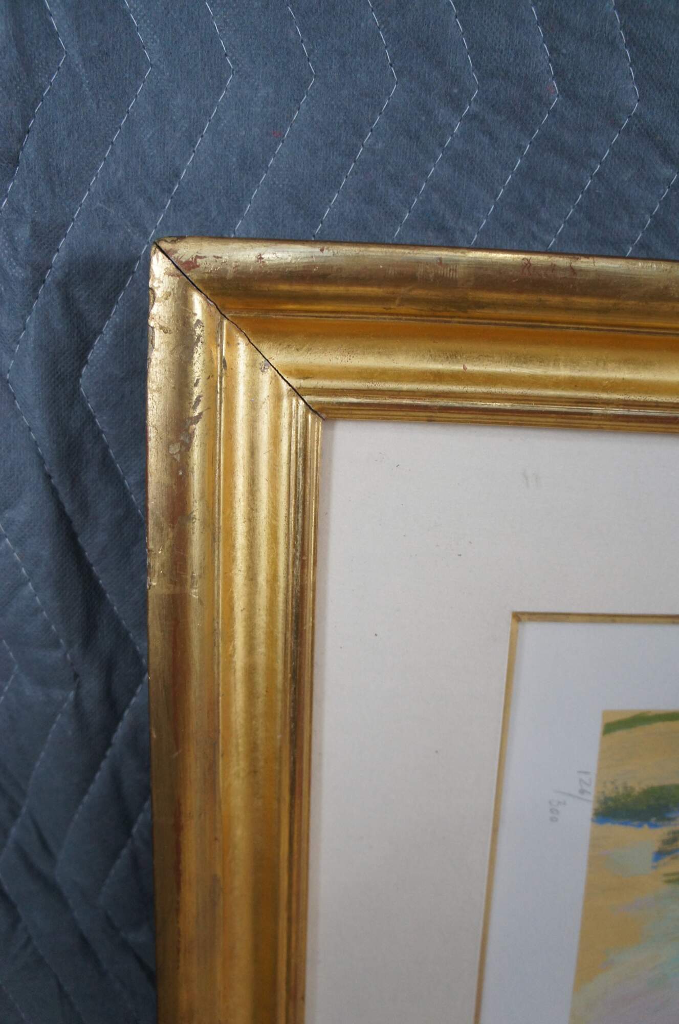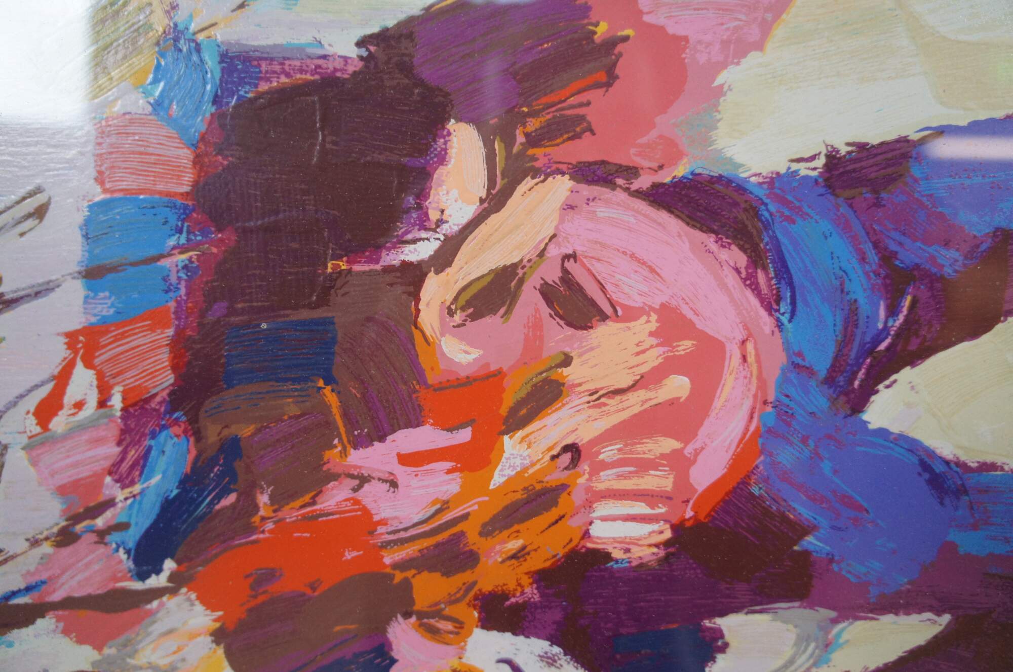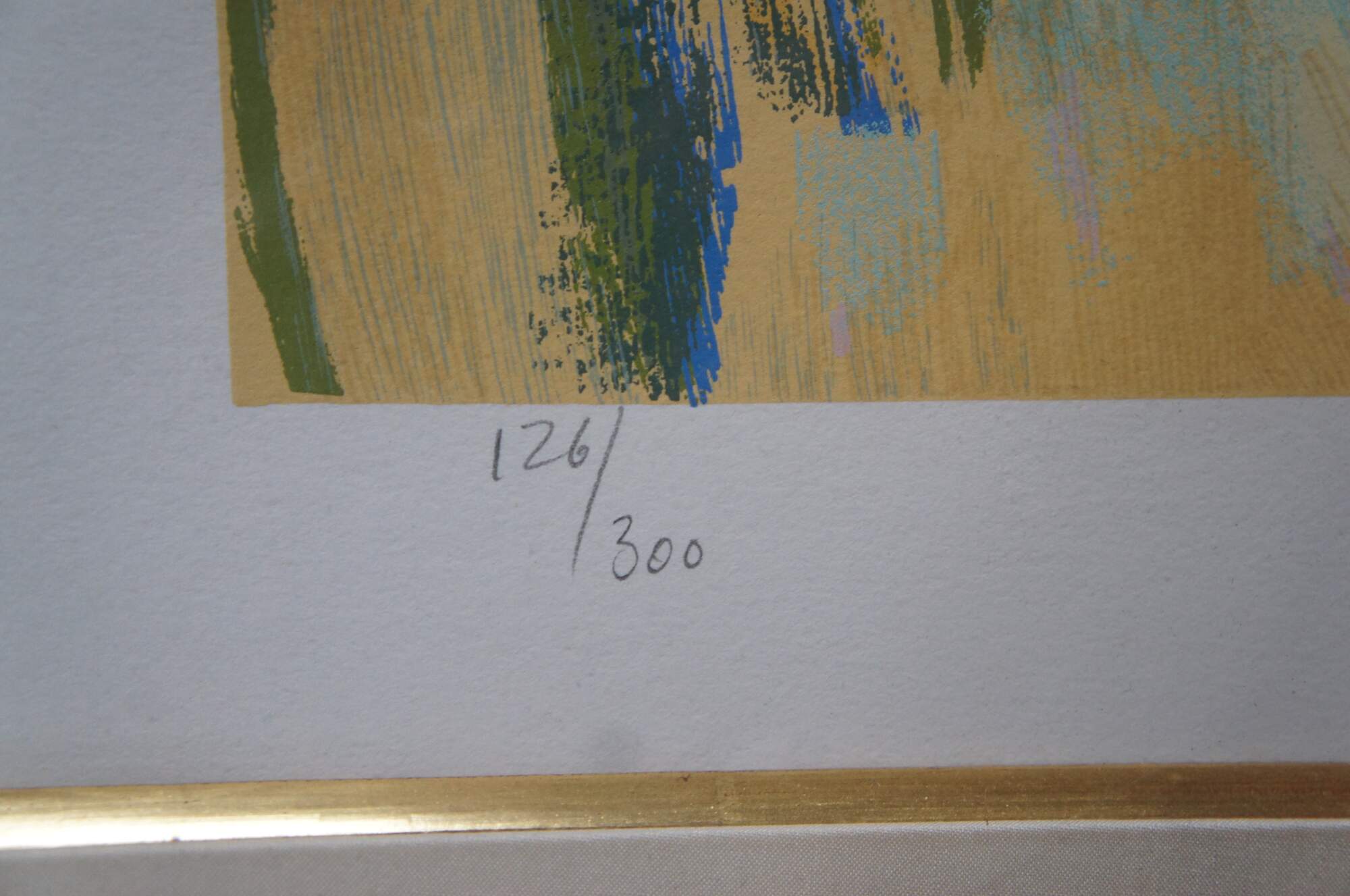 Vintage 1970s limited edition serigraph print by Nicola Simbari, showing a figure of a couple laying at the beach with boats and water in the background; pencil signed and numbered 126/300. “Nicola Simbari is a painter of semi-abstract impressionist works. He is a colorist who favors brilliant tones, richly layered with a palette knife. Simbari paints to convey light and energy and provide new definition through intensity of vision and technique.