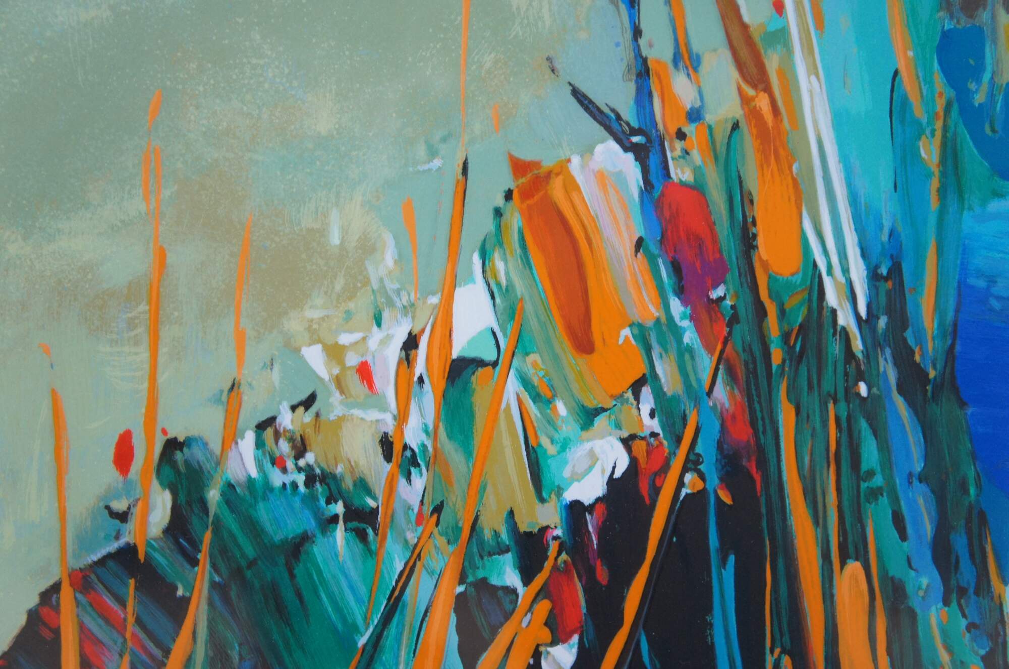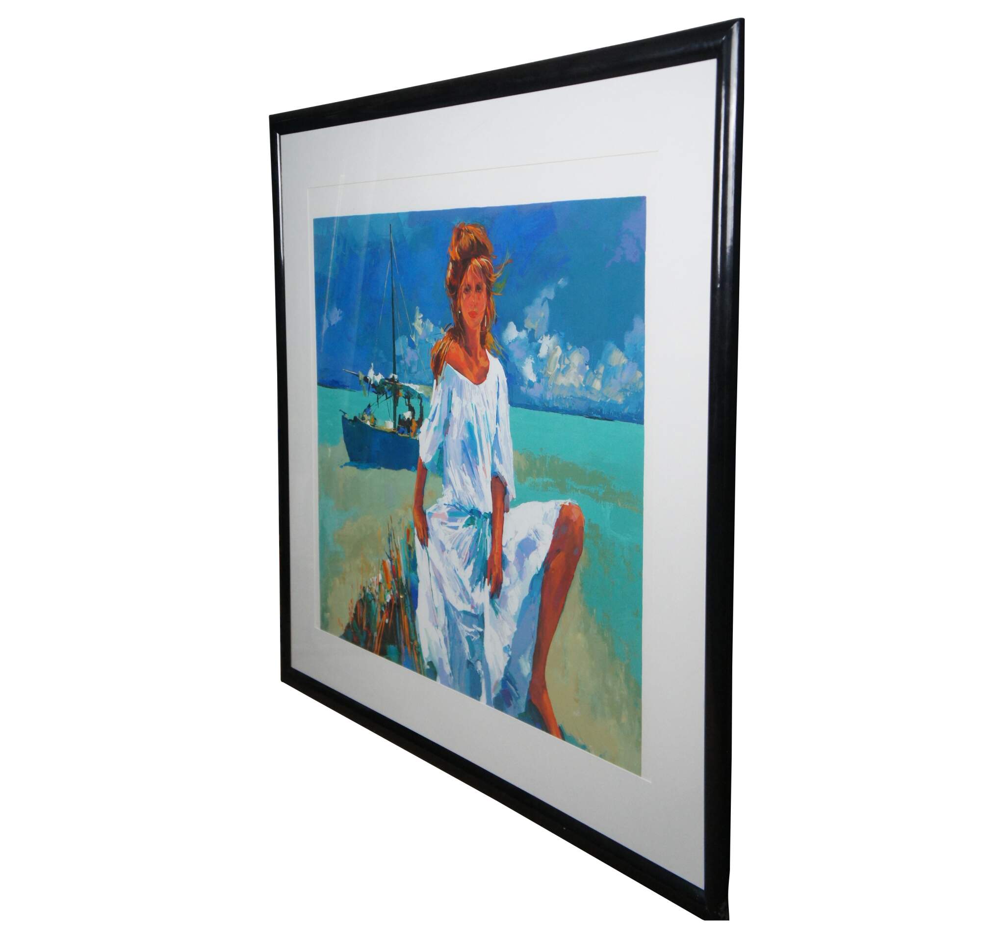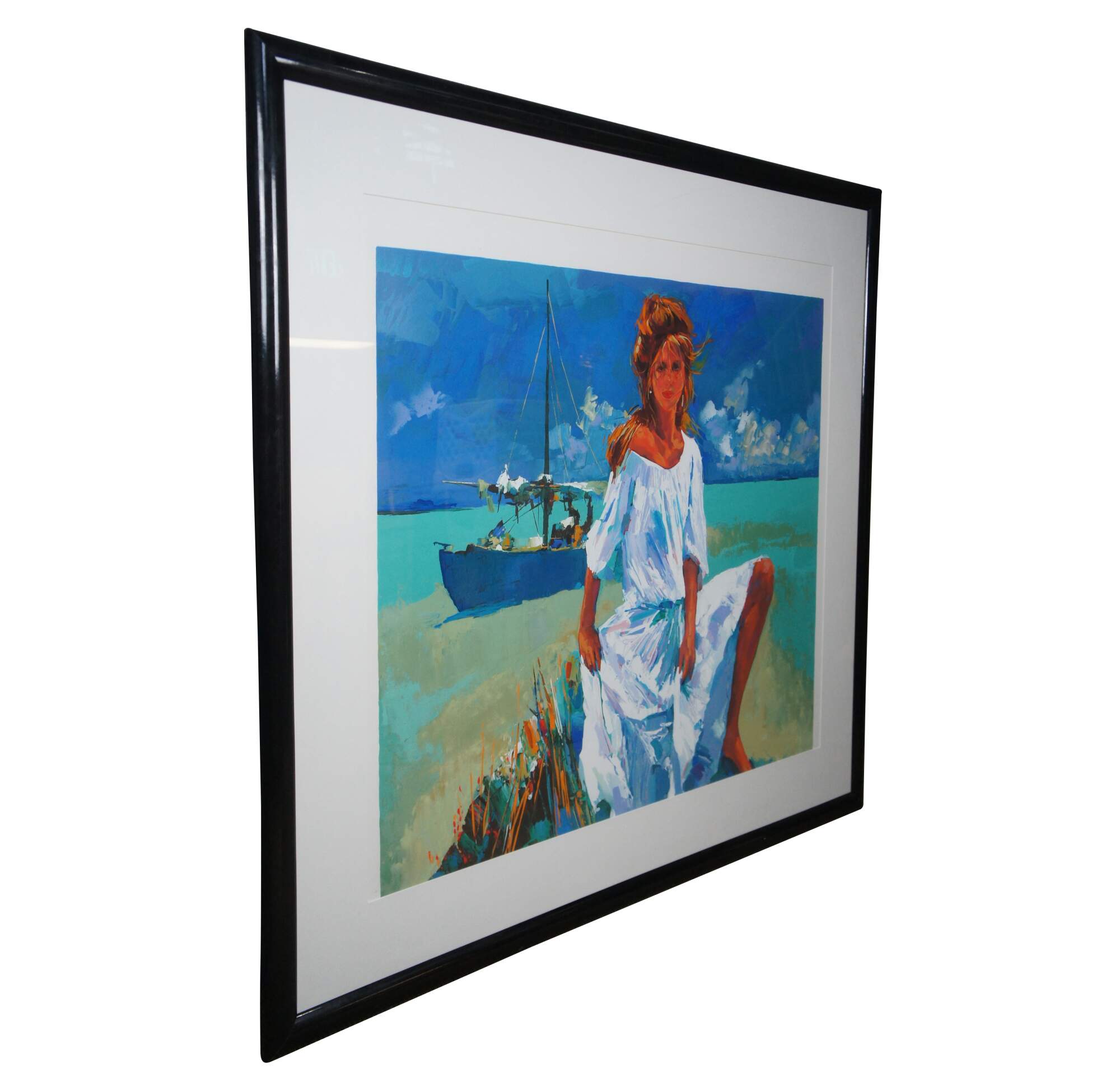Vintage 1970s limited edition serigraph print ""La Belle Aux Maldives"" by Nicola Simbari. The artwork here, ""La Belle Aux Maldives"", is a wonderful depiction of a beautiful female on a rocky seashore, that is saturated with vibrant color and acute detail throughout. Signed lower right. “Nicola Simbari is a painter of semi-abstract impressionist works. He is a colorist who favors brilliant tones, richly layered with a palette knife. Simbari paints to convey light and energy and provide new definition through intensity of vision and technique.