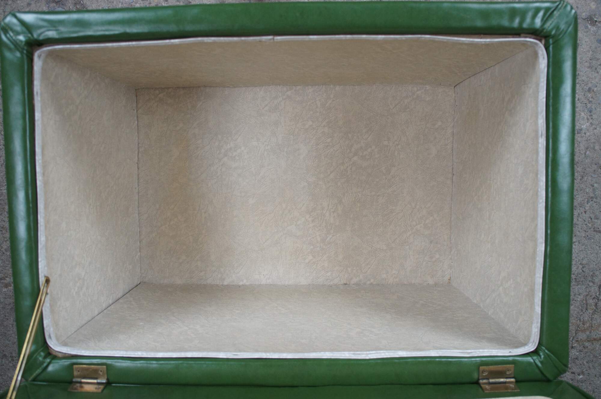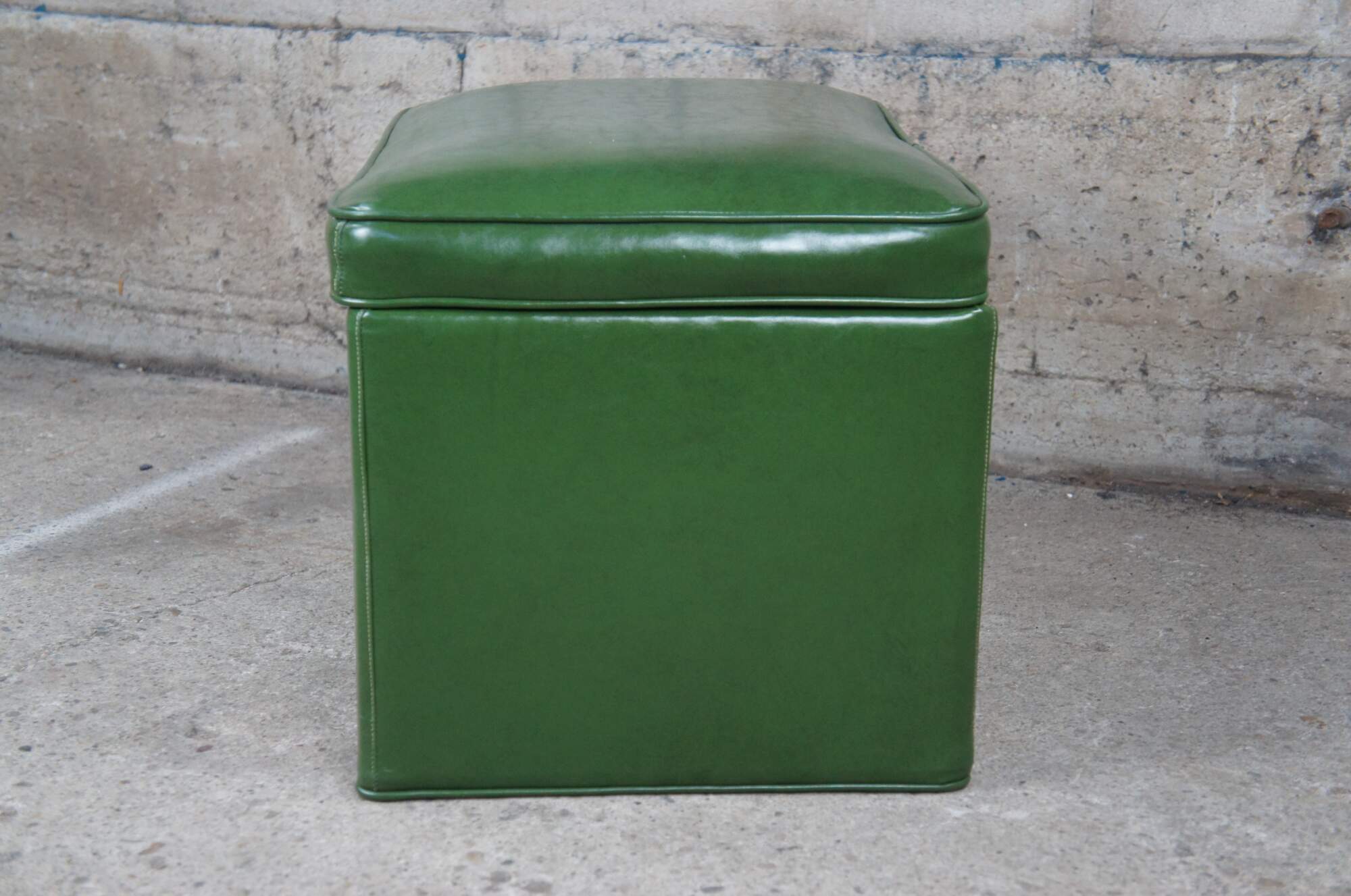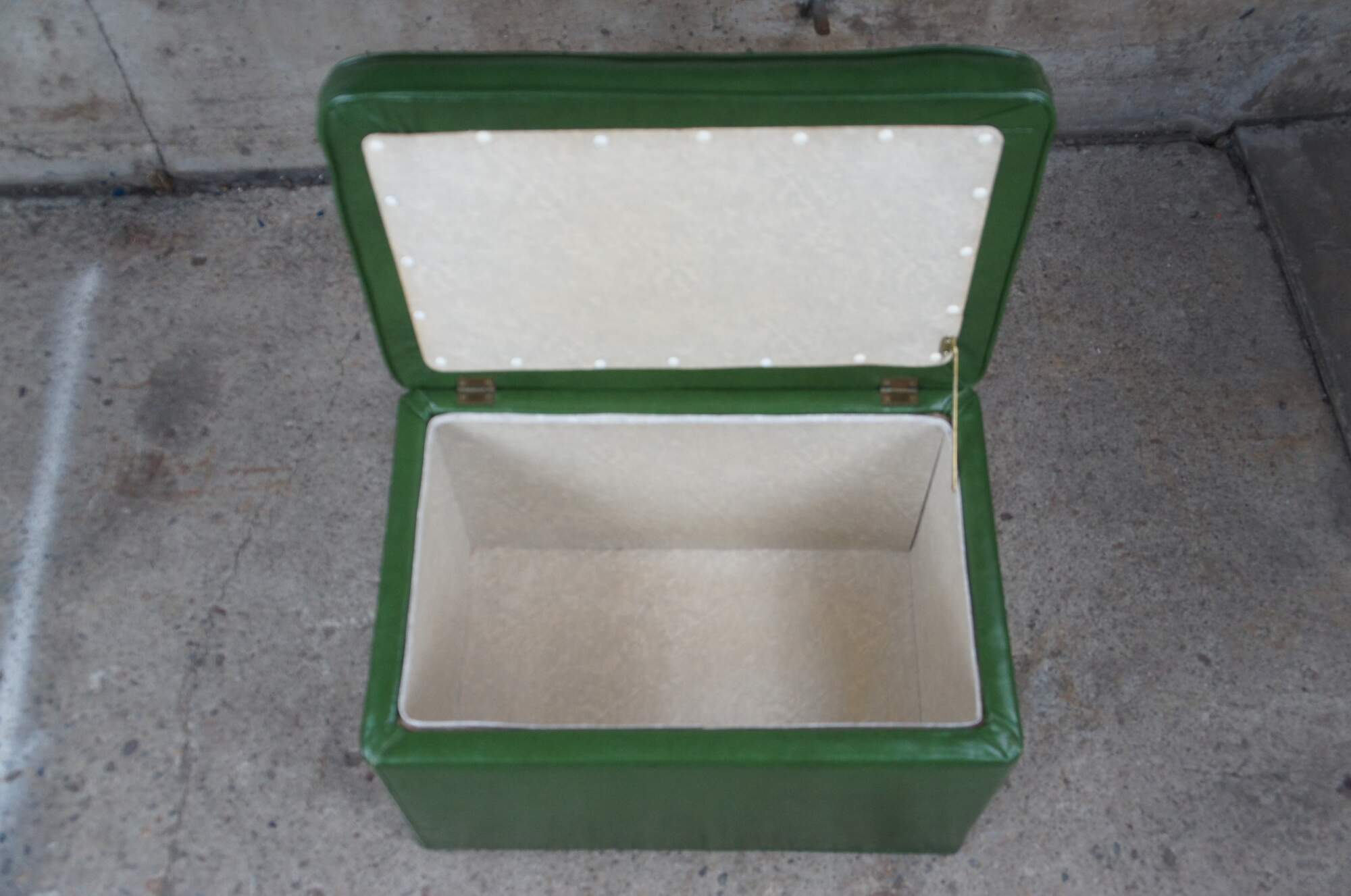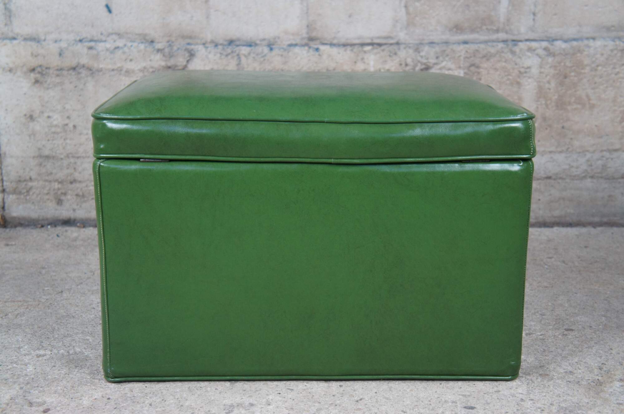 Mid Century green vinyl footstool. A rectangular form with hinged lid opening to accessory storage.