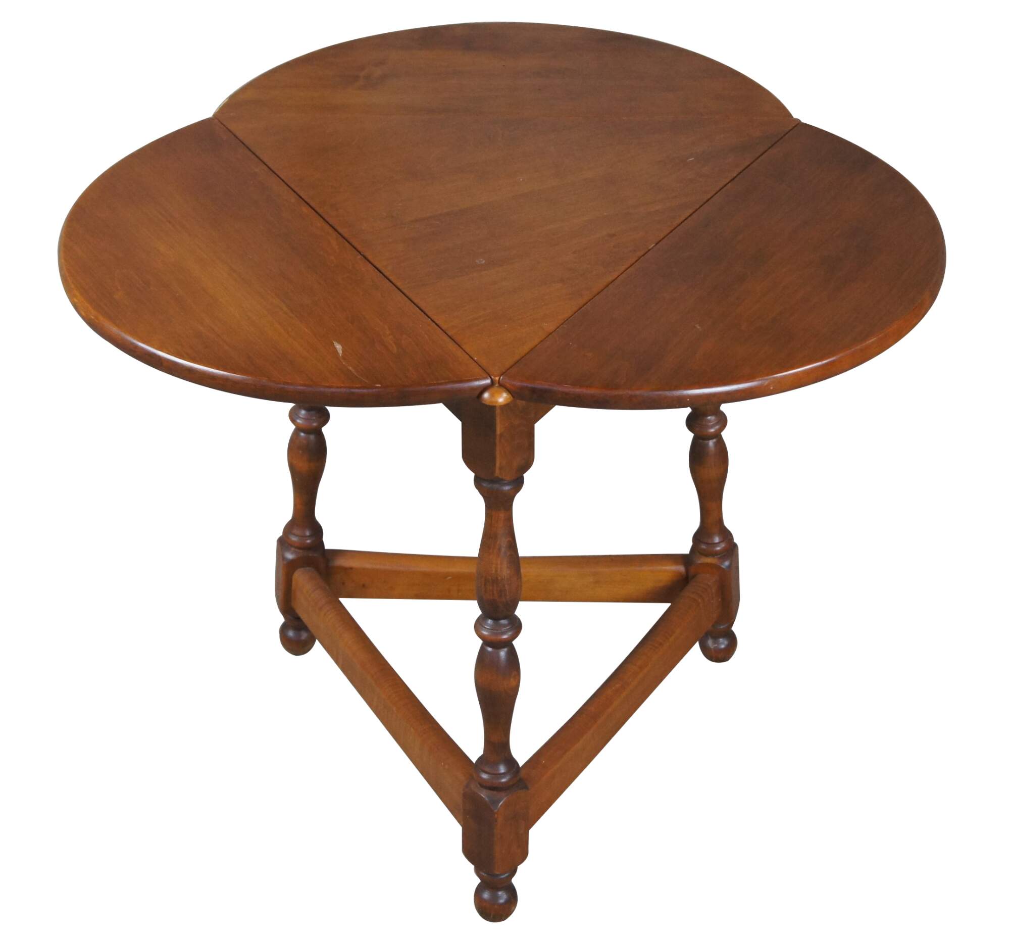 Heywood Wakefield cloverleaf side table 226-08, cinnamon finish. Made from maple with a triangular form over turned spindle legs and bun feet connected by stretchers.