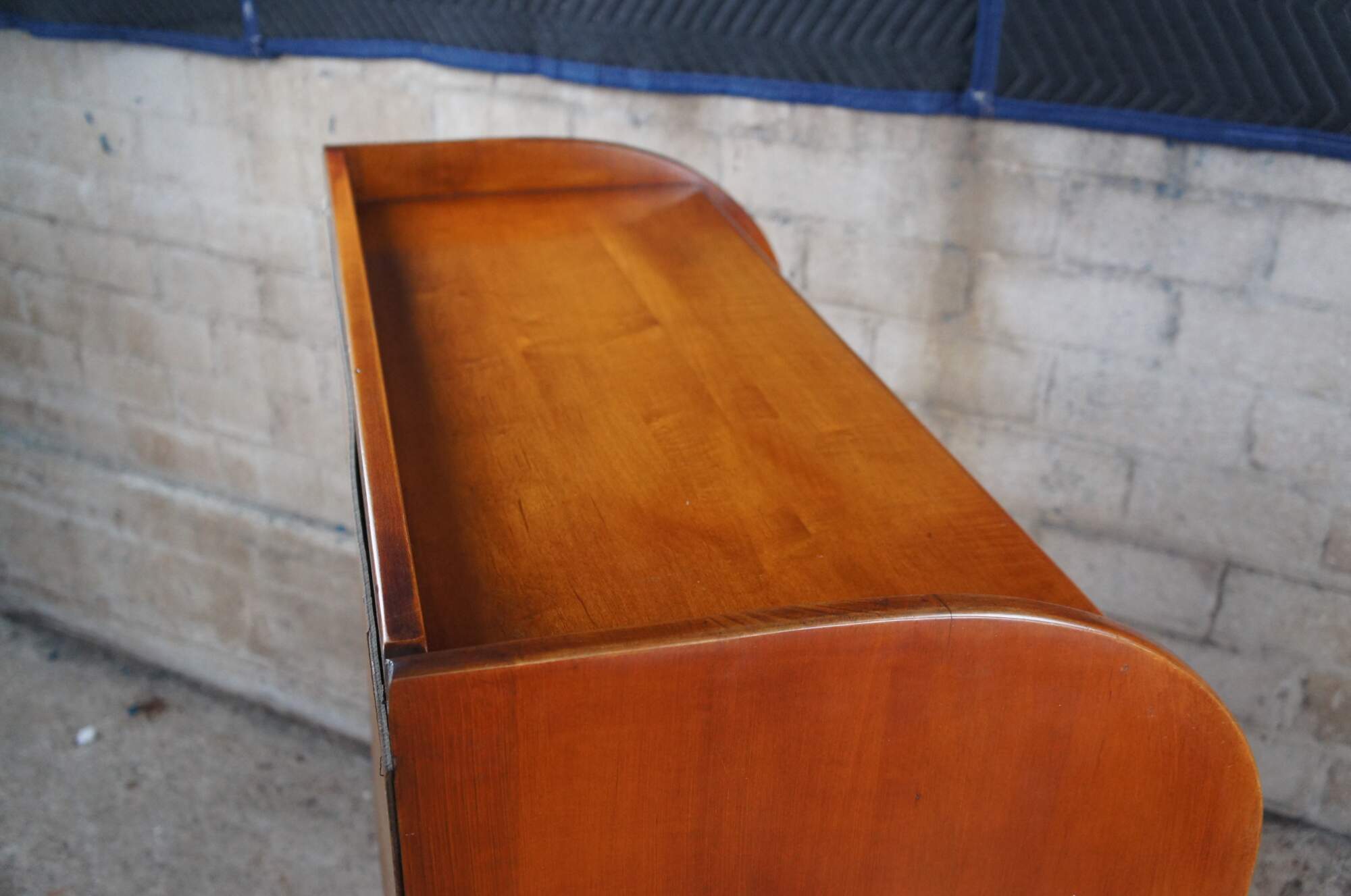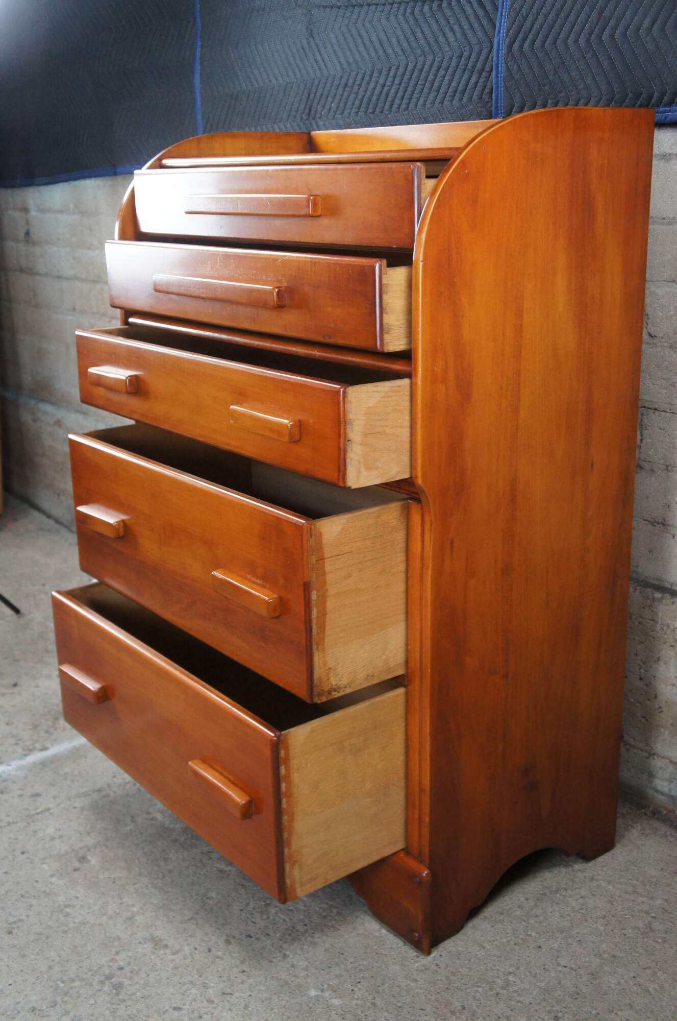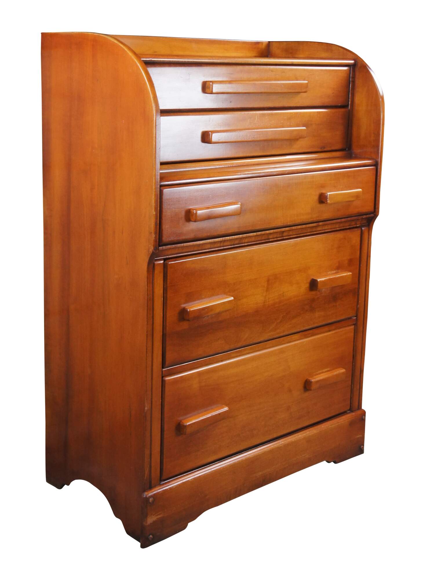 Mid Century Modern Tallboy dresser. Reminiscent of a secretary. Made from Maple with five dovetailed drawers and wooden handles. Attributed to Heywood Wakefield