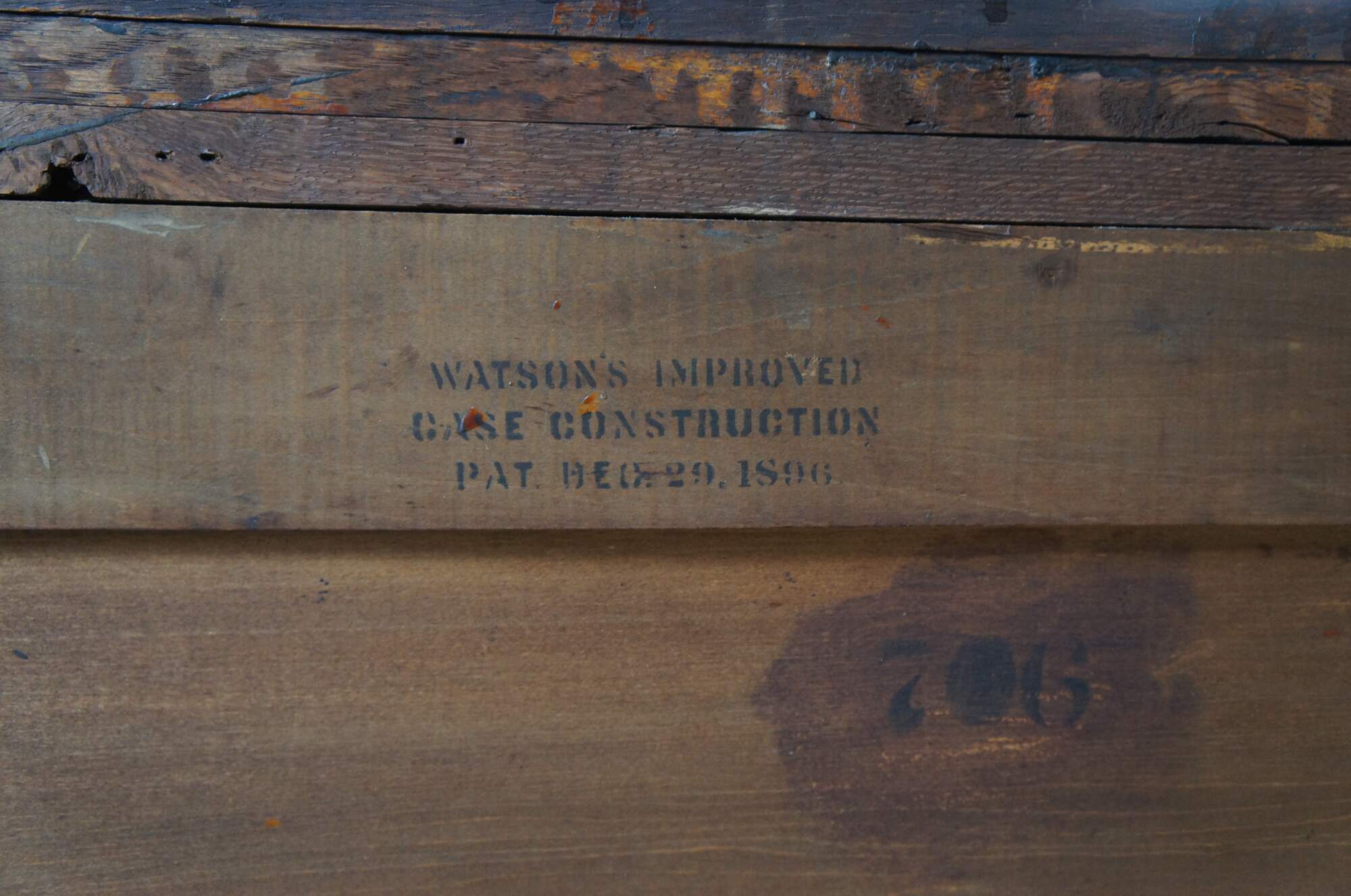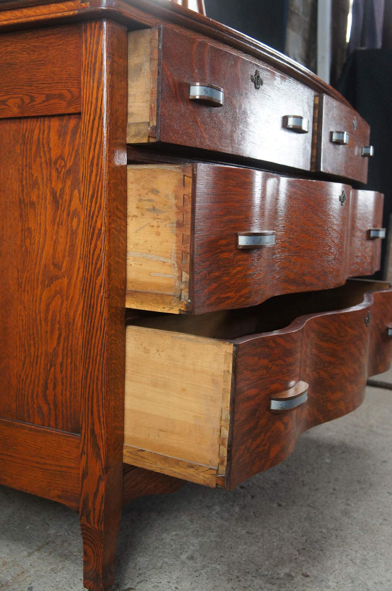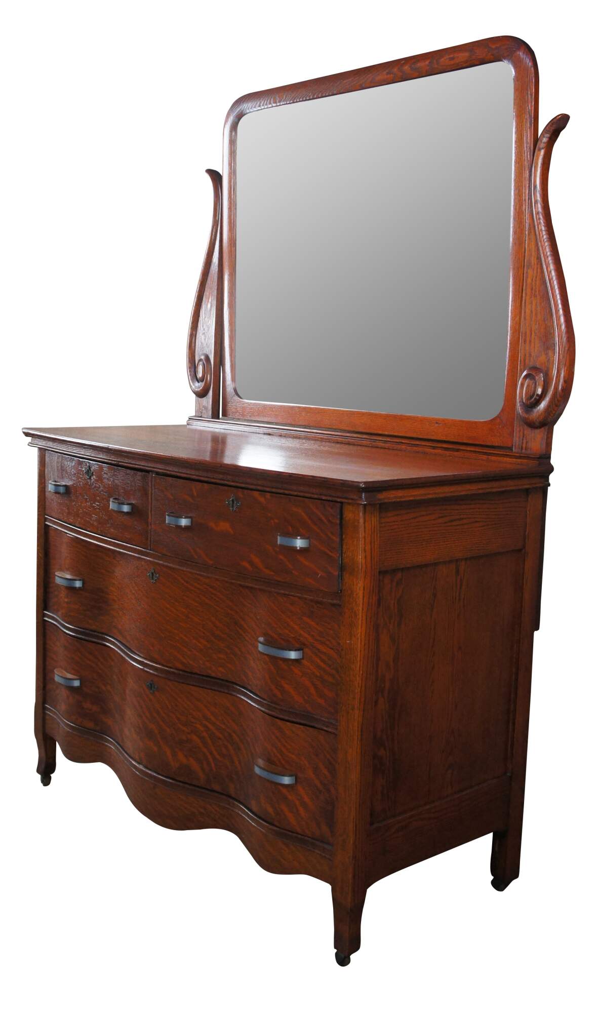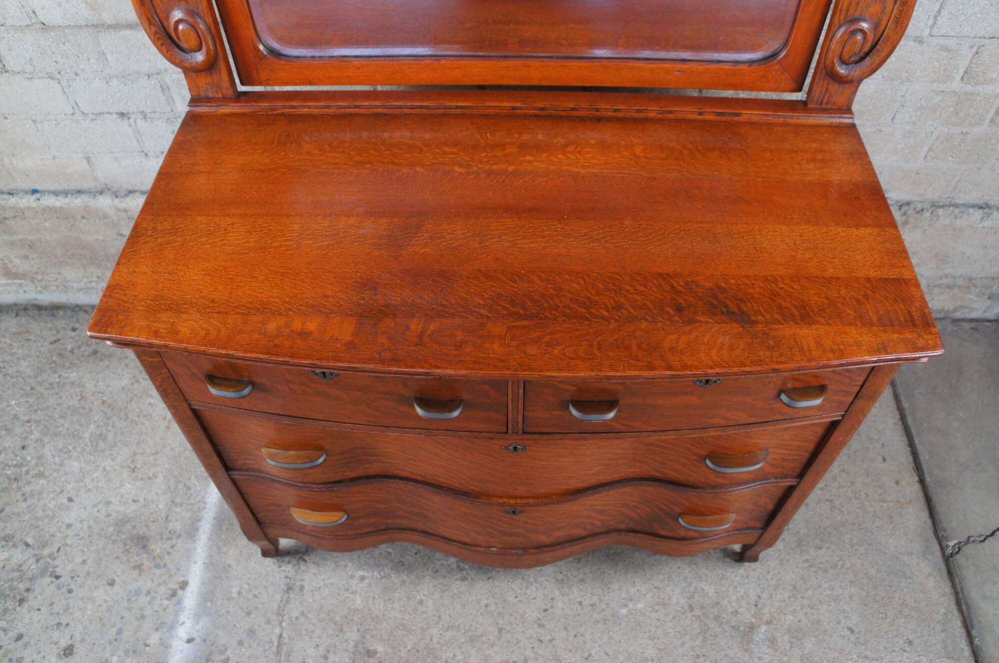 Late 19th Century oxbow chest and wishbone mirror. Features a two over two drawer format with dovetailed drawers and an adjustable mirror. The case is supported by flared legs over casters. Marked Watson's Improved Case Construction along backside. Pat Dec. 29, 1896