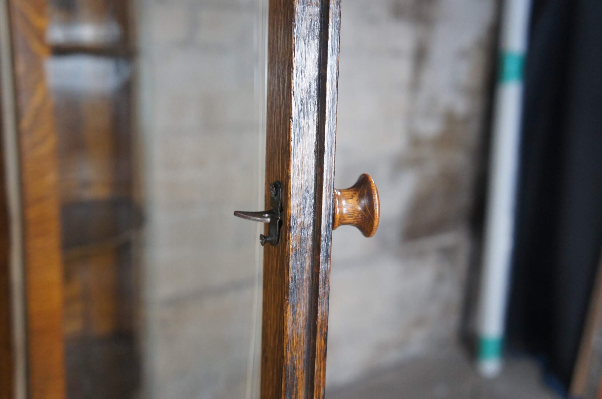 Antique Victorian Era American Empire demilune curved glass curio cabinet. Made from quartersawn oak with scrolled accents along the front leading to scrolled feet over casters.. Includes four shelves with plate groves and a mirror along the top.