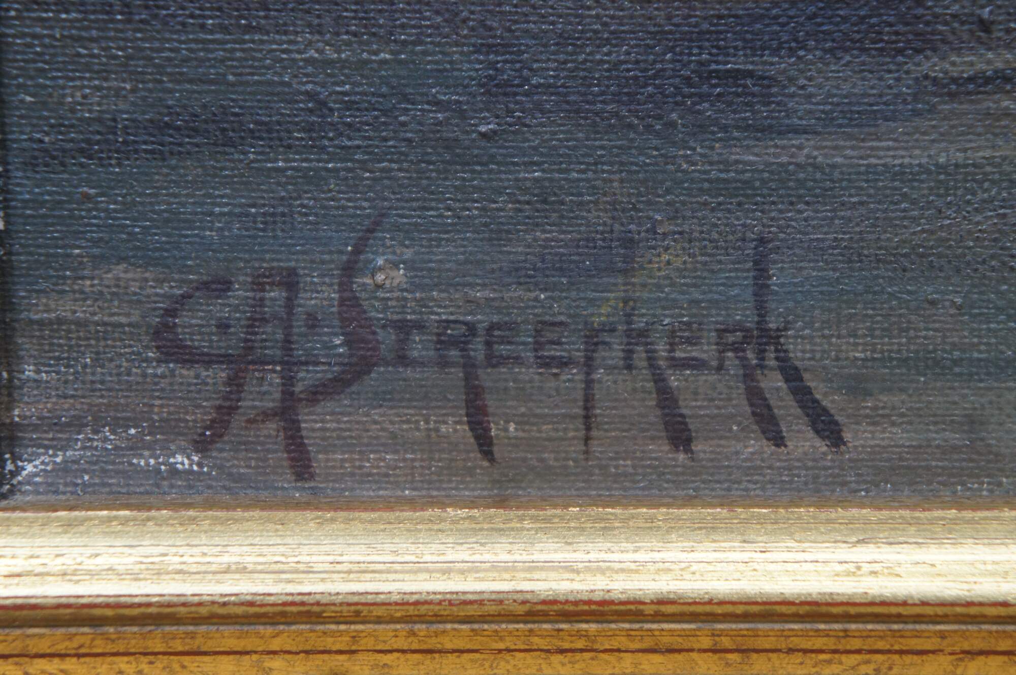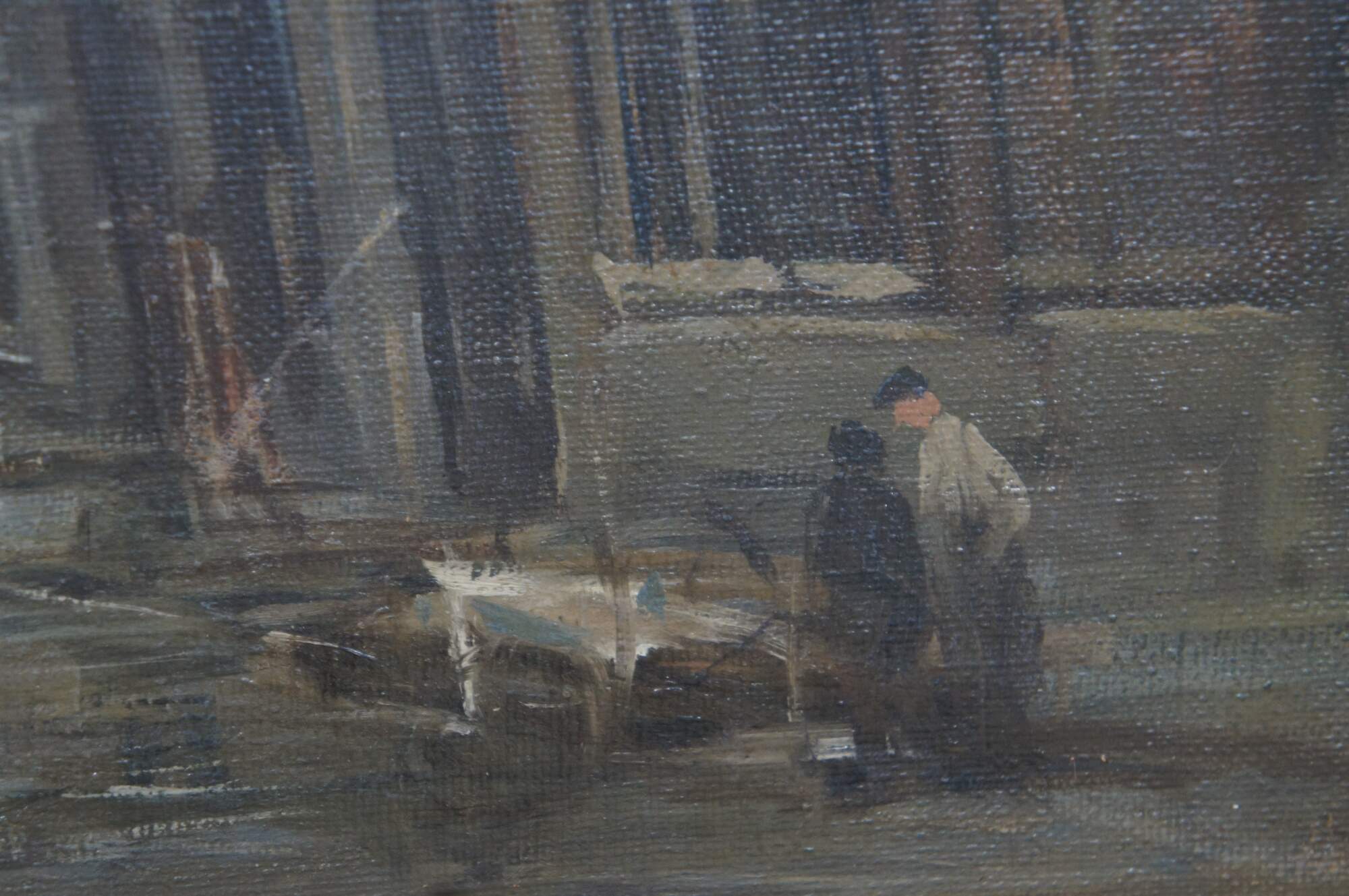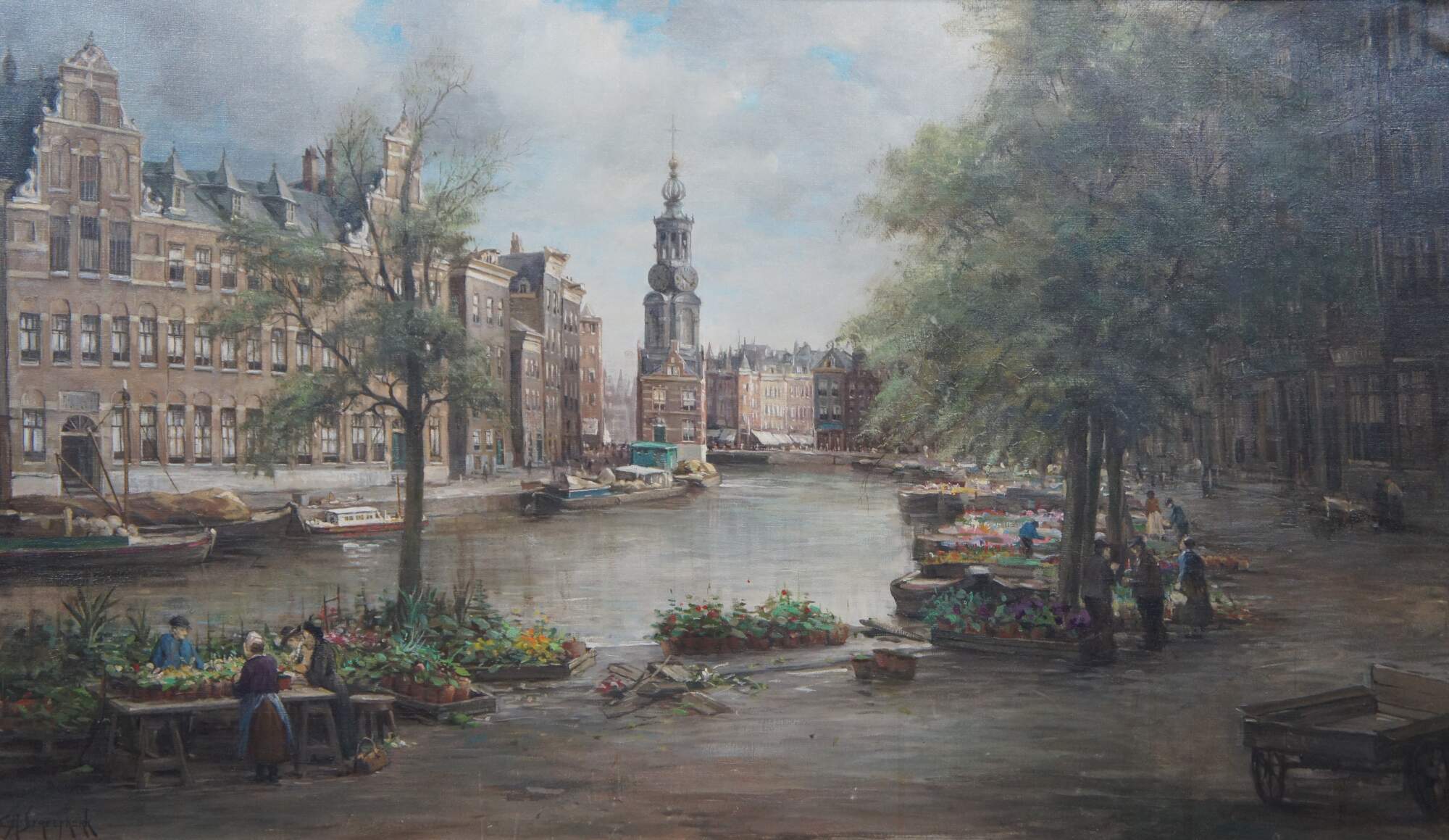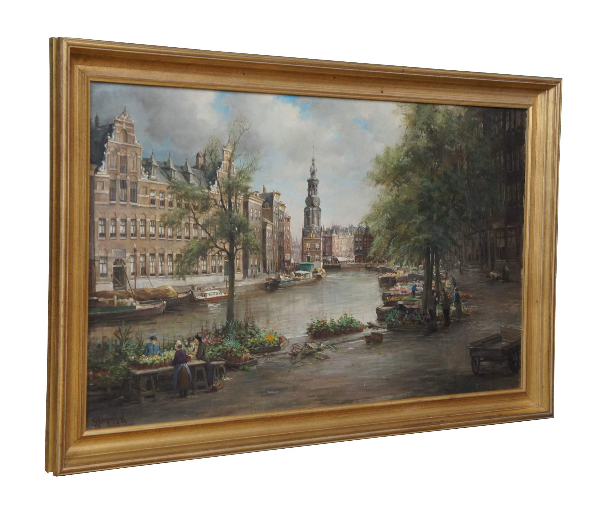Early to mid 20th century oil on canvas painting by Carl August Streefkerk (Dutch, 1884-1968) showing a view of Amsterdam’s Bloemenmarkt (Flower Market) along the Singel Canal with the Munttoren (aka Munt) tower visible in the background. Carl August Streefkerk (1884 - 1968) was active/lived in Netherlands.