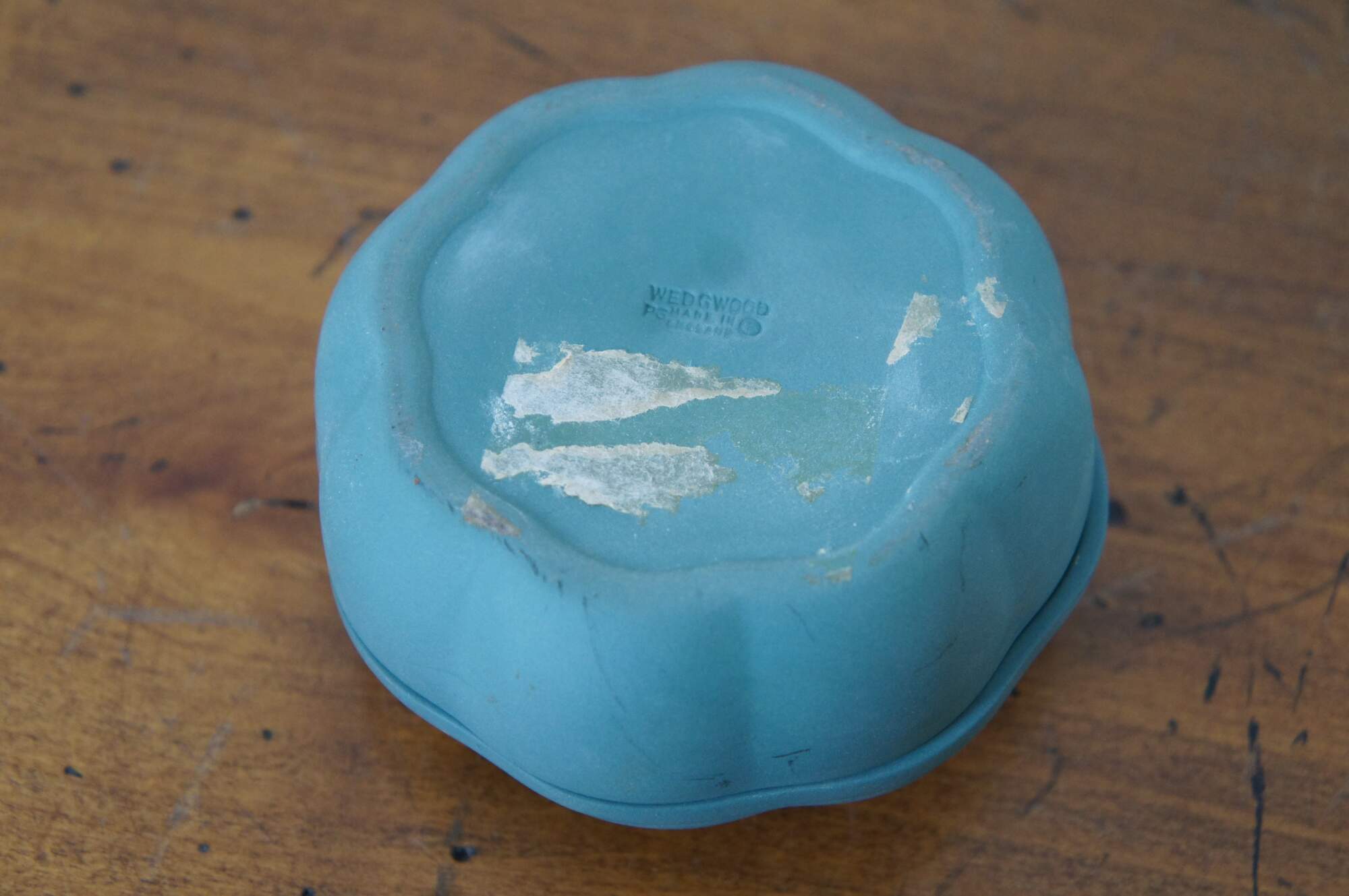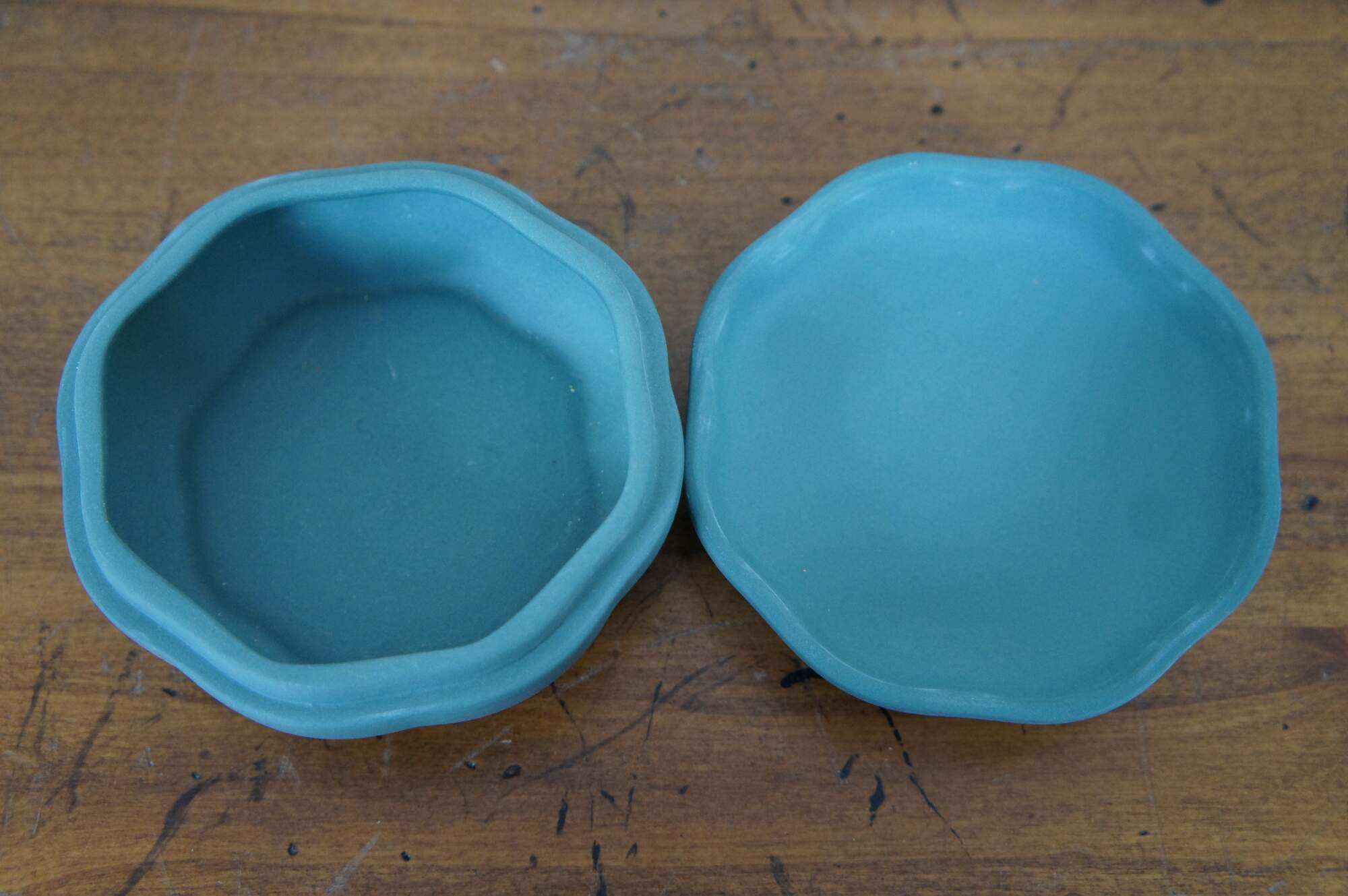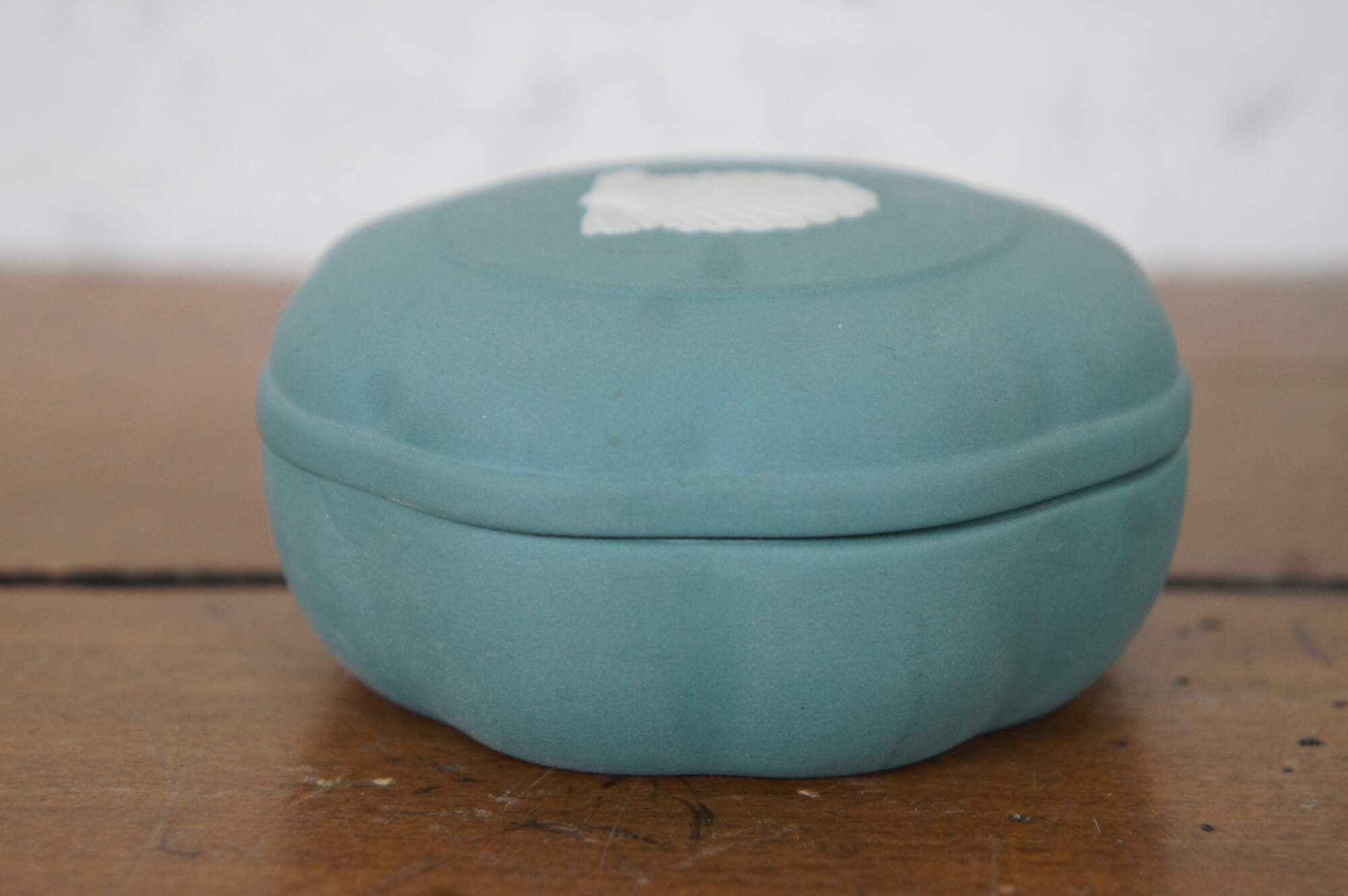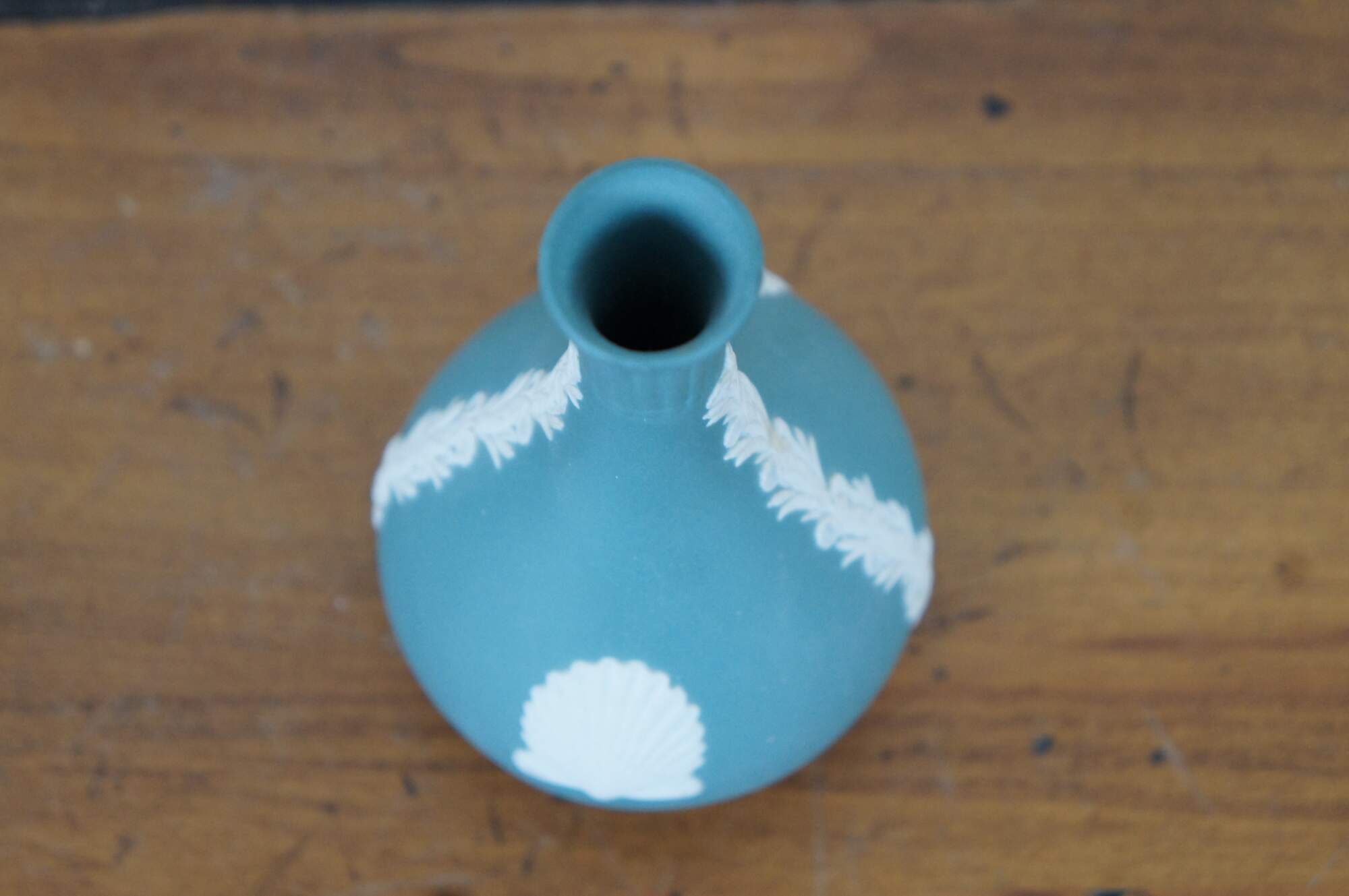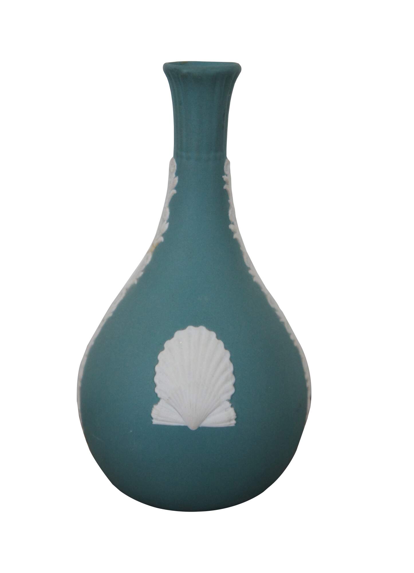 Pair of Rare Wedgwood white on teal green Jasperware pieces, decorated with base relief scallop shells, one bud vase and one round, scalloped trinket box.