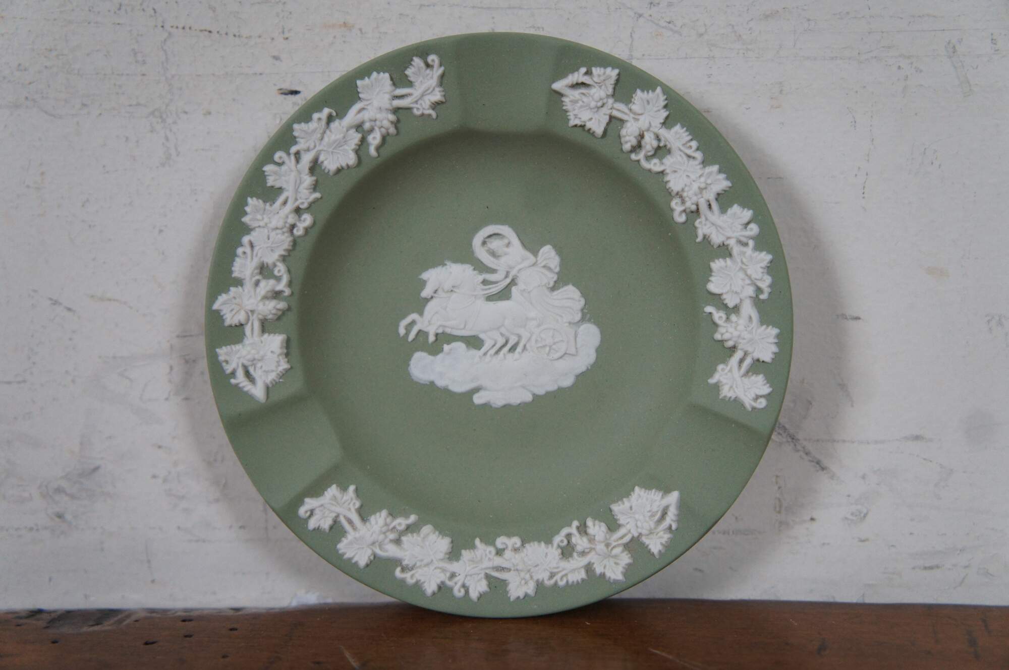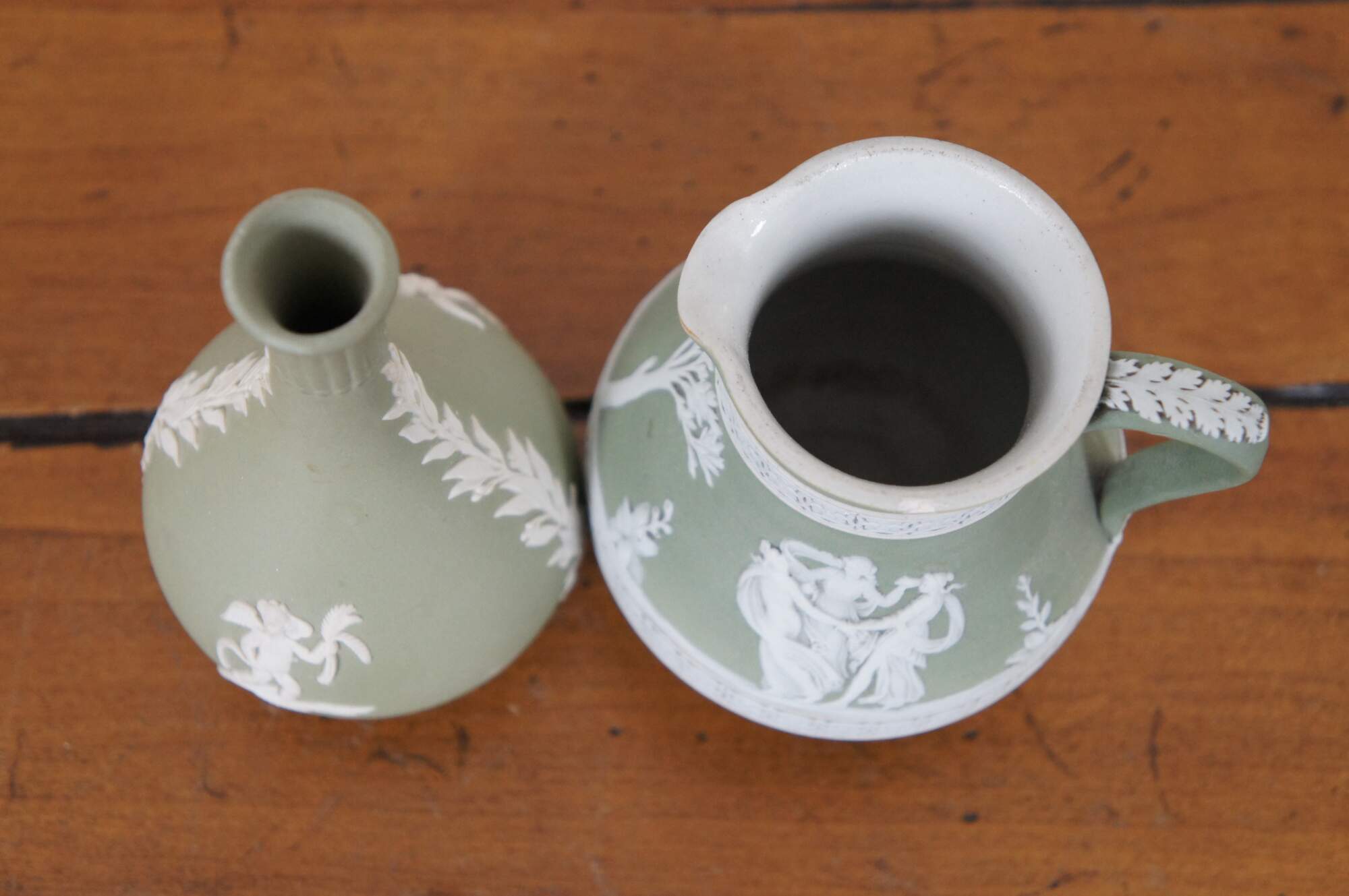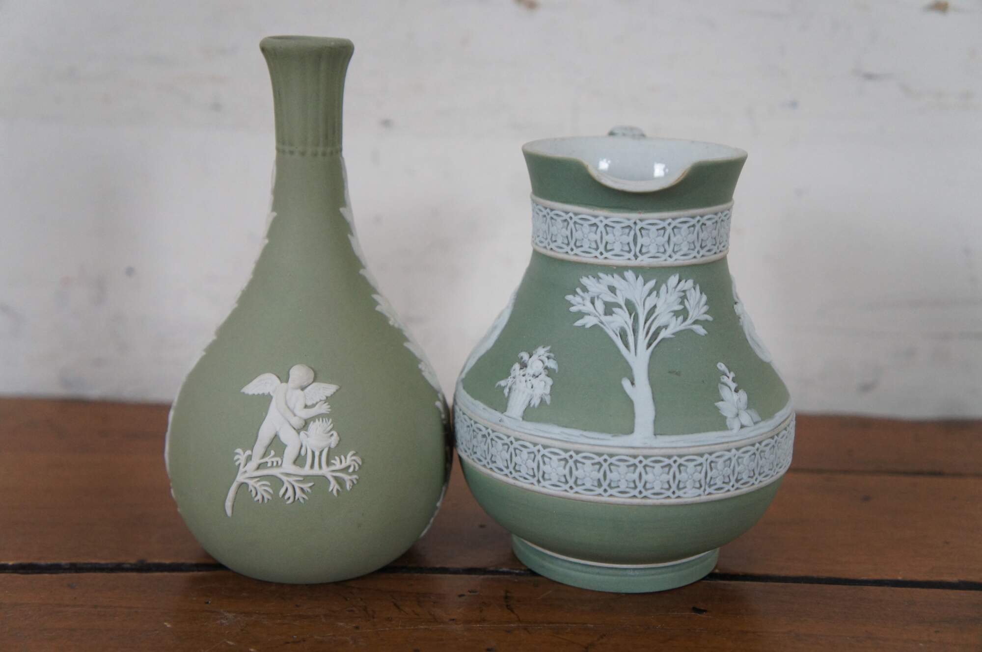 Lot of four pieces of Wedgwood cream on sage green Jasperware, including a bud vase, small pitcher, round dish, and individual ashtray.