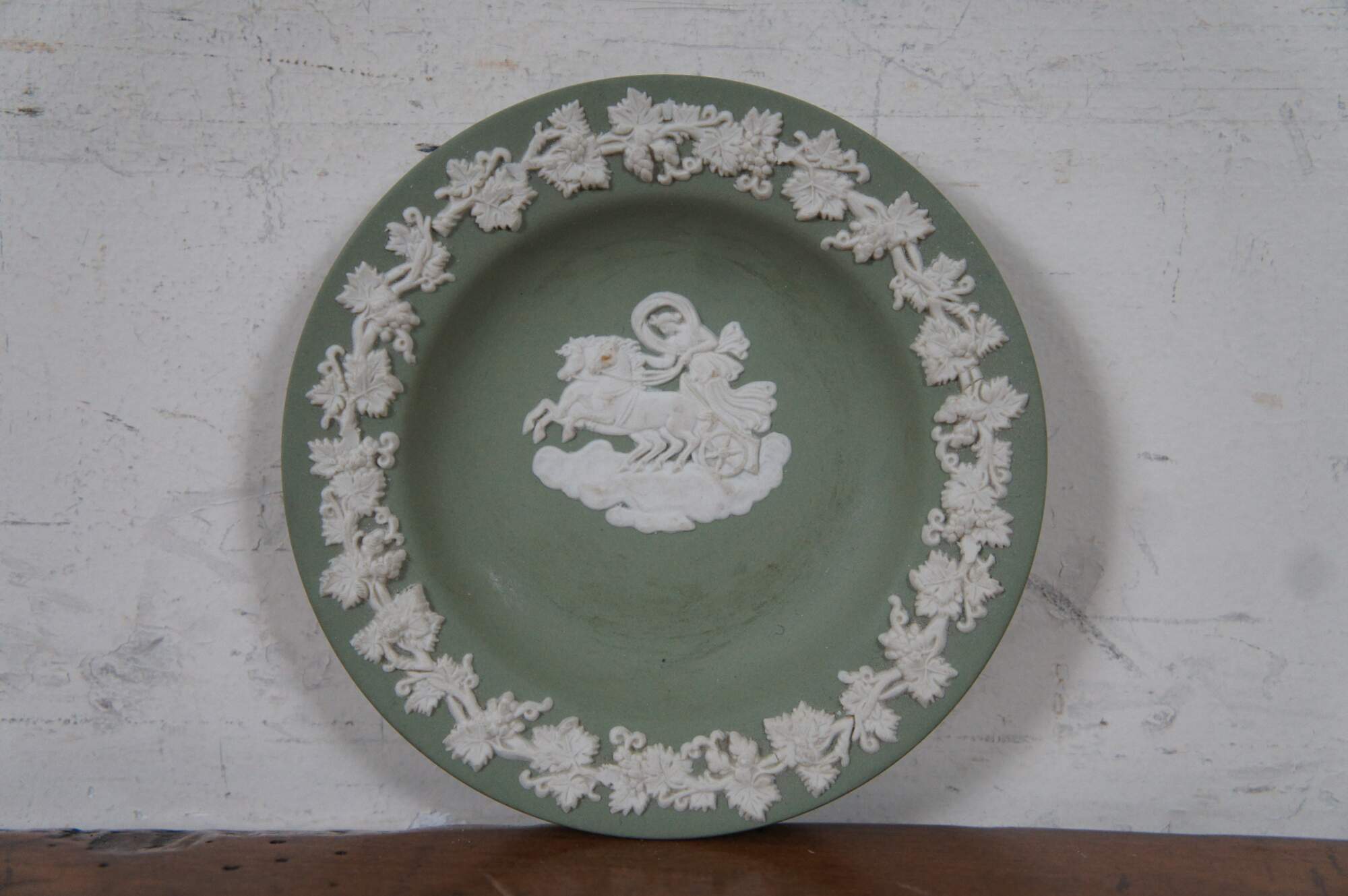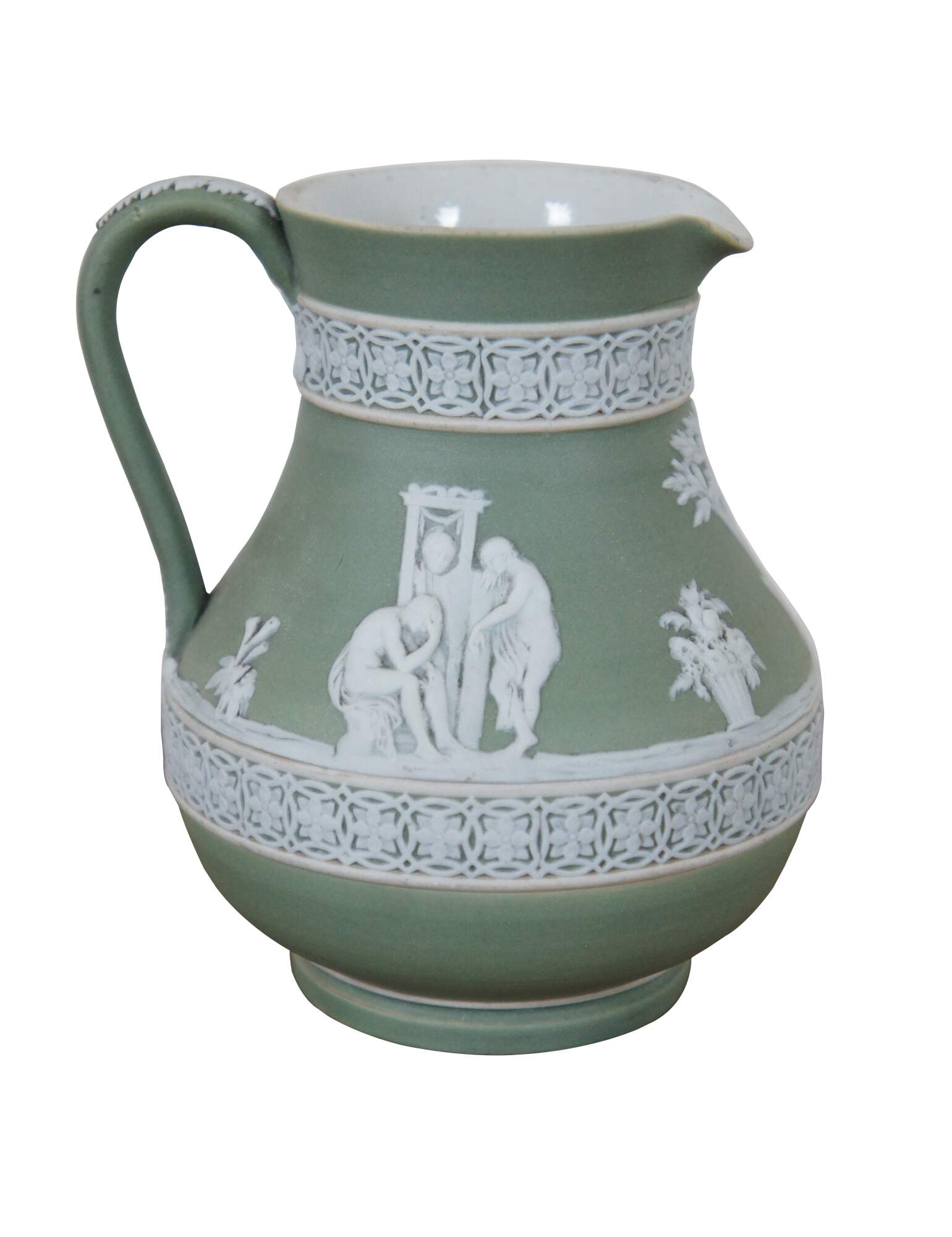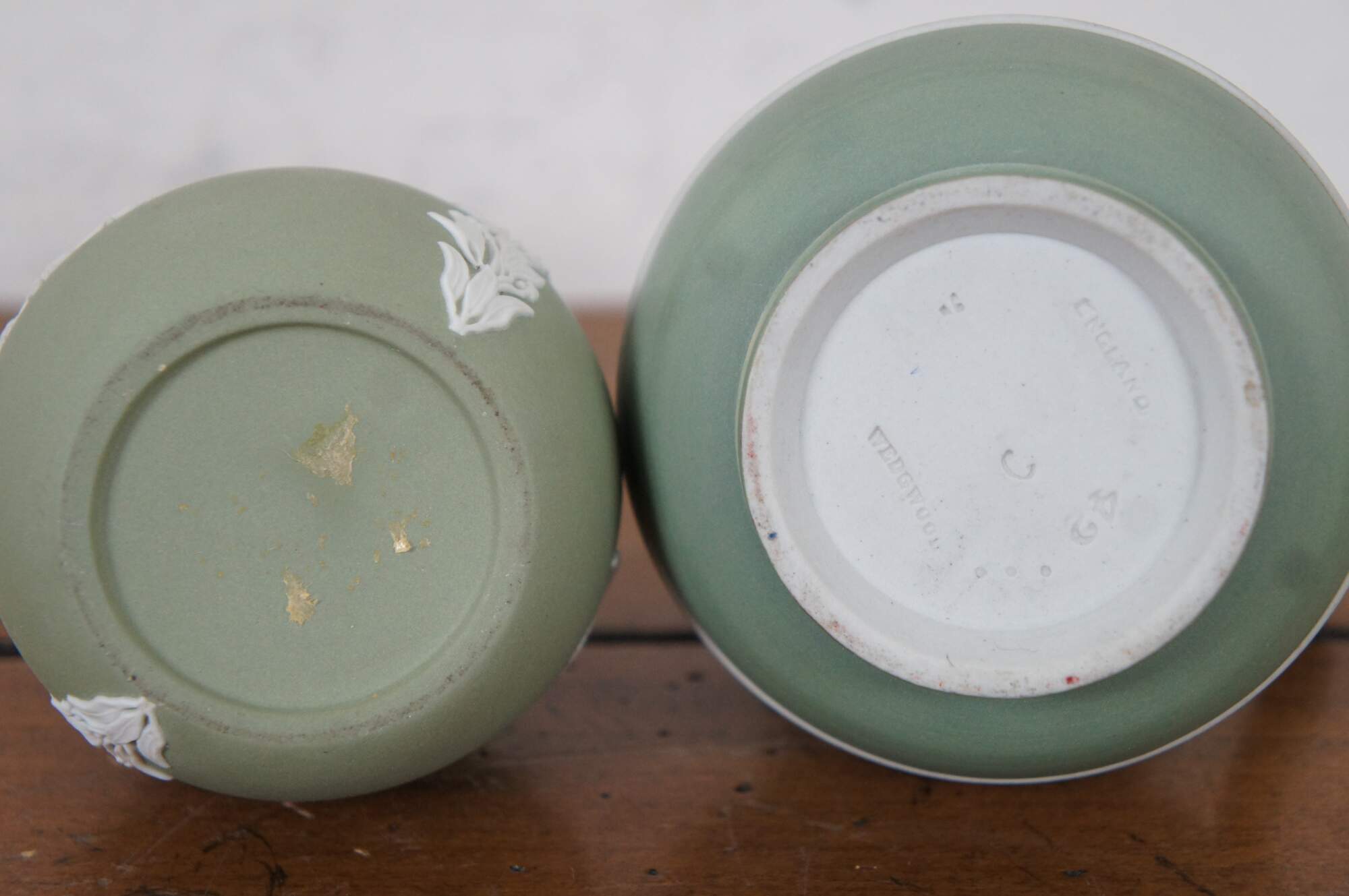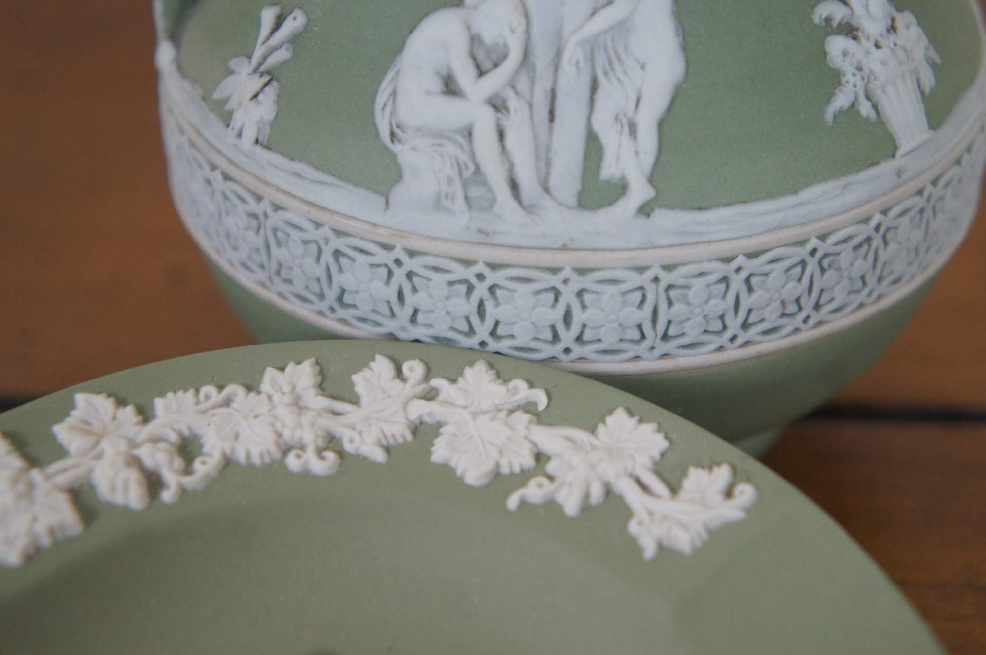 Lot of four pieces of Wedgwood cream on sage green Jasperware, including a bud vase, small pitcher, round dish, and individual ashtray.