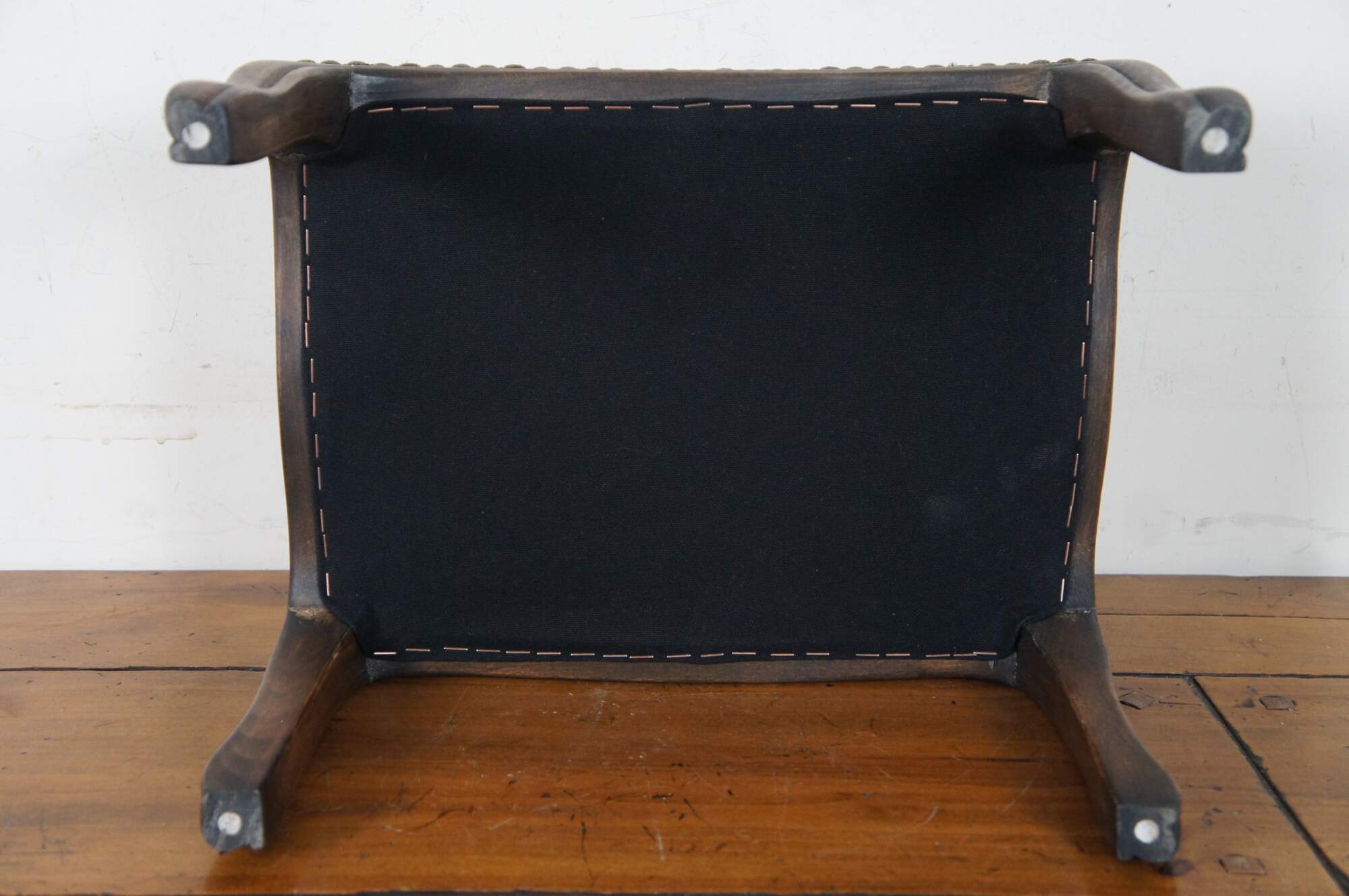 Vintage rectangular wooden footstool / ottoman featuring a padded needlepoint top decorated with leaves and flowers in green, blue and orange with nailhead trim.