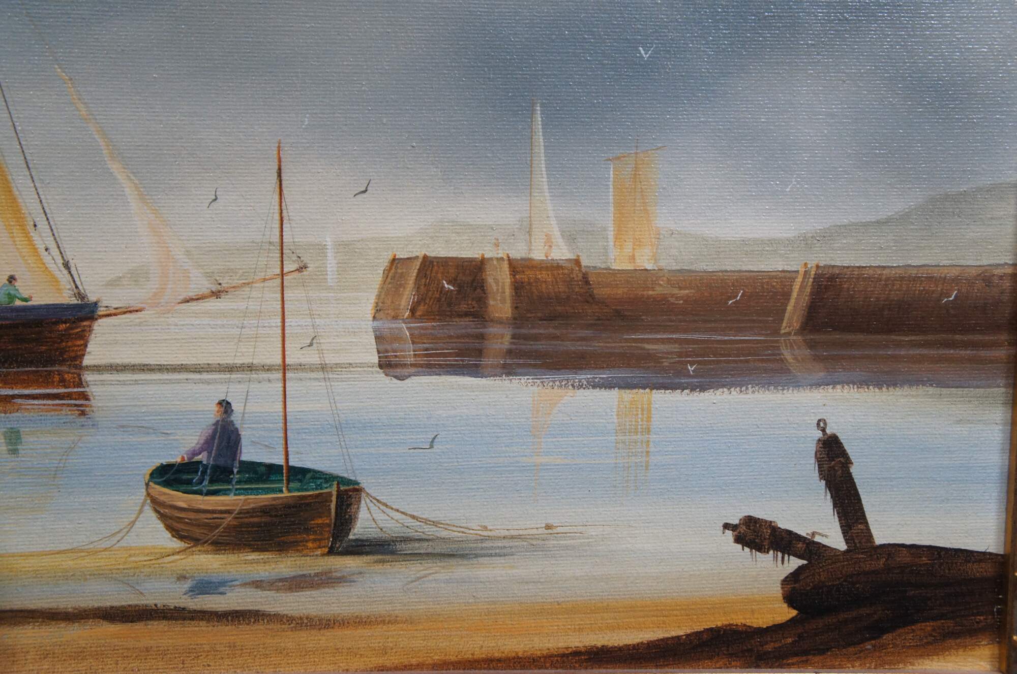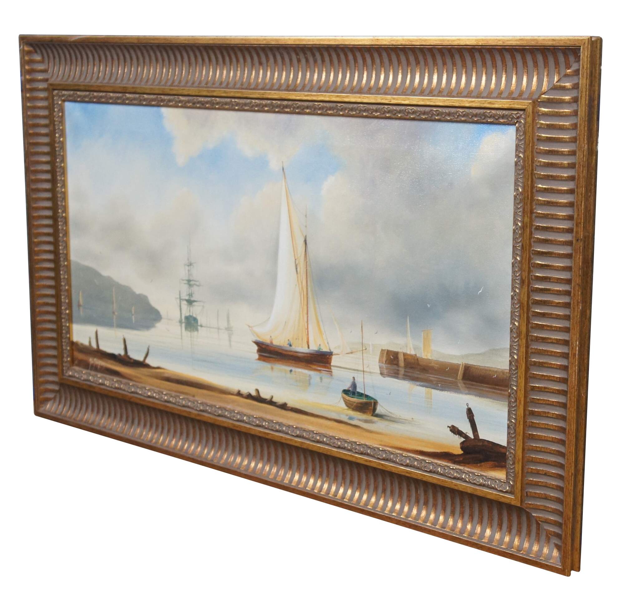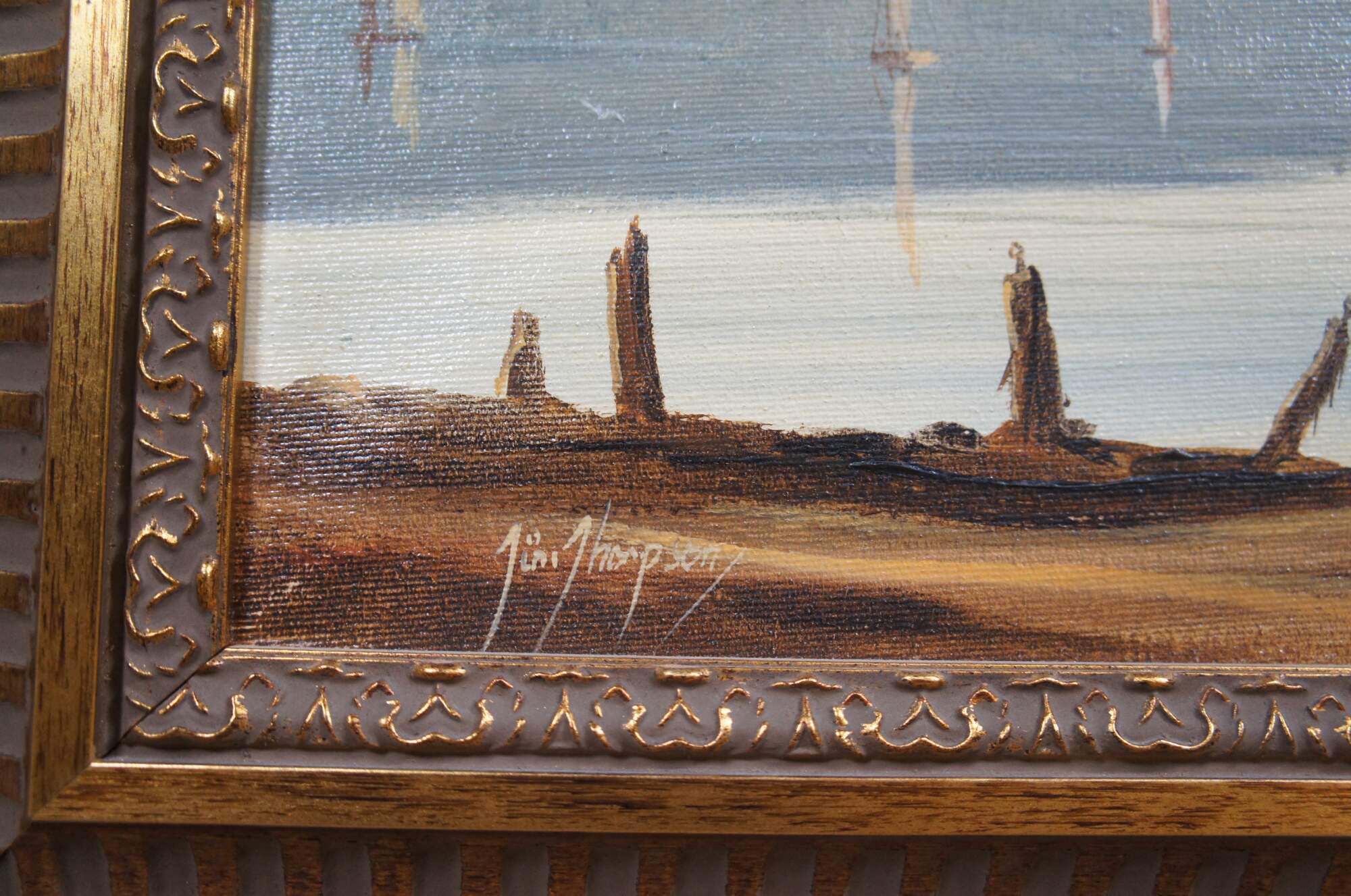 A lovely harbour scene by Jim Thompson, Signed lower left. Features a glance from the beach showing fishermen and sailboats on partly cloudy day with seagulls all around. The painting is on canvas and set in a modern gold toned frame.