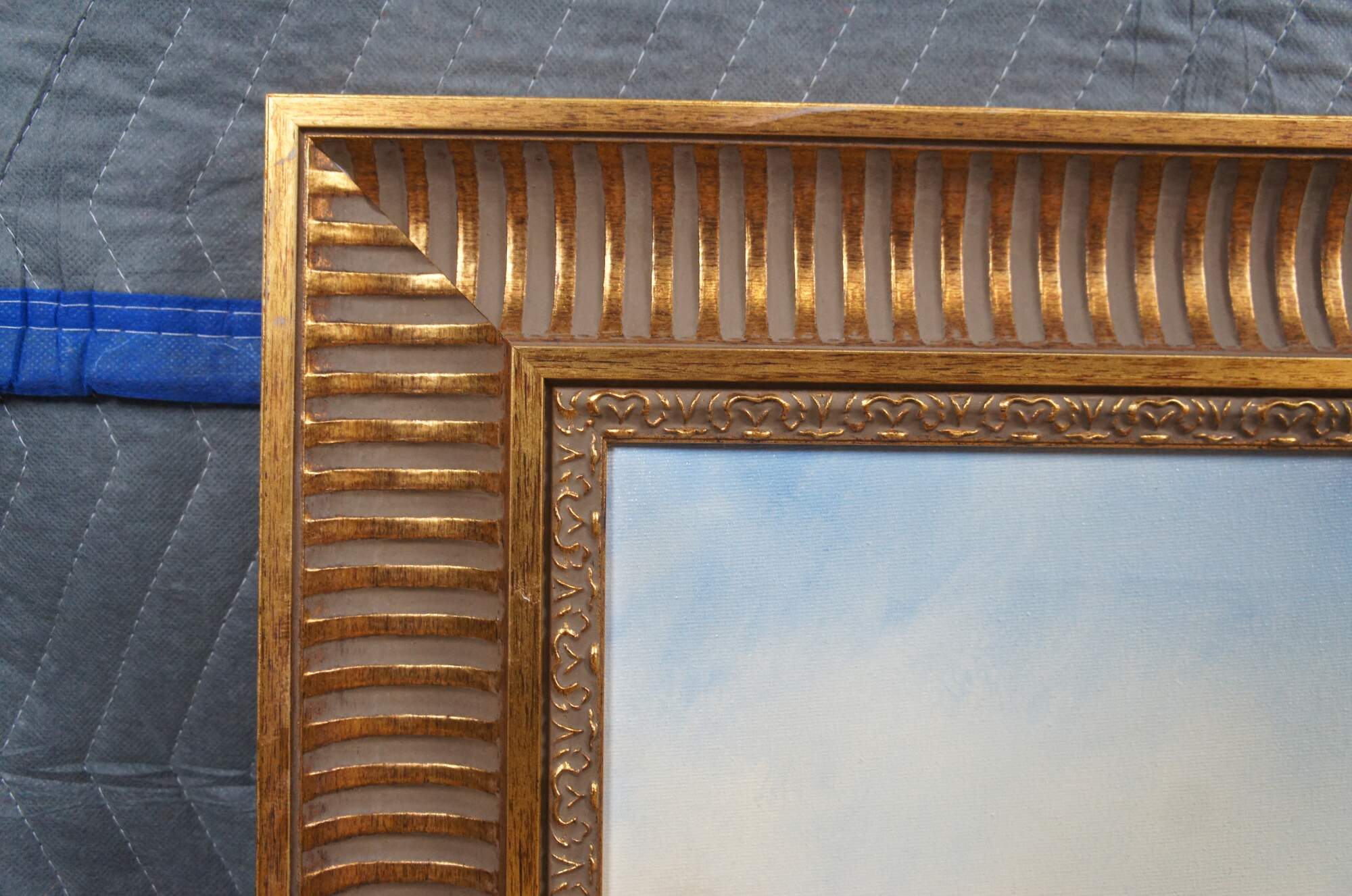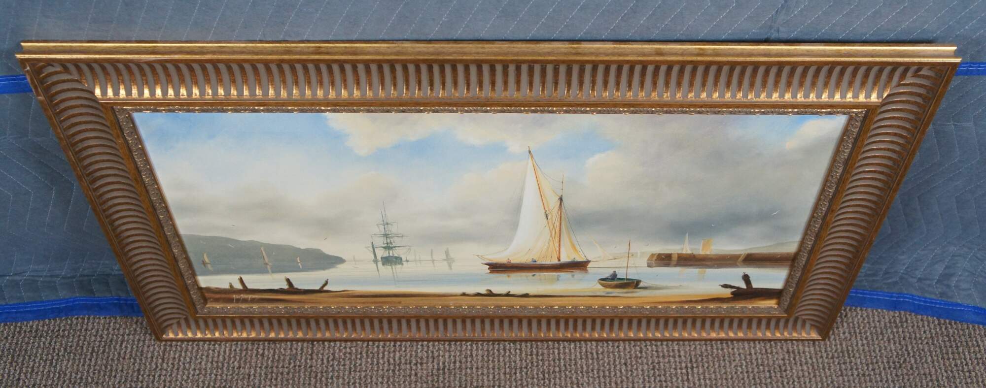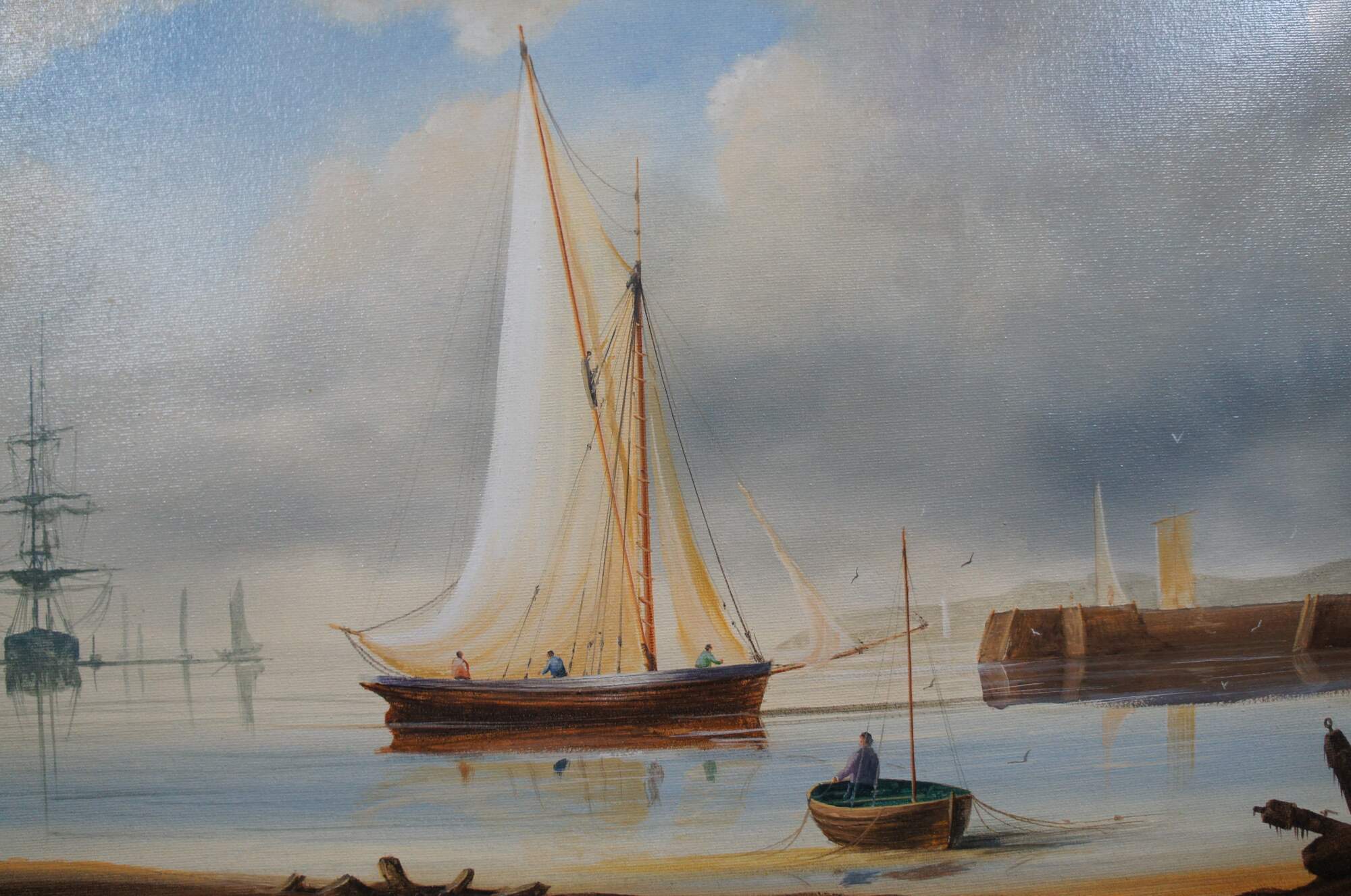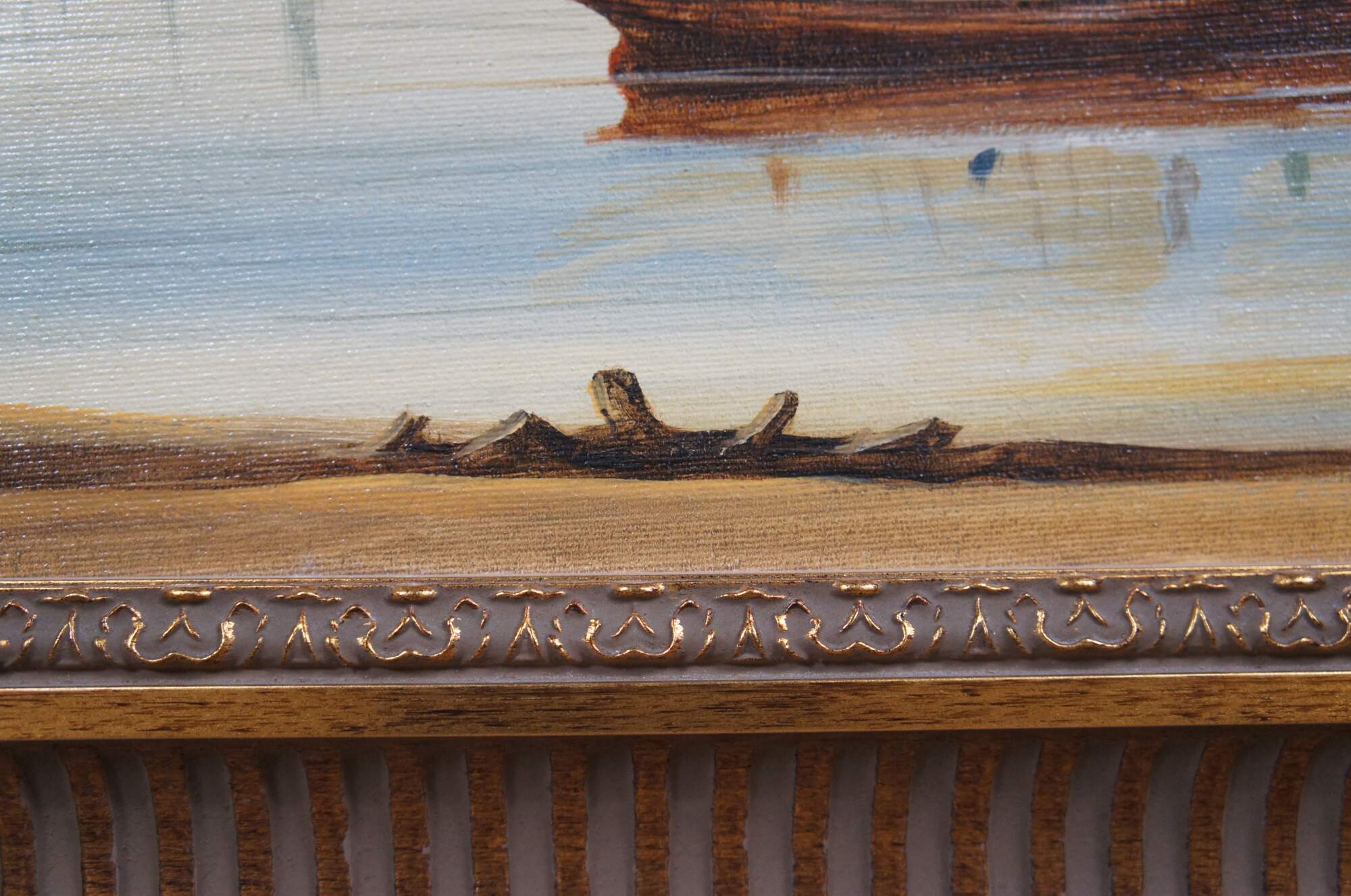 A lovely harbour scene by Jim Thompson, Signed lower left. Features a glance from the beach showing fishermen and sailboats on partly cloudy day with seagulls all around. The painting is on canvas and set in a modern gold toned frame.