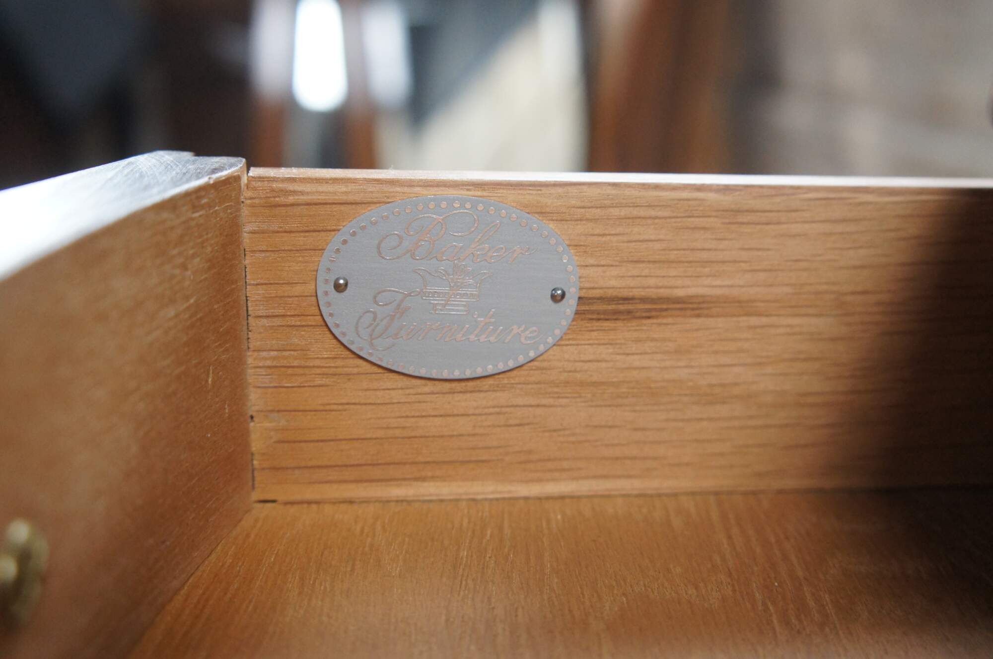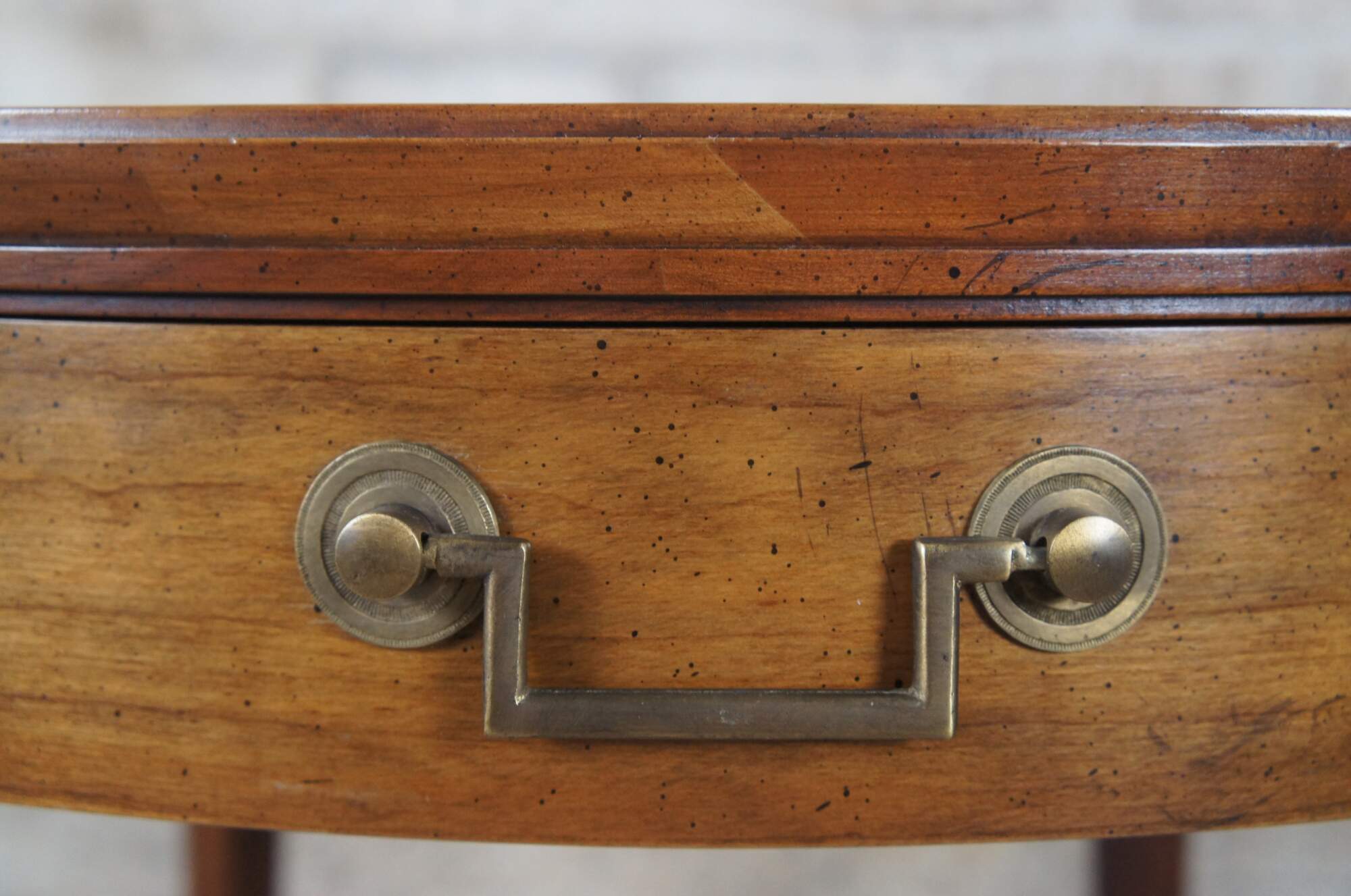 An impressive Baker Furniture Neoclassical inspired side table, Circa 1980s. Features a round inset top made from walnut with olive ash burl banding. Includes one dovetailed drawer with brass hardware within the frieze set over square tapered legs leading to a nubby foot. Perfectly sized to be used as a side table, end table or nightstand.