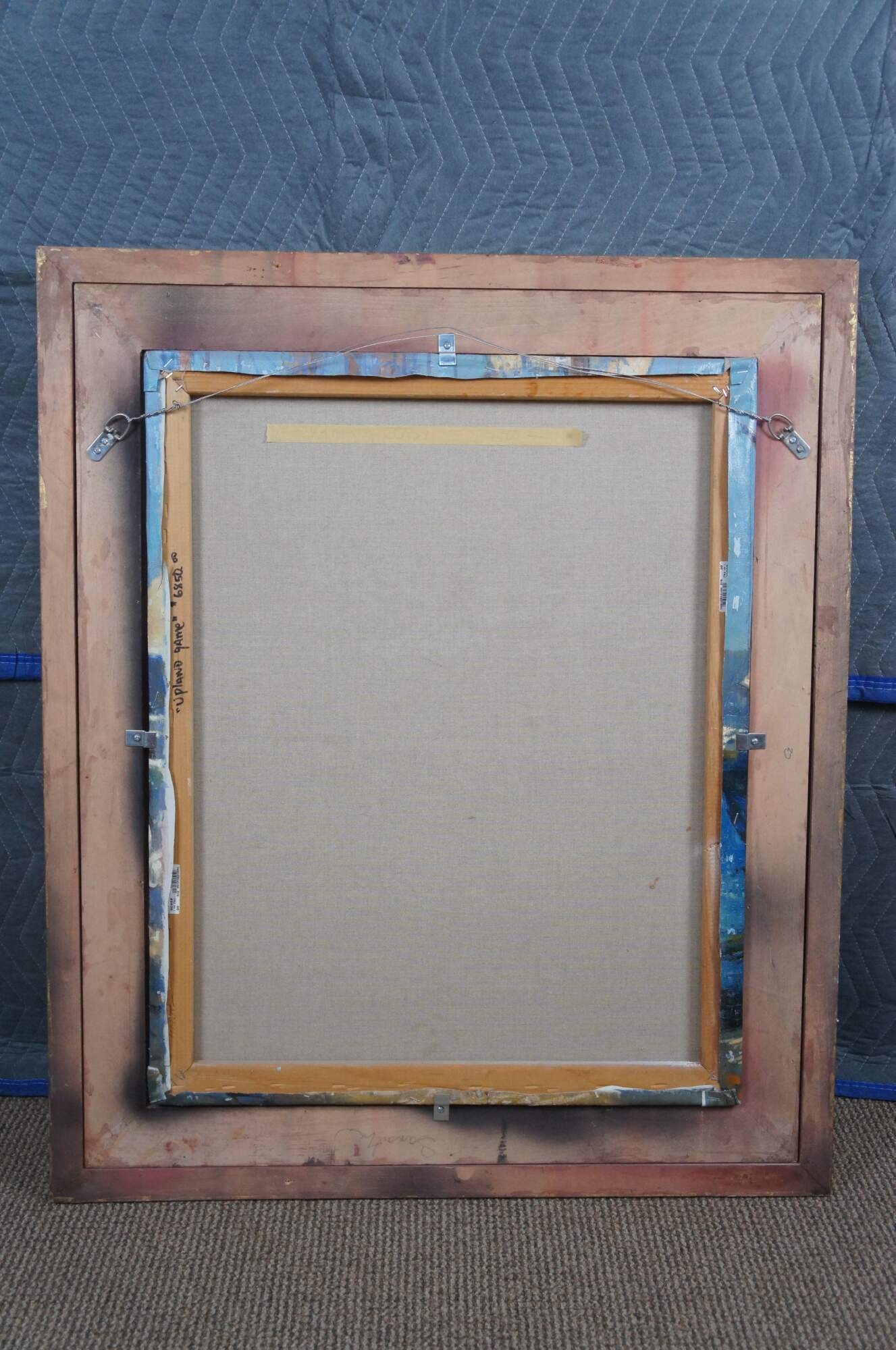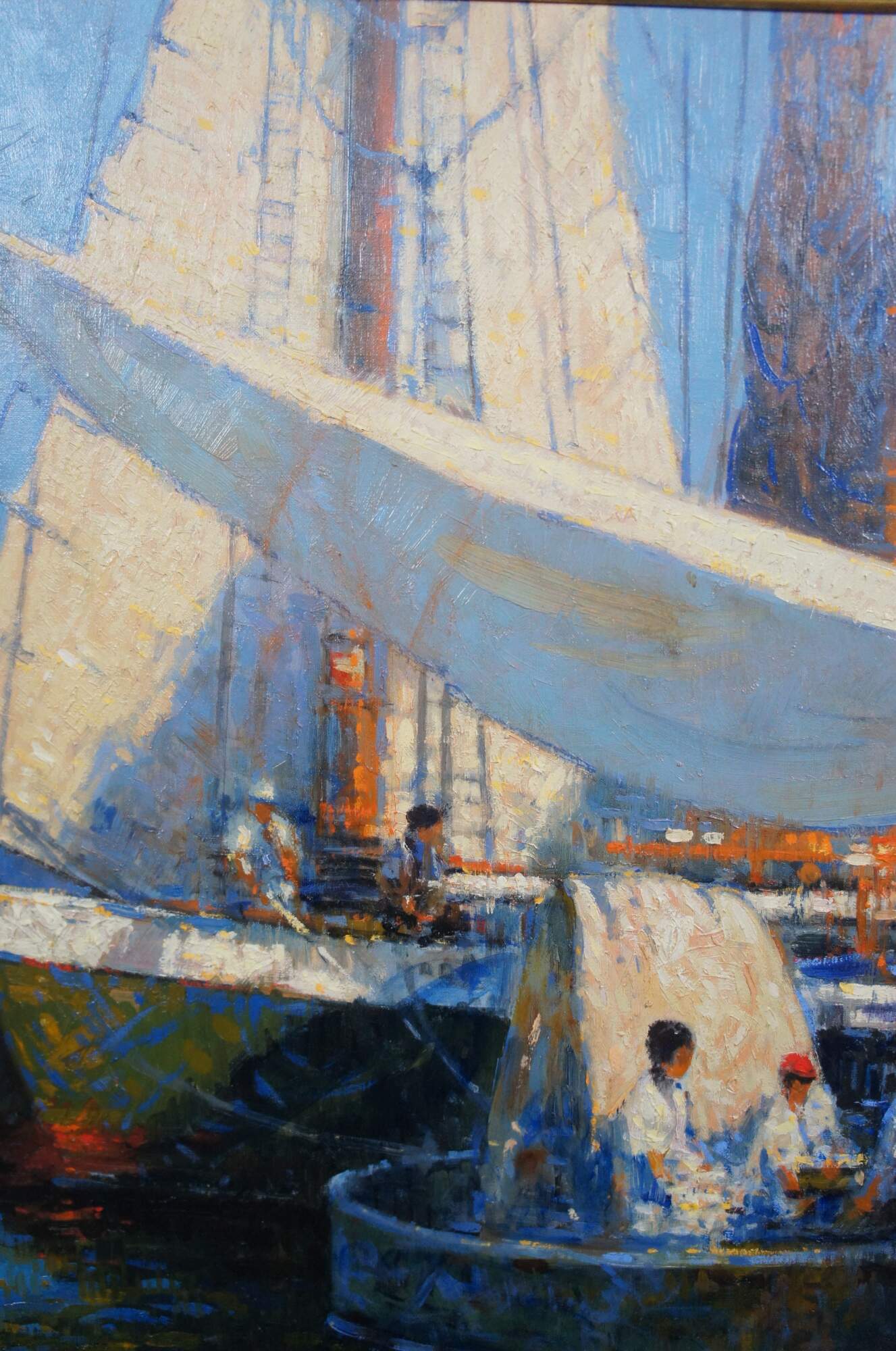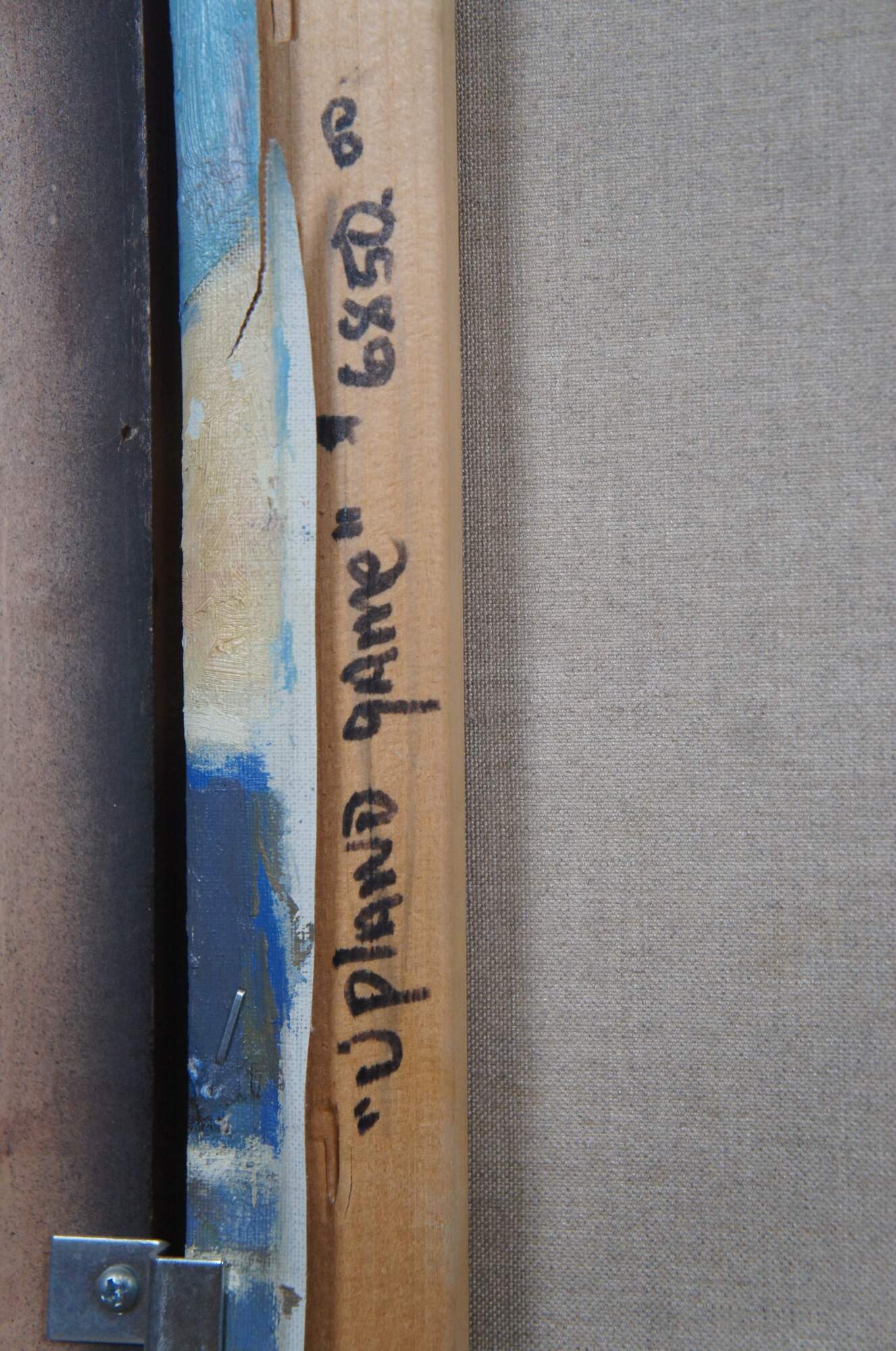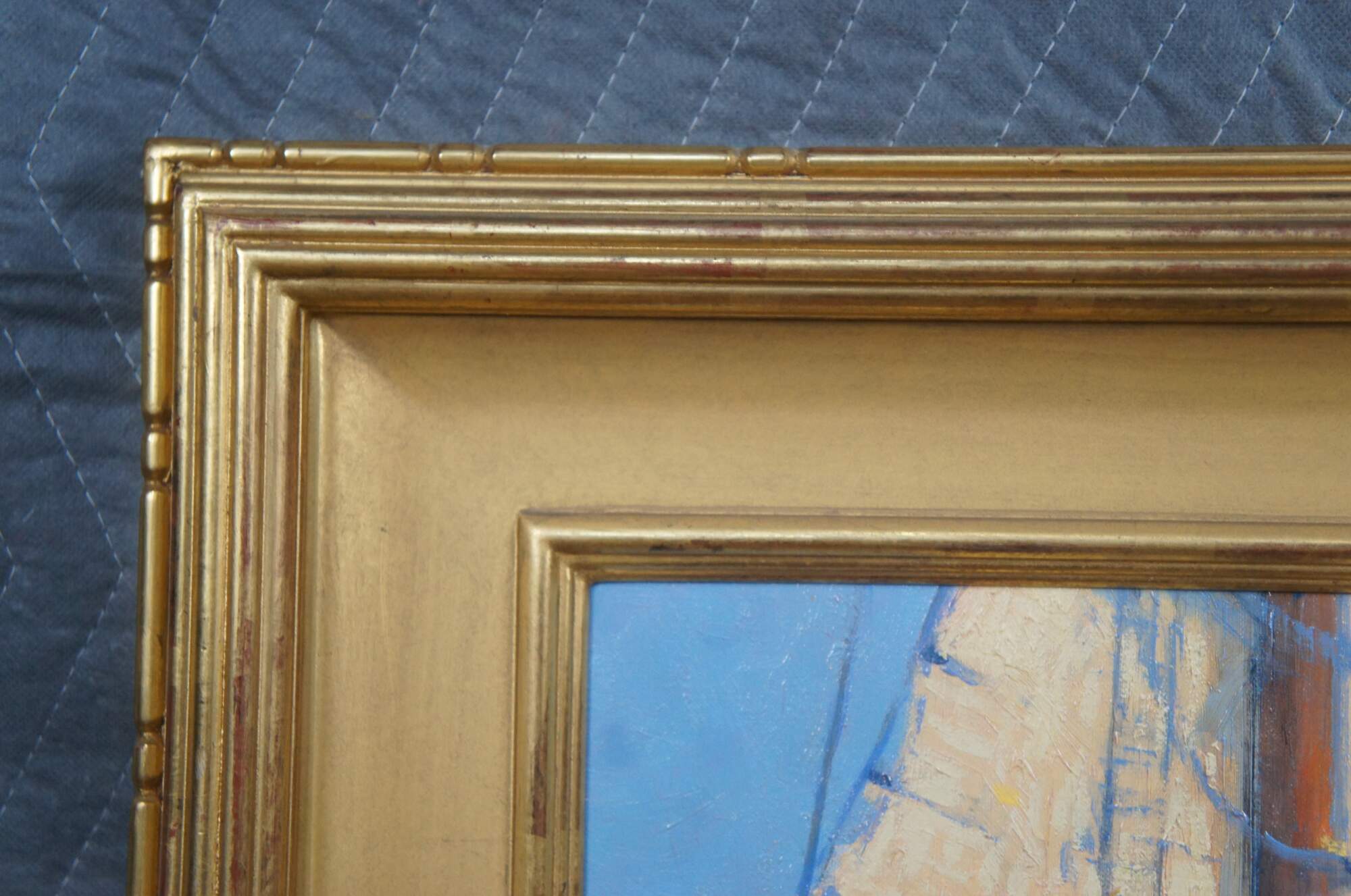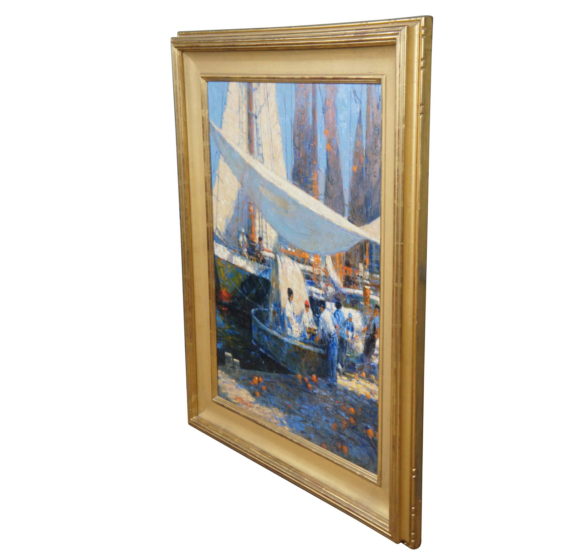 Vintage nautical maritime impressionist painting featuring sailboats boats docked at a Massachusetts harbor. The scene shows figures at an ocean side market. 'Upland Game' refers to the wild birds that are hunted during season. The canvas is signed lower left and marked on the verso. Framed in an a gently distressed wooden frame with gold paint.