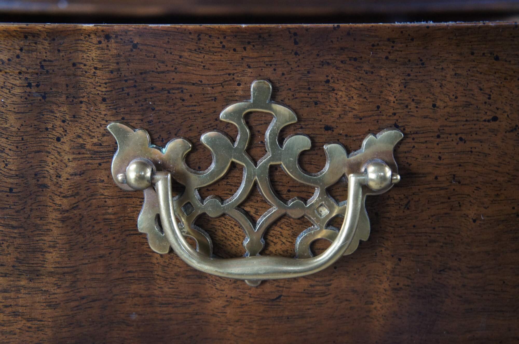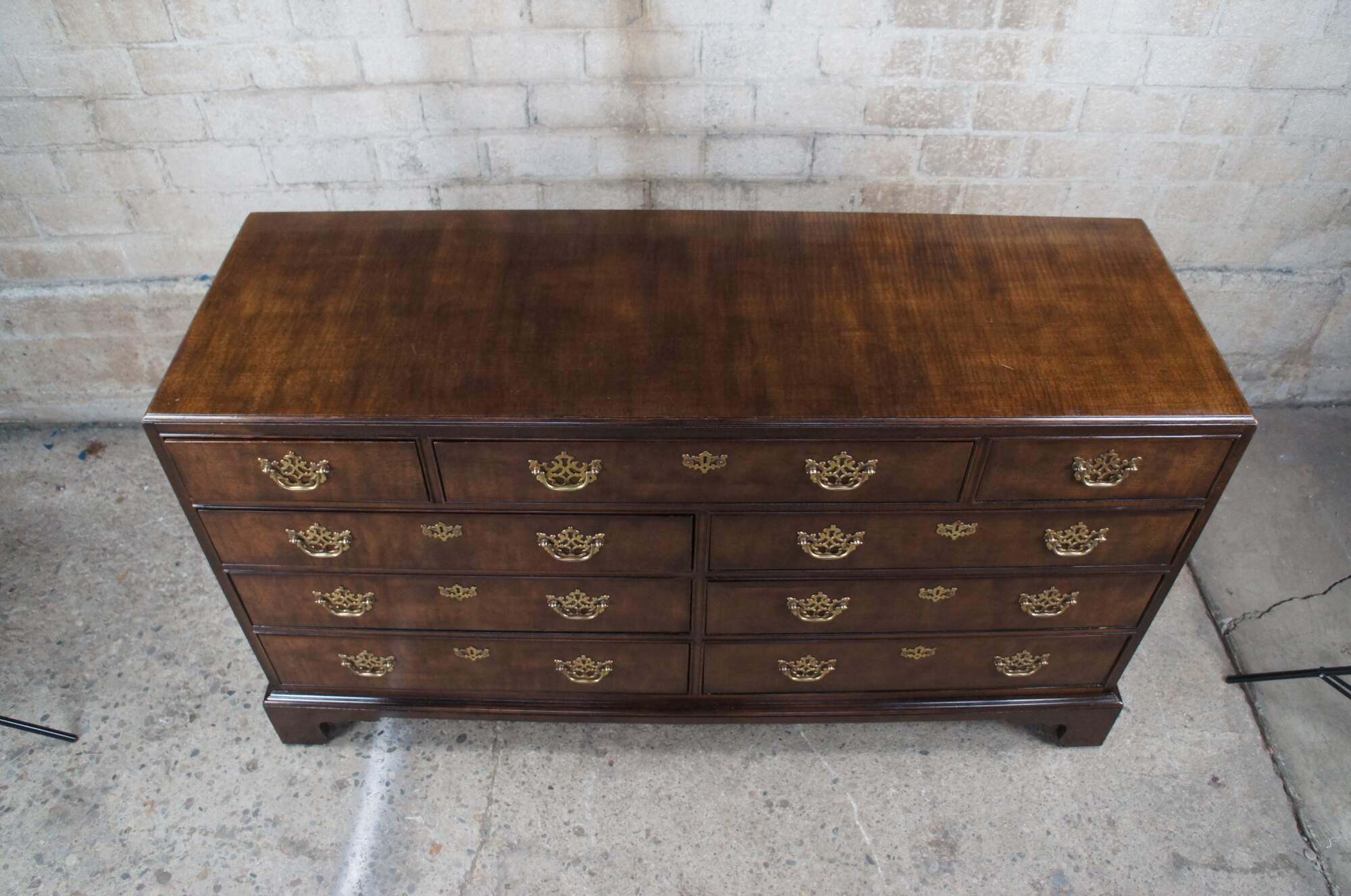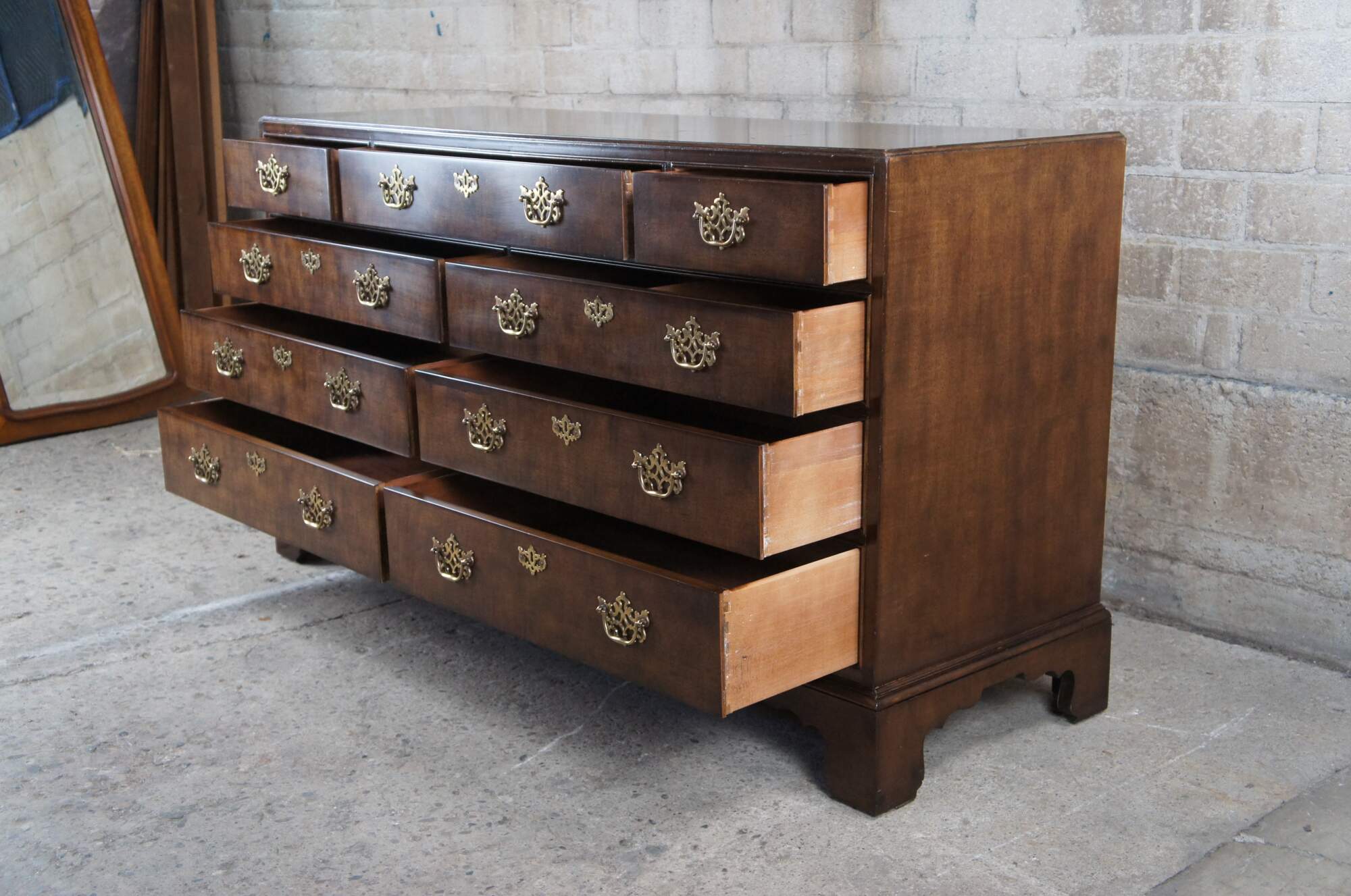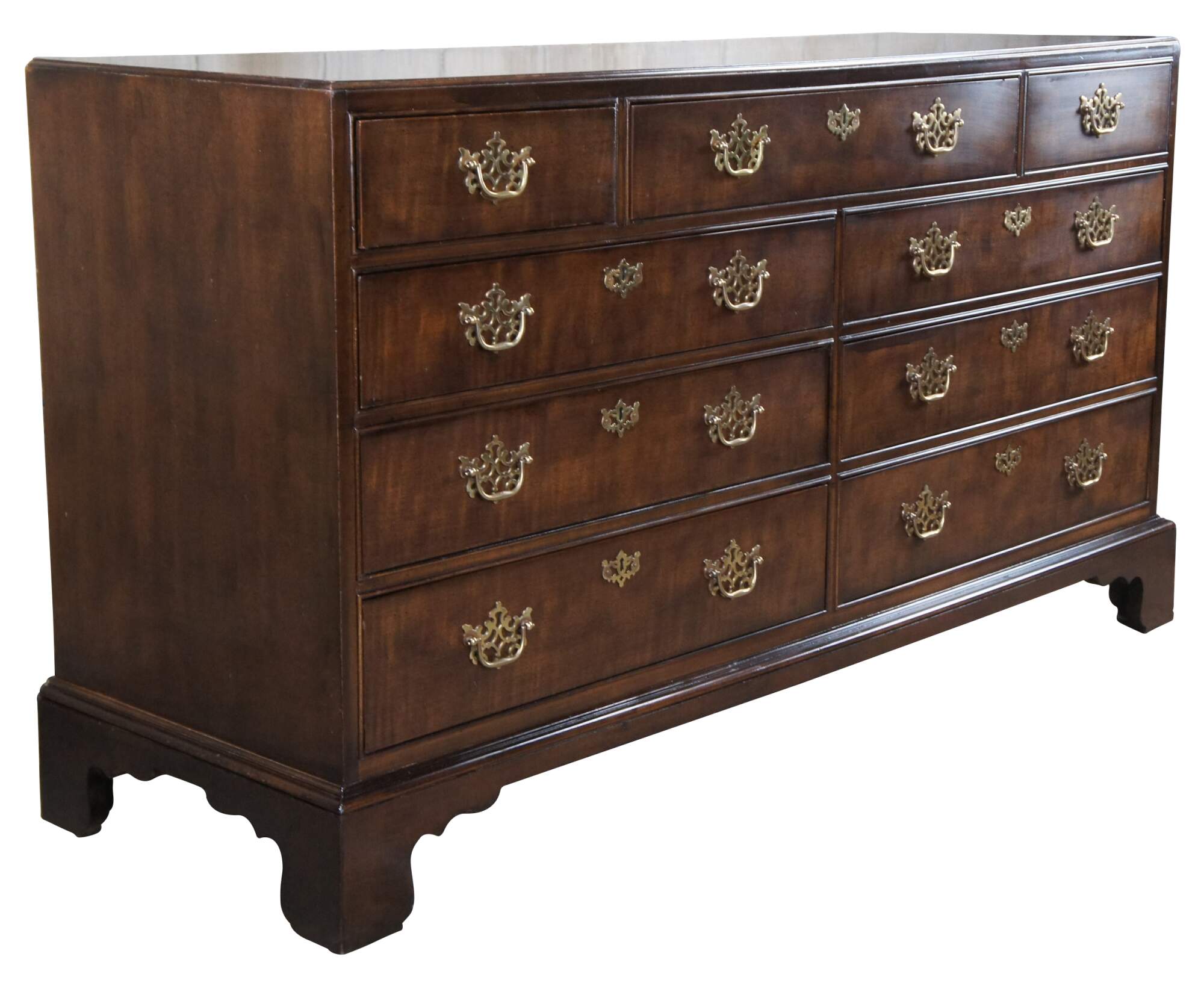 Vintage Henredon Chippendale and Georgian inspired double dresser 3400-01, circa 1984. Made from mahogany with 9 dovetailed drawers, pierced batwing bale hardware and faux escutcheon. The case is raised over bracket feet.