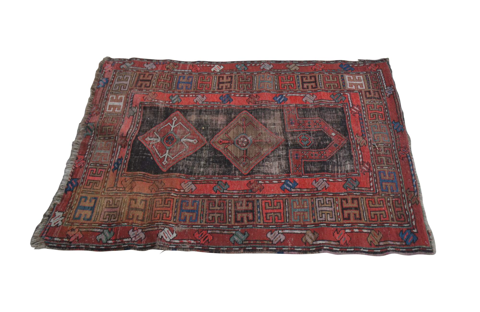 Red & Blue hand Woven wool prayer rug. Features a diamond geometric field with framed in alternating color # signs. 3'3" x 4'6