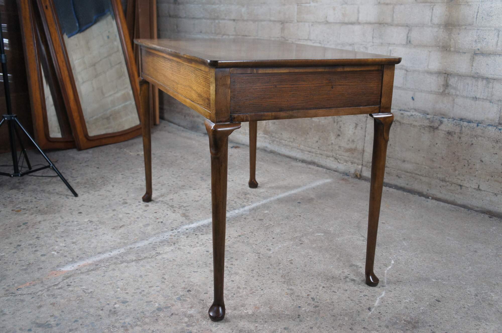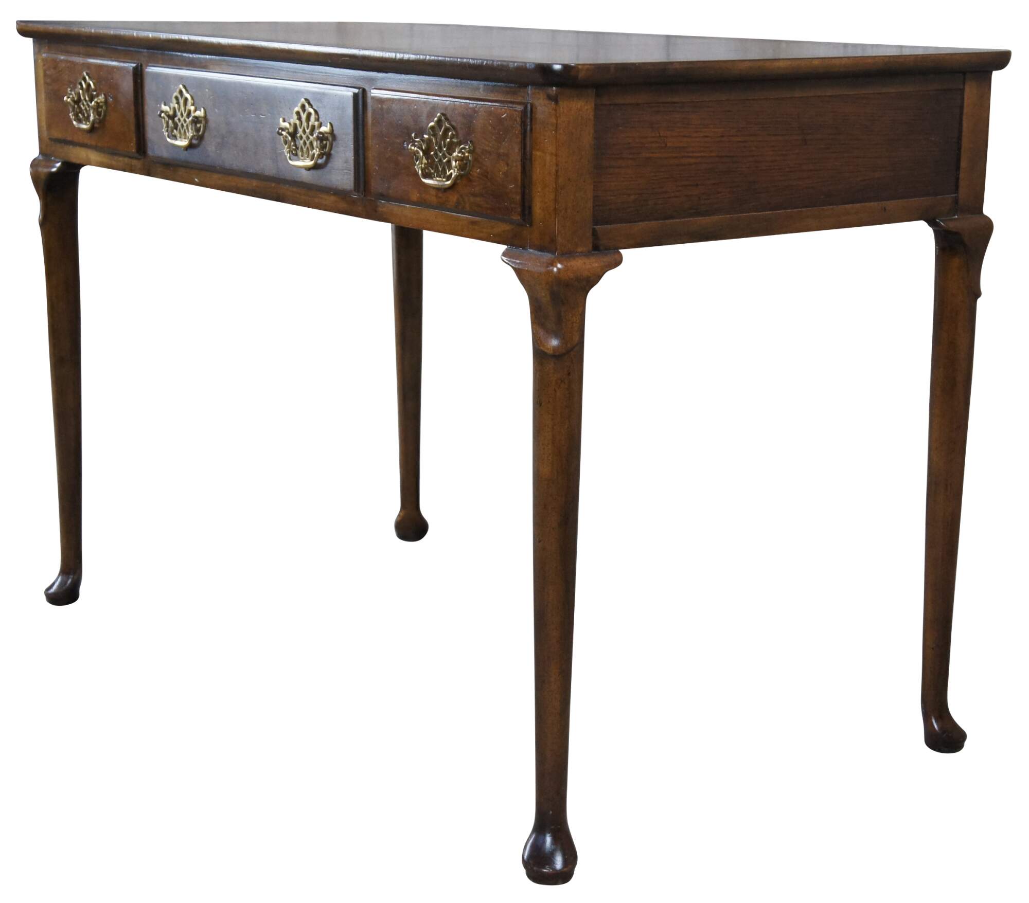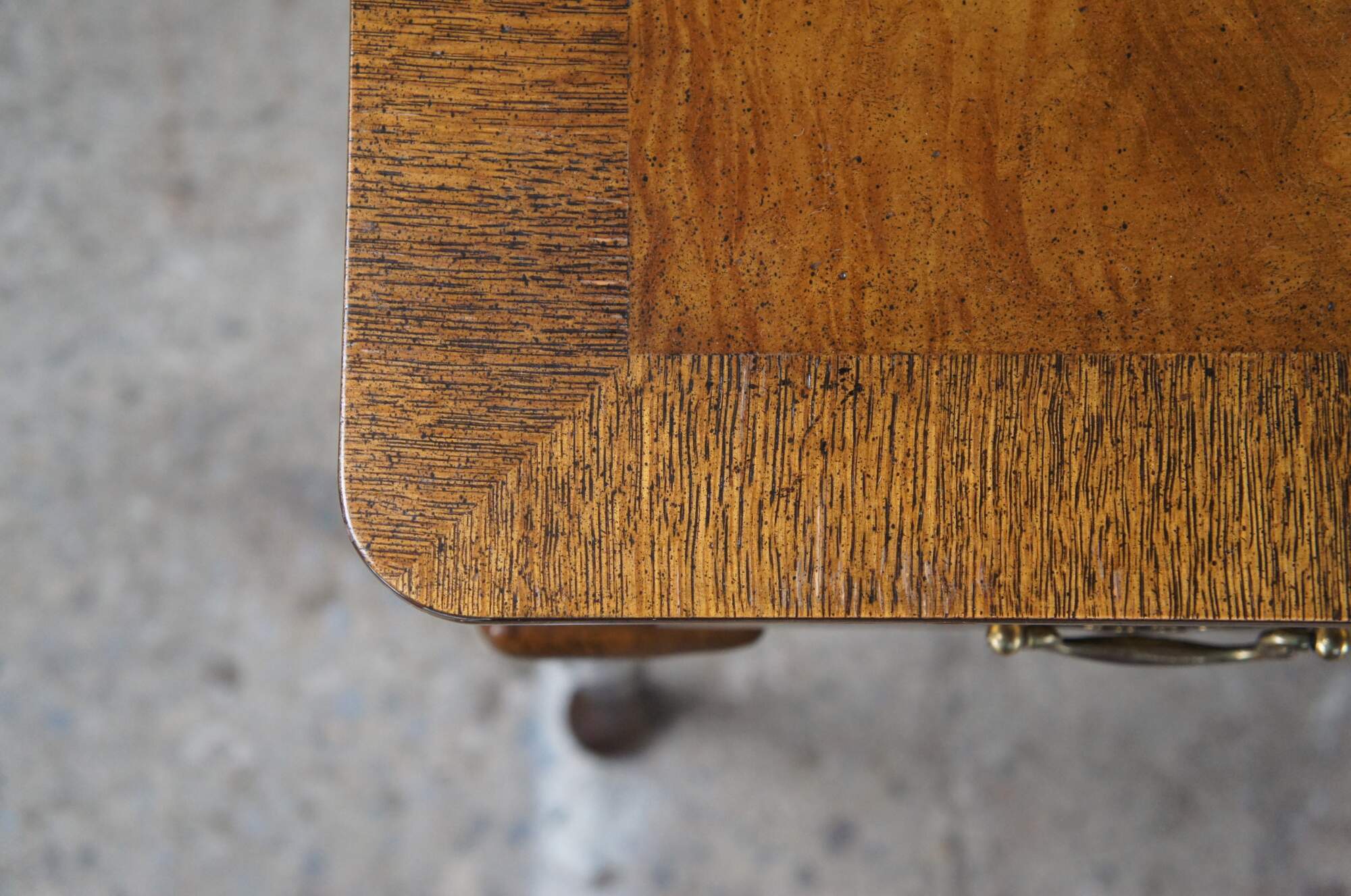 A quaint writing desk by Baker Furniture, circa 1960s. Made from walnut with a beautiful matchbook burled and banded top. Features three dovetailed drawers within the frieze. Each having classic chippendale pierced brass bawing drawer pulls. The case is supported by long tapered legs leading to pad feet. Marked along the underside #1505.