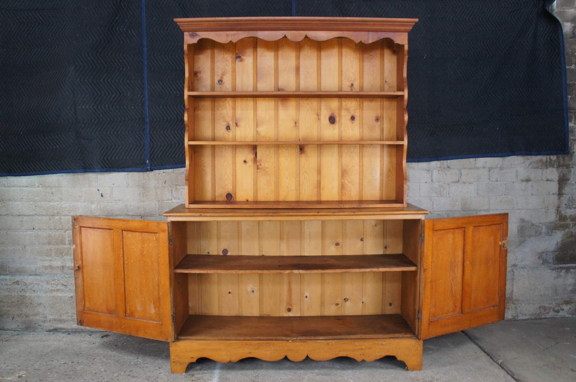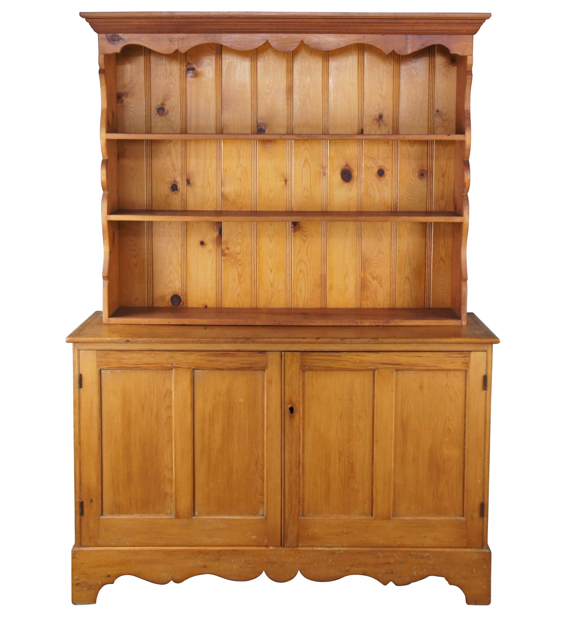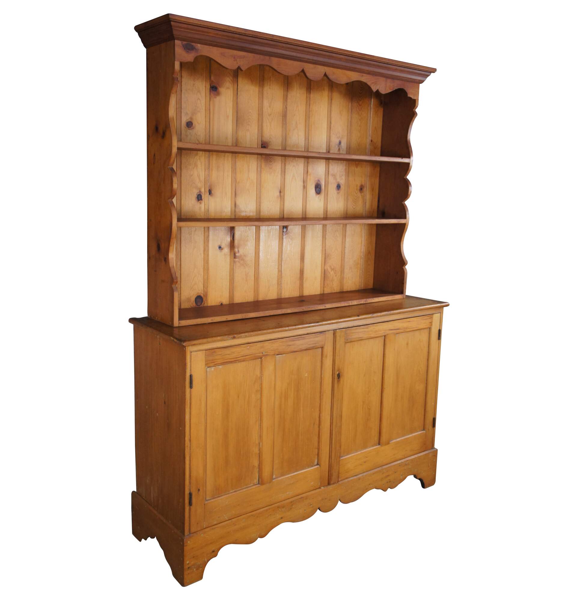 Antique primitive pine country farmhouse china hutch or cupboard featuring serpentine form with three shelves and lower two door cabinet over bracket feet.