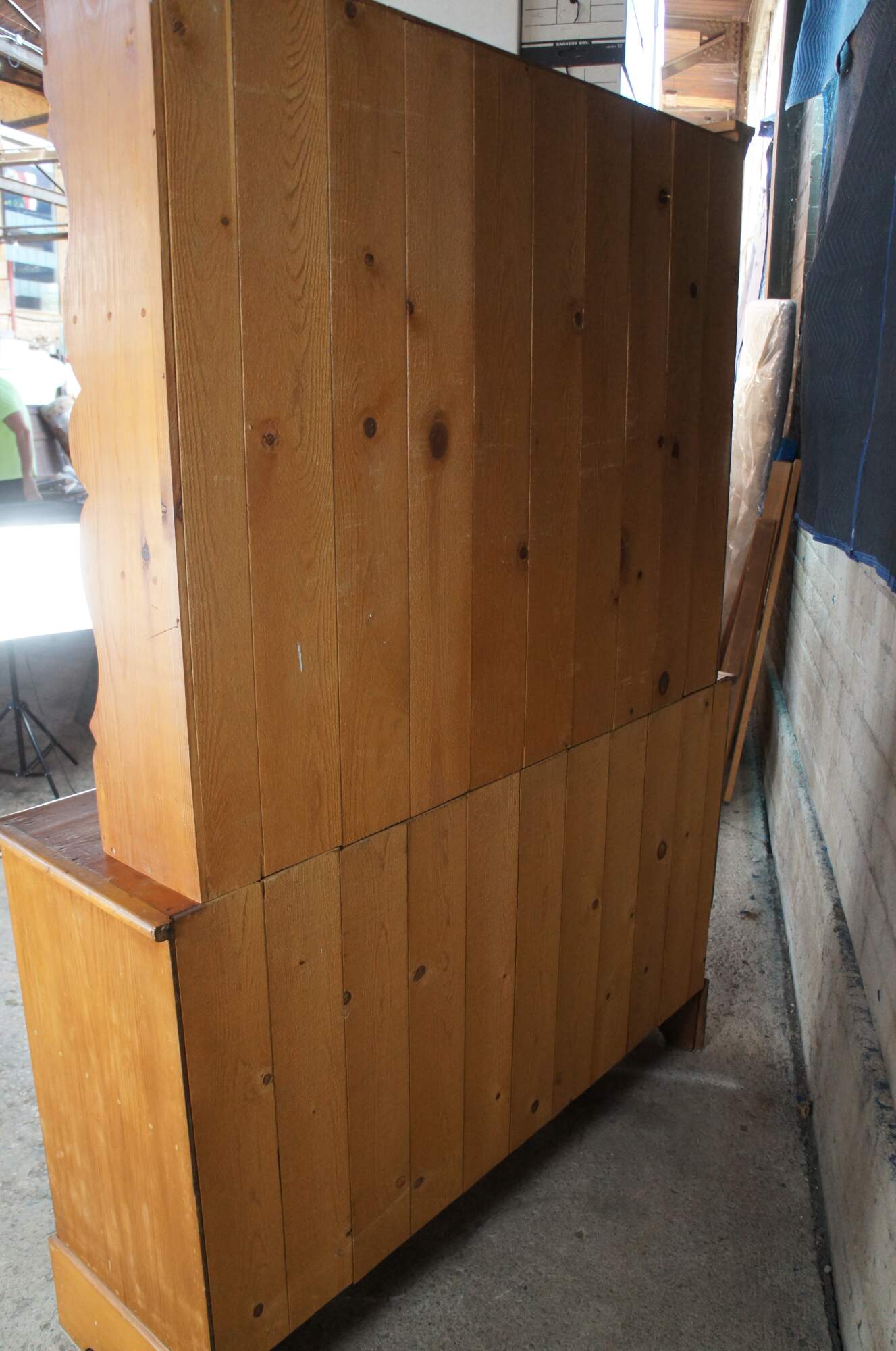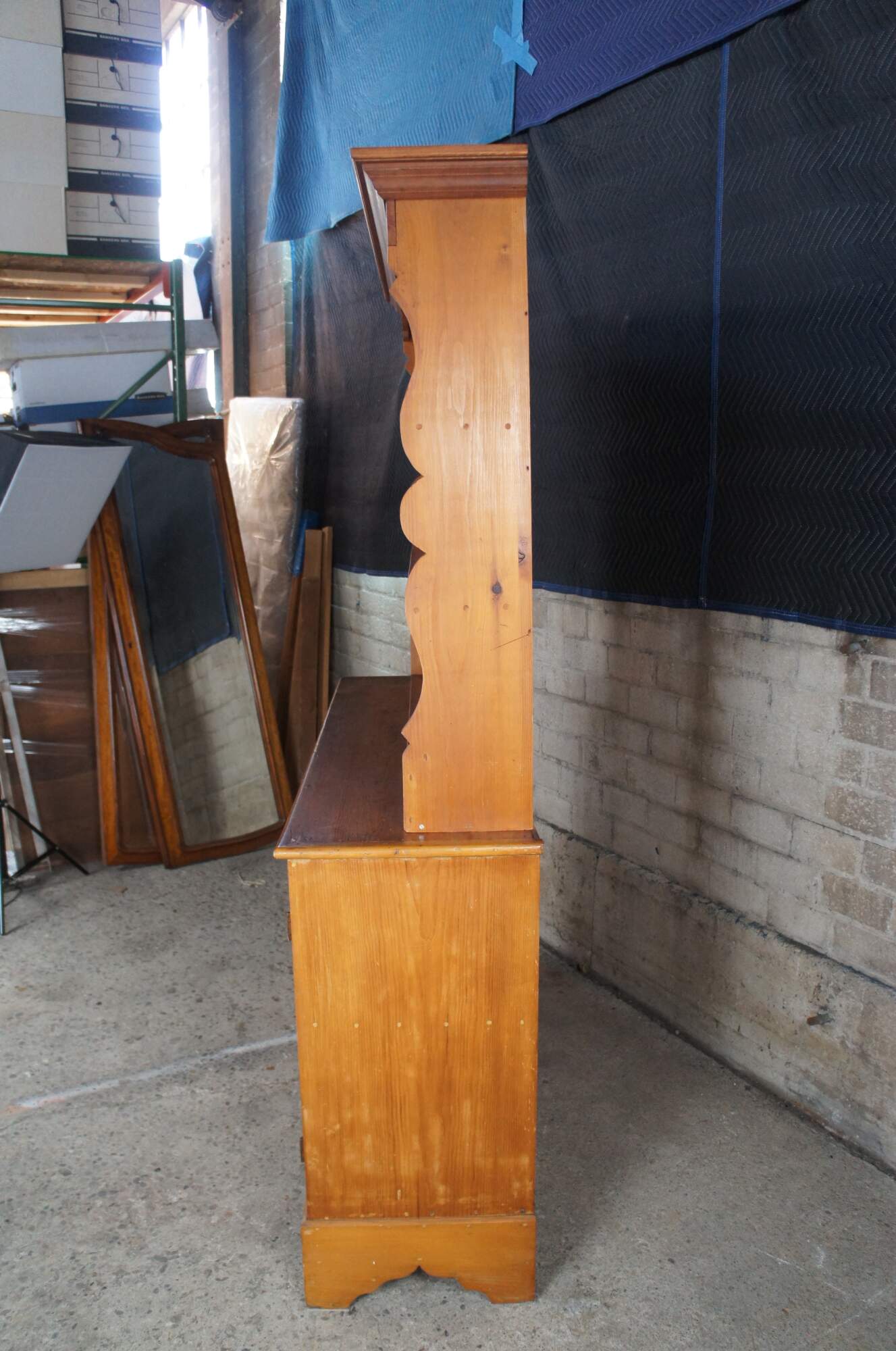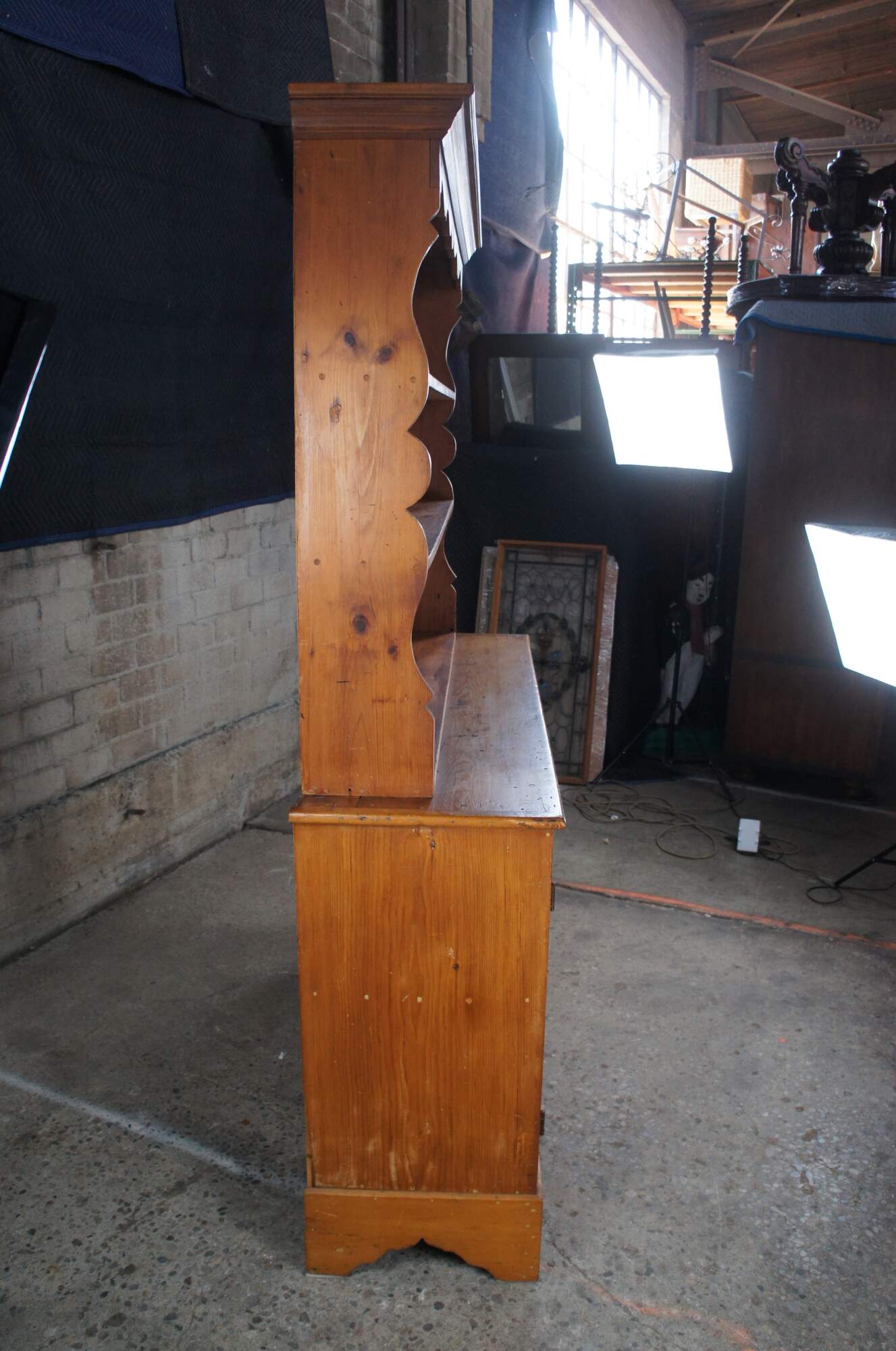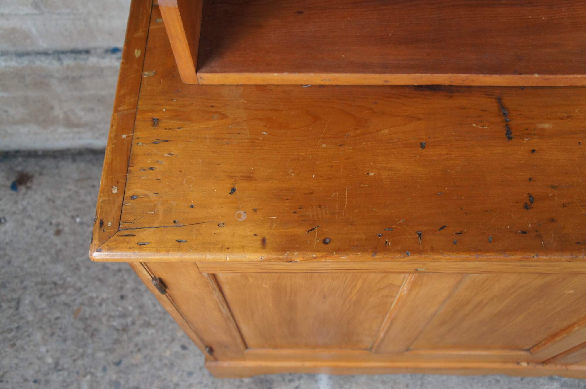 Antique primitive pine country farmhouse china hutch or cupboard featuring serpentine form with three shelves and lower two door cabinet over bracket feet.
