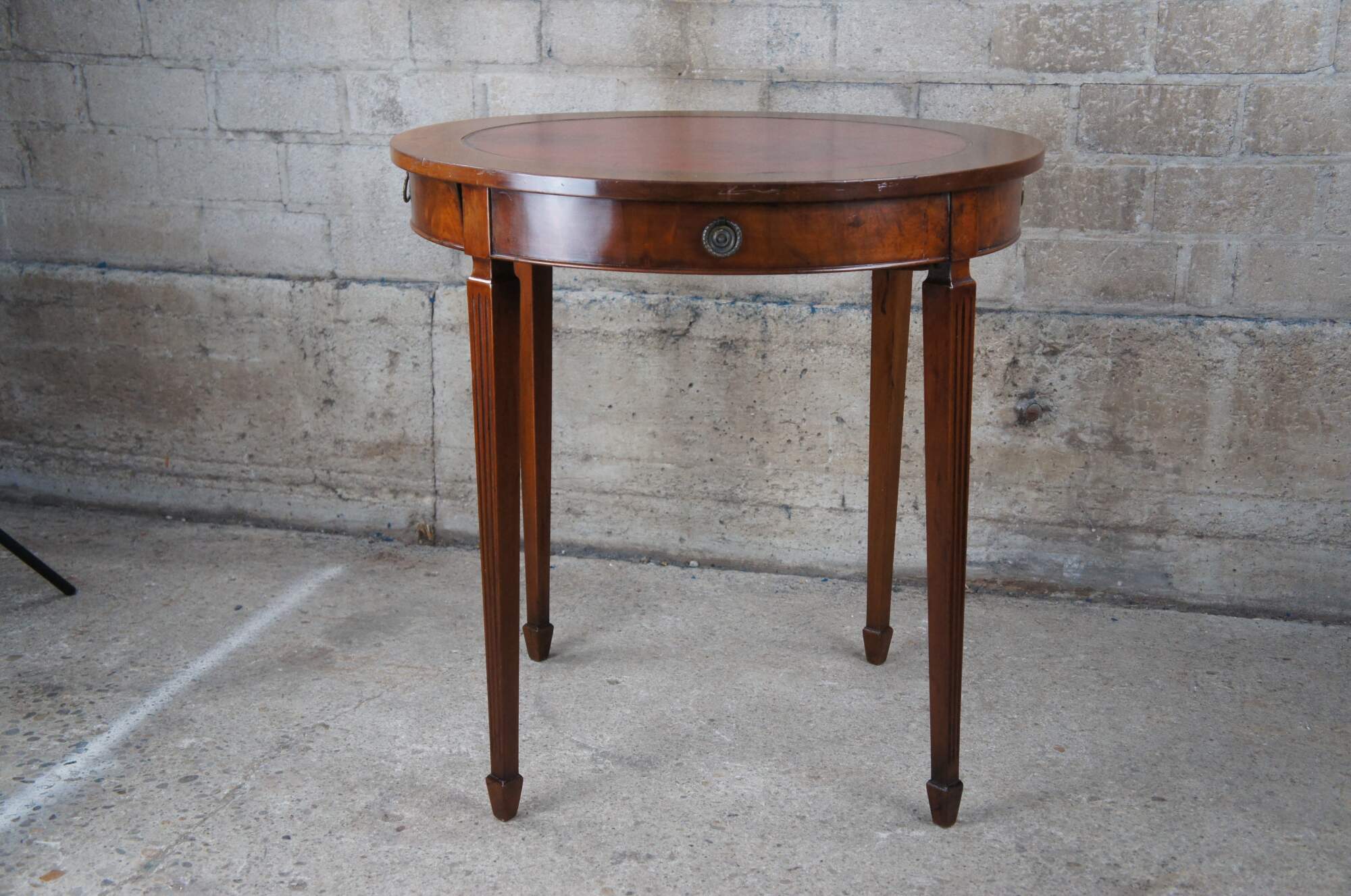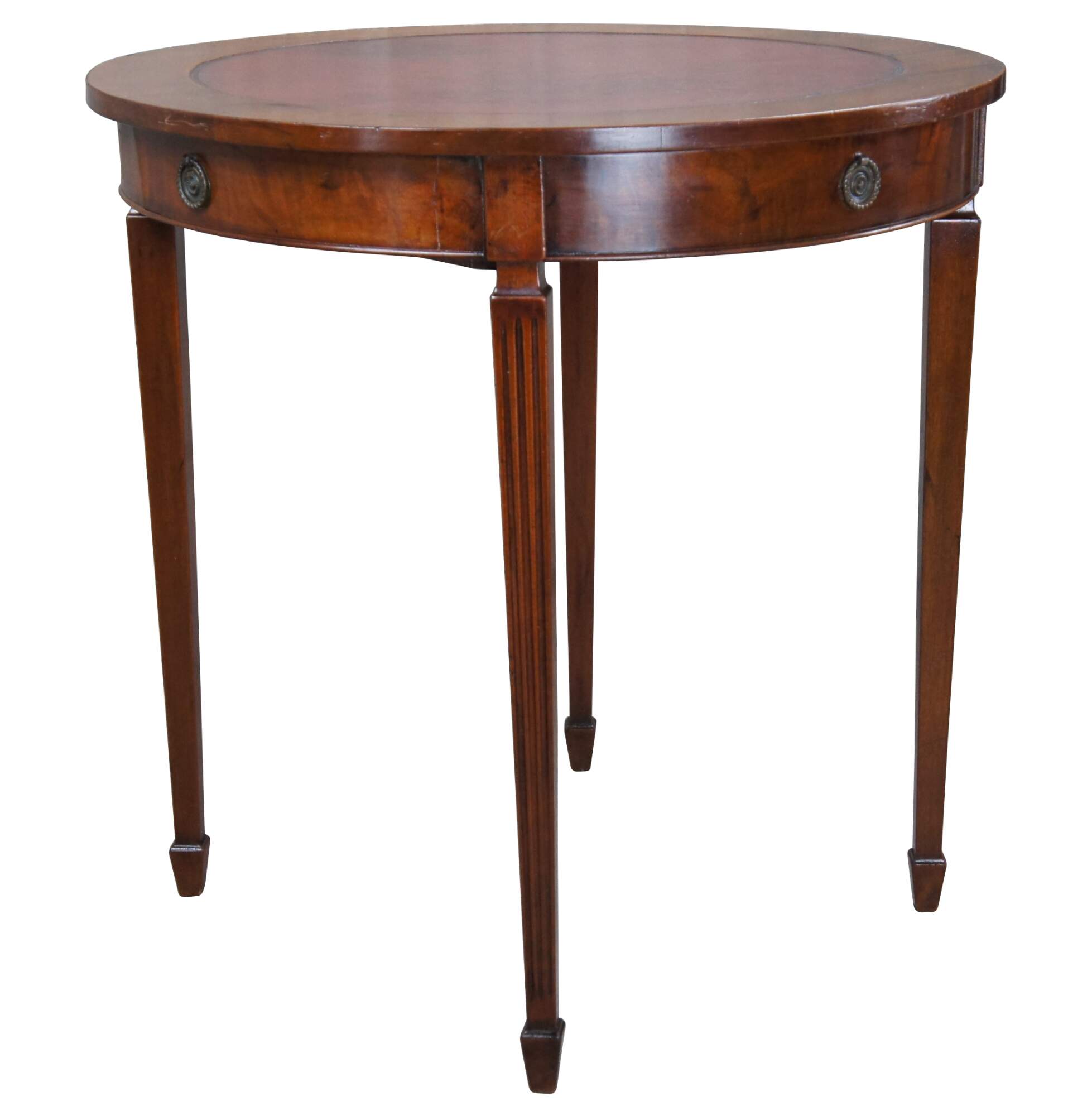 An antique Sheraton style table made by Charak for The H. & S. Pogue Company of Cincinati, circa 1936. Features a round form with inset red leather top over a flame mahogany frieze with dovetailed drawer and brass hardware. The table is supported by long square tapered and fluted legs leading to spade feet. Marked along underside.