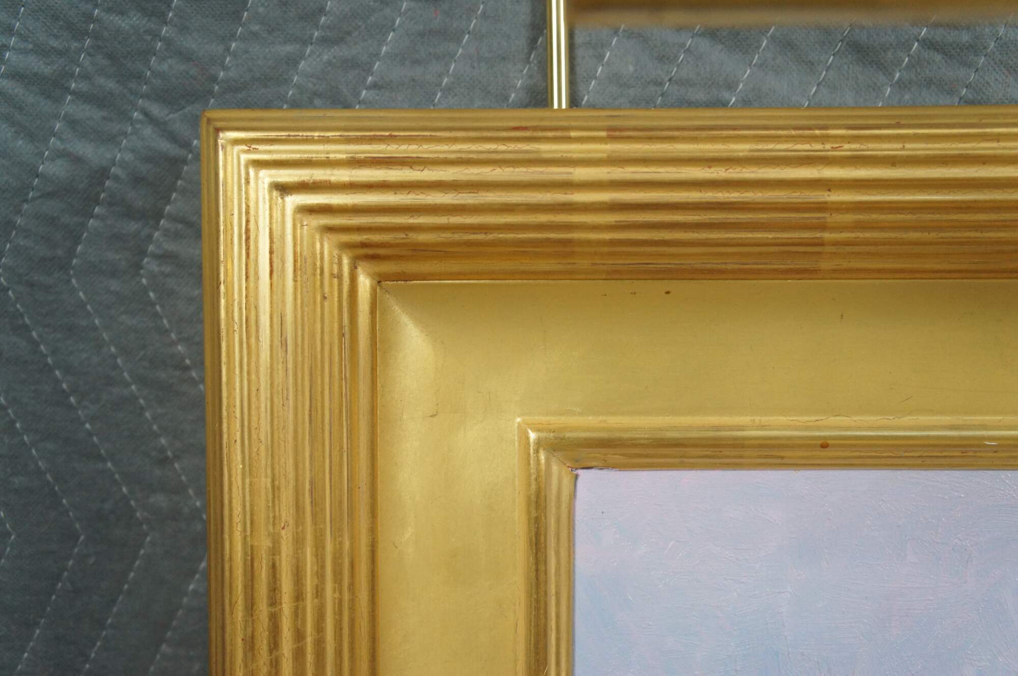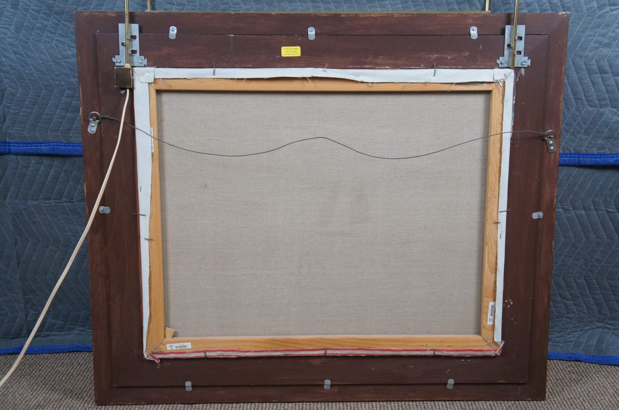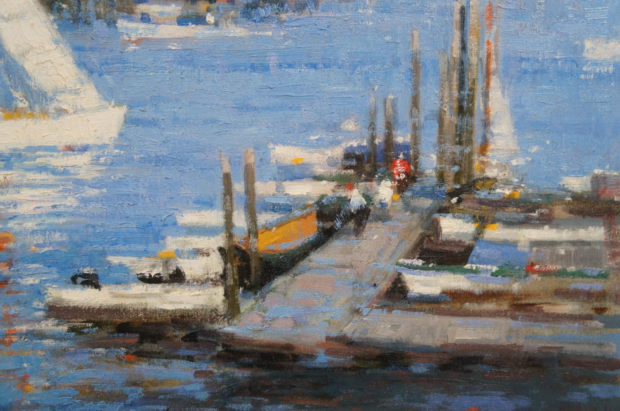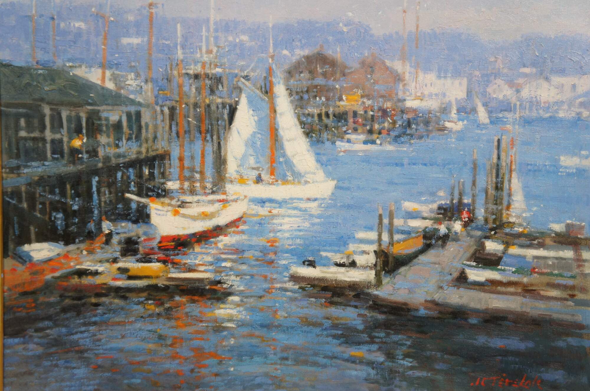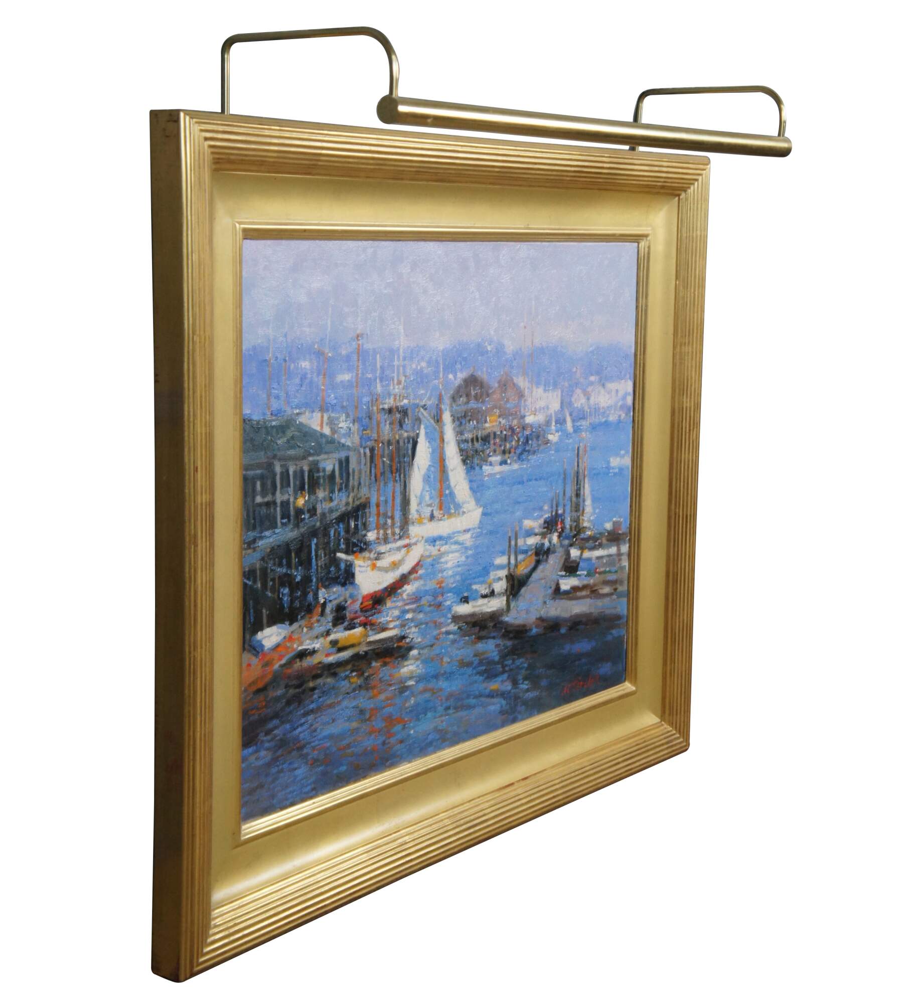 An impressive painting of Gloucester Harbor by John Terelak, signed lower right. Features a nautical harbor scene with sailboats docked and others floating in the distance. John's beautiful Impressionist style offers warming colors and magnificent depth. The canvas is signed along the lower right. Framed in wood with a gold finish. Includes brass light bar along the top.